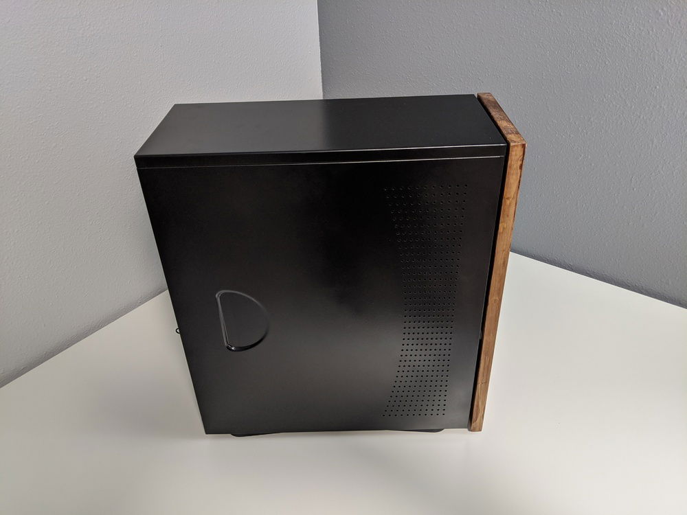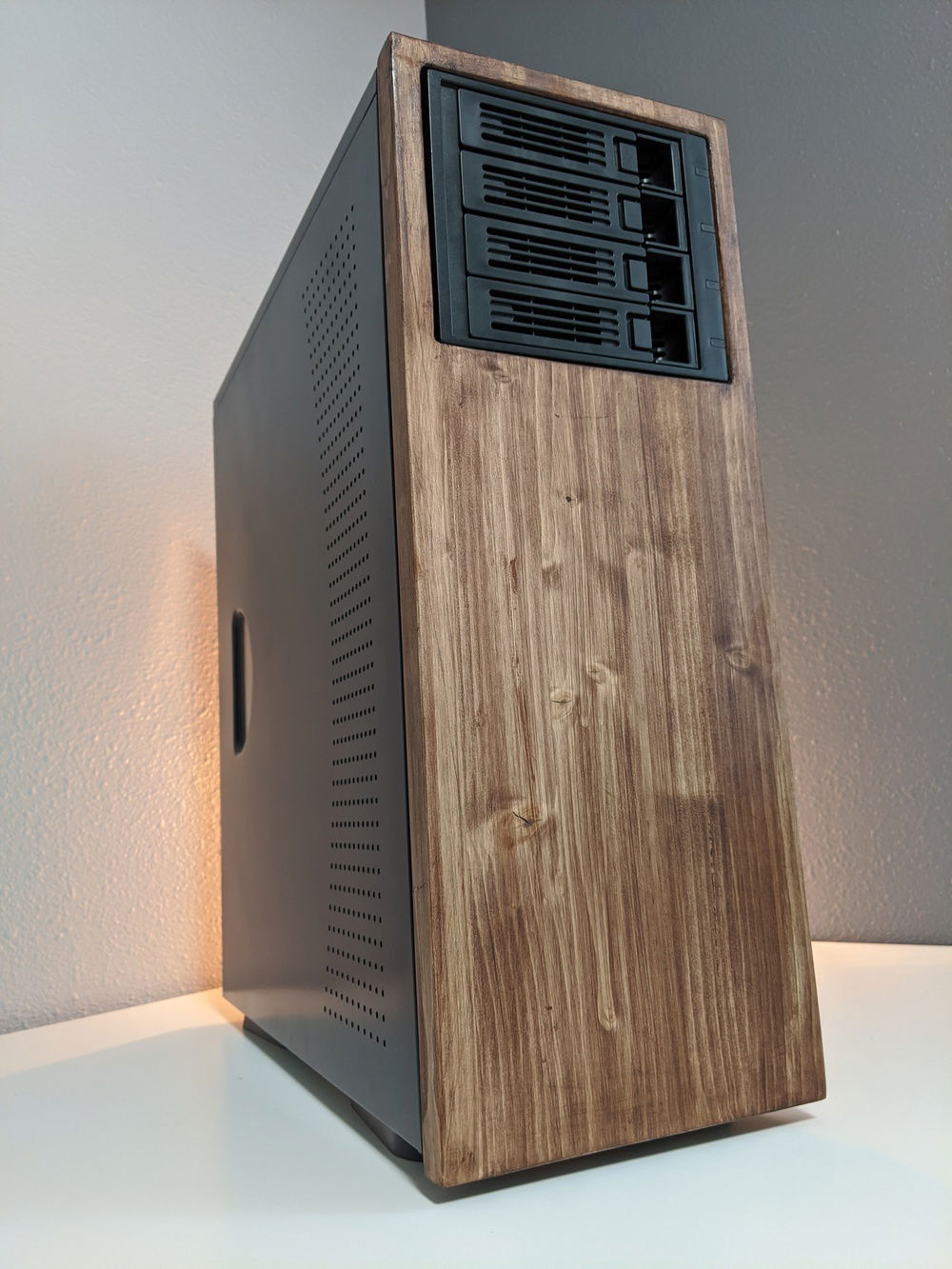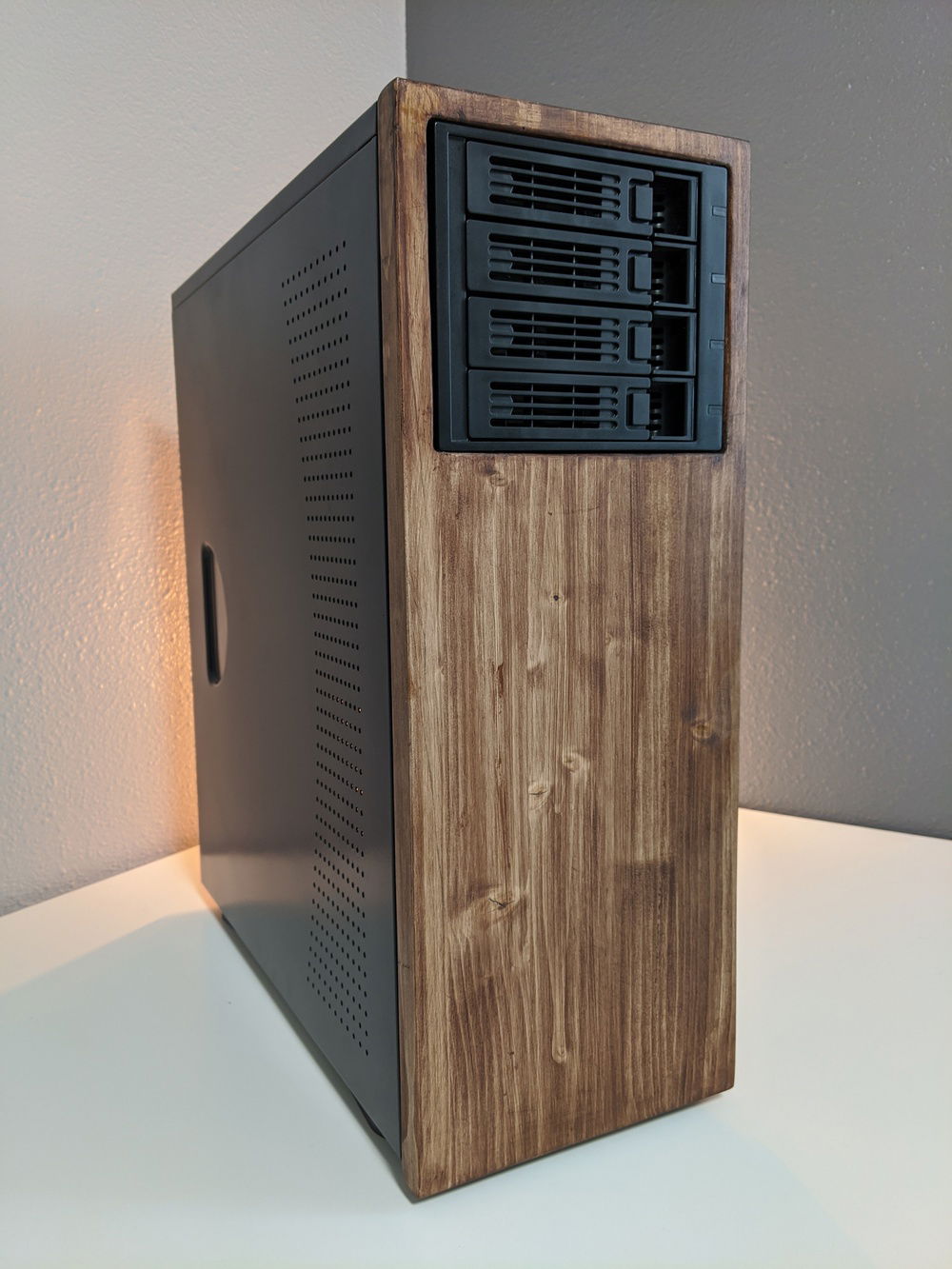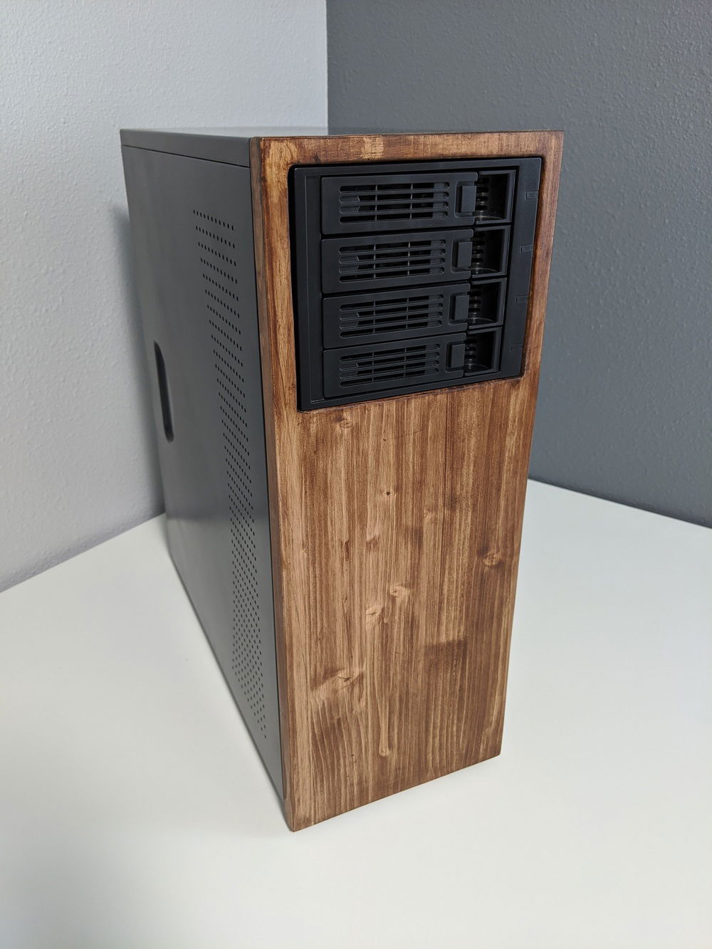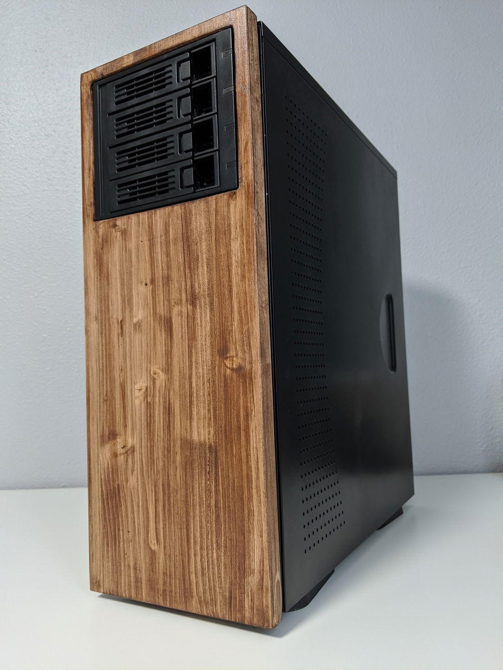 Used an old case and a 4 bay hot swap cage to build a new environment for my home server. Cut, sanded, and stained some wood to give the front a bit more personality and painted what used to be an old cream colored case black to be a little more modern. Always wanted to a wood front panel case and this turned out better than I thought it would. The power button is in the back and there isn't any front usb or audio, but I use it as a plex and file server so don't really need any of the front I/O. The front is panel is easily removable and there is a small gap for airflow (not ideal, but the hdd bay has a fan and at max load the CPU only gets about 55% C). As some point in the near future will upgrade to 4x4TB WD RED NAS drives but for now just using a mix of drives I had.
