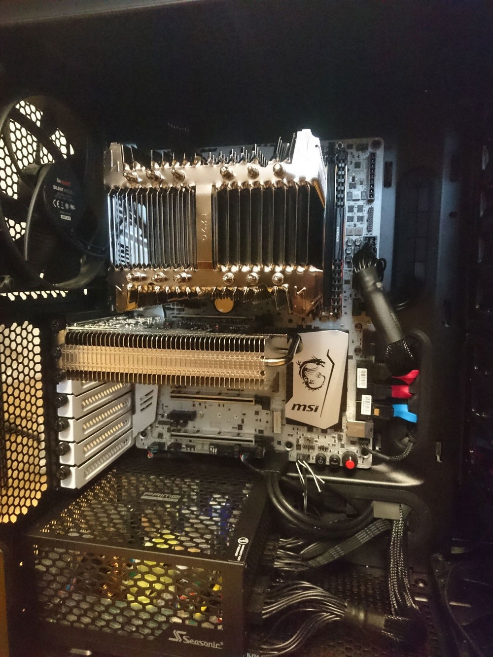 HTPC designed to house my hard drives and be as silent as possible. Will be housed in the living room, right next to the 4K TV I intend to play my ripped full blurays, and dvd and access Netflix in 4K. Fans are set at the lowest DC possible without damaging them. They are placed : 1 front, 1 bottom, & 1 back to go for a positive pressure environment to prevent dust intake as much as possible ( since, the computer will be on the hardwood floor directly). When playing a huge 4K video file, the CPU runs at around 43°C, the GPU at 59°C. THE CPU, GPU and PSU are using passive cooling.