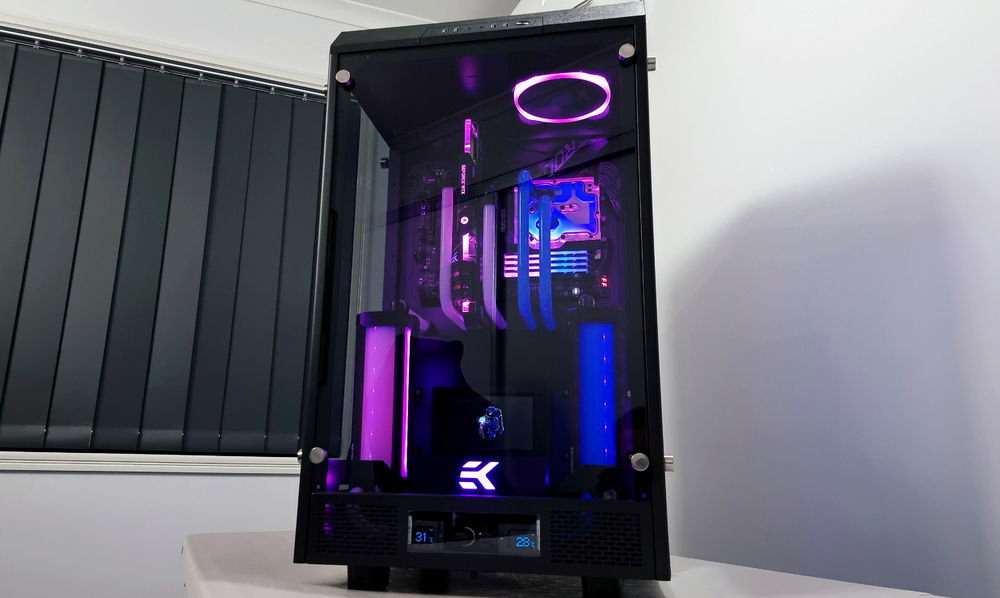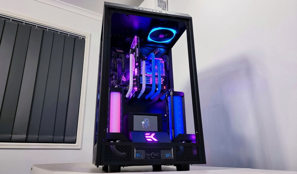 Custom Parts: Custom Distro Plate, Custom case centre console, custom screen, custom EKWB RGB Logo, custom water temp meters mount and front window.