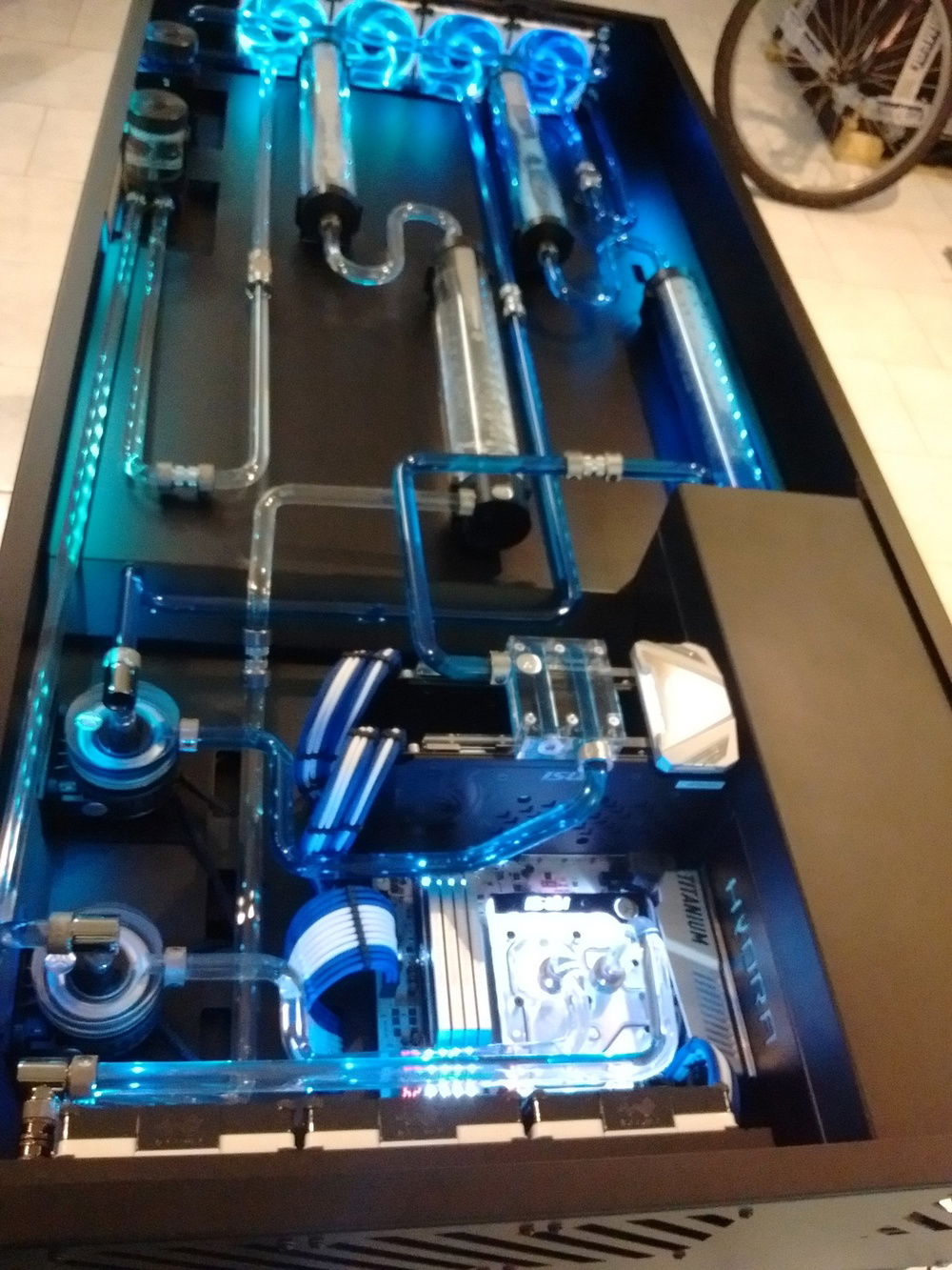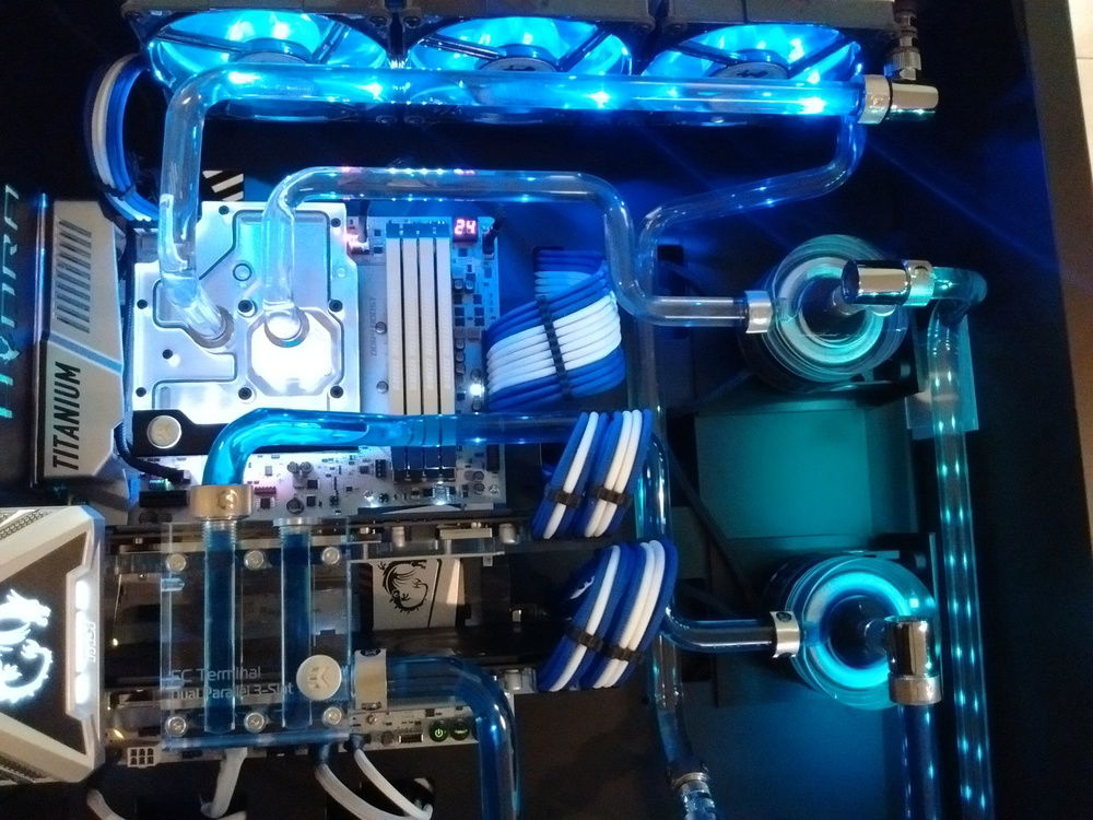 Hydra desk with dual loop liquid cooling, rigid tubing and ekwb hardware, AMD Ryzen and Nvidia SLI.