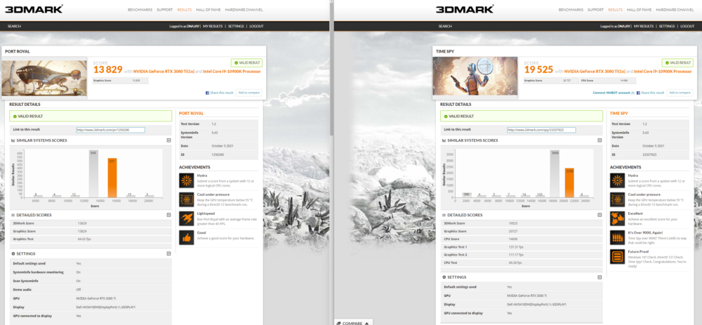 Performance-wise, it's looking great. The GPU idles around 28C in a 25C room, and doesn't really break a sweat underload. Timespy hit 51C max. CPU is overclocked to 5.1ghz at 1.305V. Keeping in mind that 10900K is a heat monster to begin with, the CPU idles around 36C, and loads average in the mid-60Cs in games, and low 80Cs in Cinabench R23.