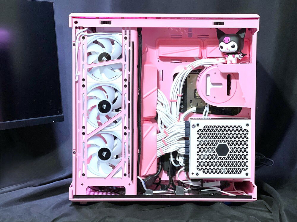 The case has a TON of custom work. I made the sleeved PSU cables, and painted the cable combs to match the case. I added pink and purple accents to multiple parts (case, motherboard, AIO tube clamps). The pink skulls (from Kuromi's hat) are painted onto the GPU fans. The fan covers are from Sakurai Armory; they do really nice 3D prints.