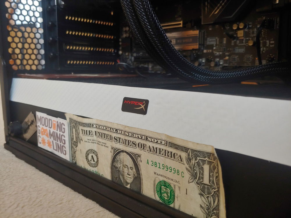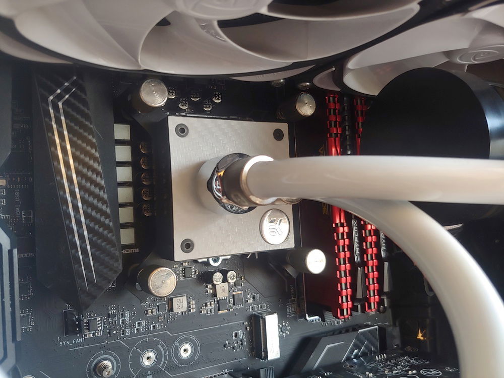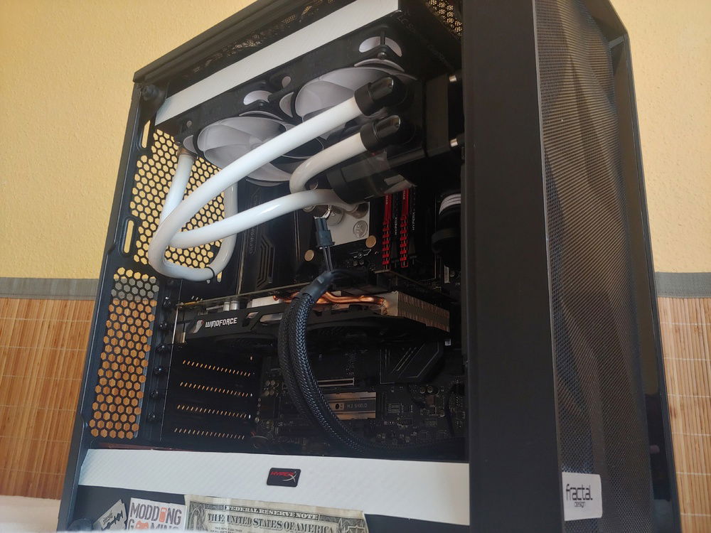 It's messy because the layout isn't permanent. I accidentally killed my 980, now using my brother's 960 until AIB 5700s arrive. White accents are done with carbon fiber vinyl wrap on the cpu block, radiator and case. The skyrim plaque is hand-made.