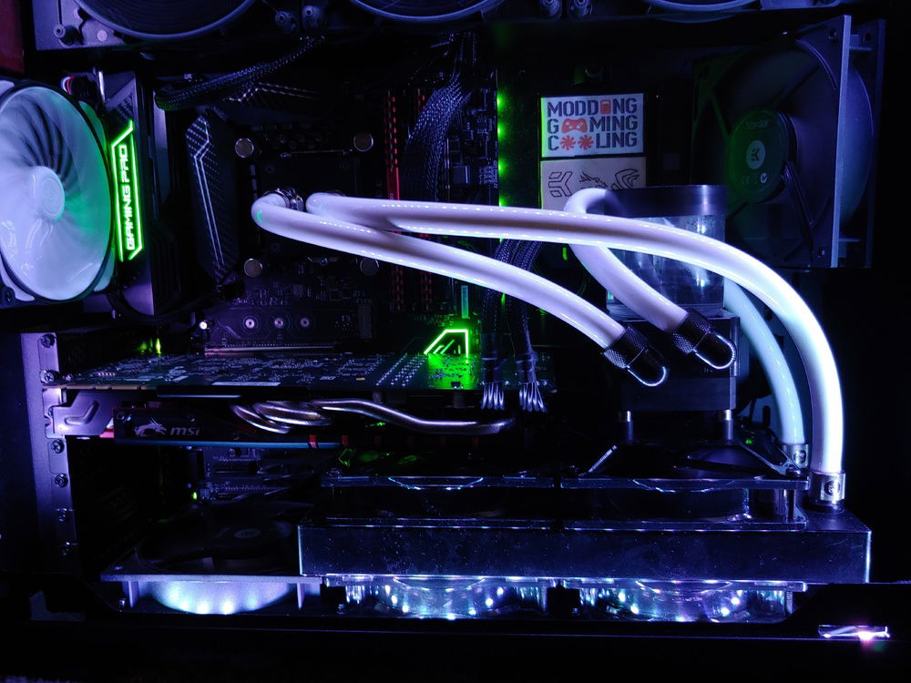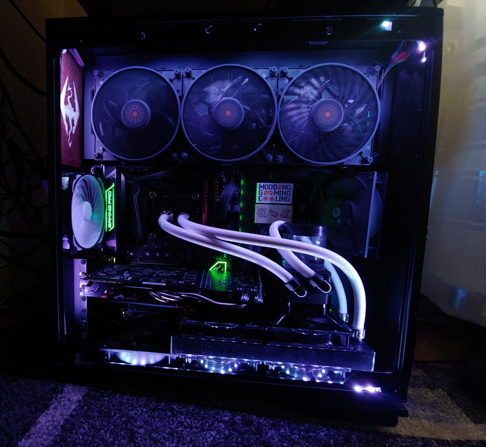 It was difficult to create optimal airflow in the 303, but it's fine now. The PSU was shutting off due to overheating, the gpu was getting warmer by every minute and the exhausted air wasn't warm at all. Fixed by turning the psu outwards and adding a fan near the SSDs utilizing the "GPU holder" provided with the case. There are 3 140mm be quiet fans in the top, but they are practically useless, because the back of the case is too restrictive. I stick all kinds of things on the front of the case since it is boring 90% black. A dbrand artwork, a floppy disc and the stickers from my laptop and monitor. 2 metres of RGB strips are controlled by the mobo. I made 2 wooden plaques, which are above the rear fan and on the unused ssd tray. One with the skyrim emblem, burned lines and red woodstain, the other with a few logos burnt into the wood. I have a pair of Hyperx Savage DIMMs, but they seem to be EOL. I added white tubes and 2 black Alphacool 90 degree fittings to the watercooling loop. The 240mm rad is in push-pull between 4 Bitfenix Spectre LEDs. The CPU has Thermalgrizzly Conductonaut under the IHS and EKWB Ectotherm on it. The fluid is ionized water with some dish soap. 7700k - 5.0ghz - <70C ram - 3000mhz - CL16 - 16GB - 4 DIMM 980 - 1450mhz core - <66C