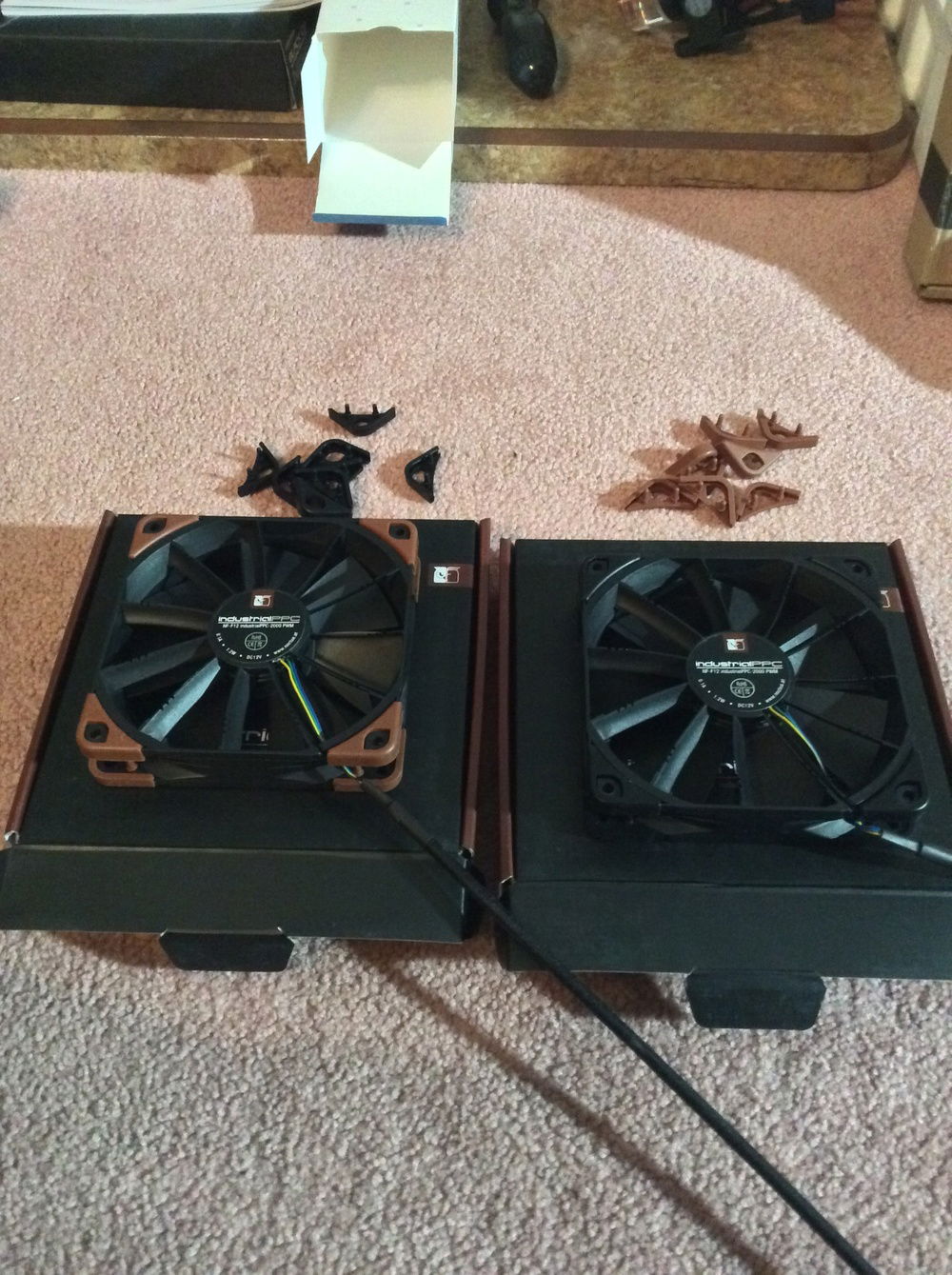 Front fans are intake and exhaust on the top. At idle fan speed is about 750. They are very quiet, but still audible when sitting next to them. I still have testing to do but I want to set up a proper fan curve where the fans are barely spinning when idle, and ramp up when needed.