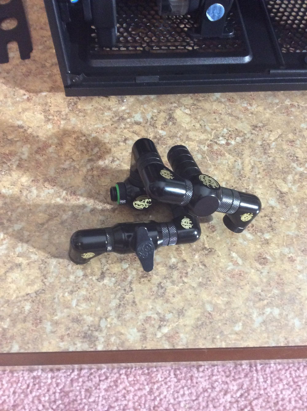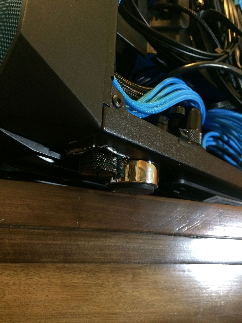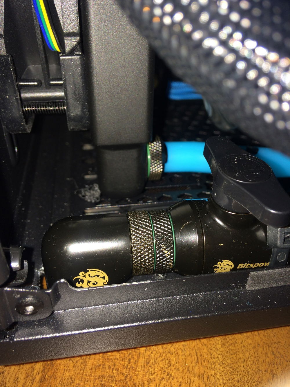 The toughest connection was the pump outlet to the front rad. In the small distance I had to include my drain valve. I was originally going to join it all together with only fittings. It took me 2 tries to line it all up before I realized it was close to impossible to create a fixed solid link between 2 parts. I added in 2 short runs to connect it all together, with the drain going straight out the bottom of the case (had to cut a hole).