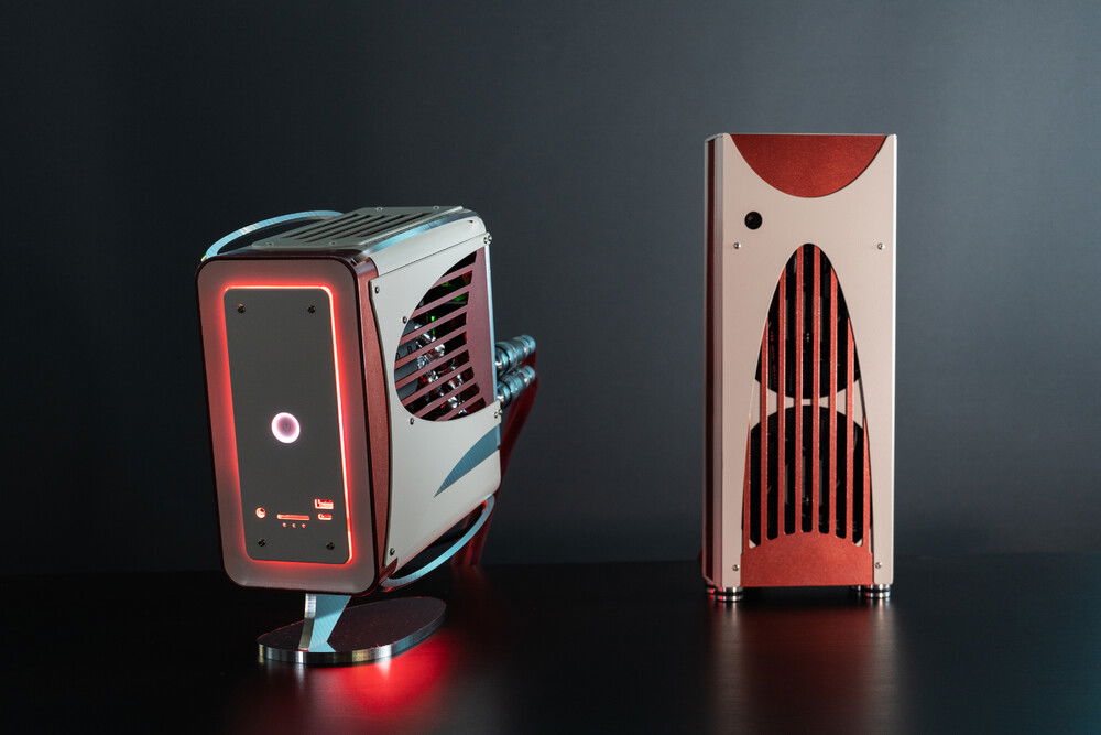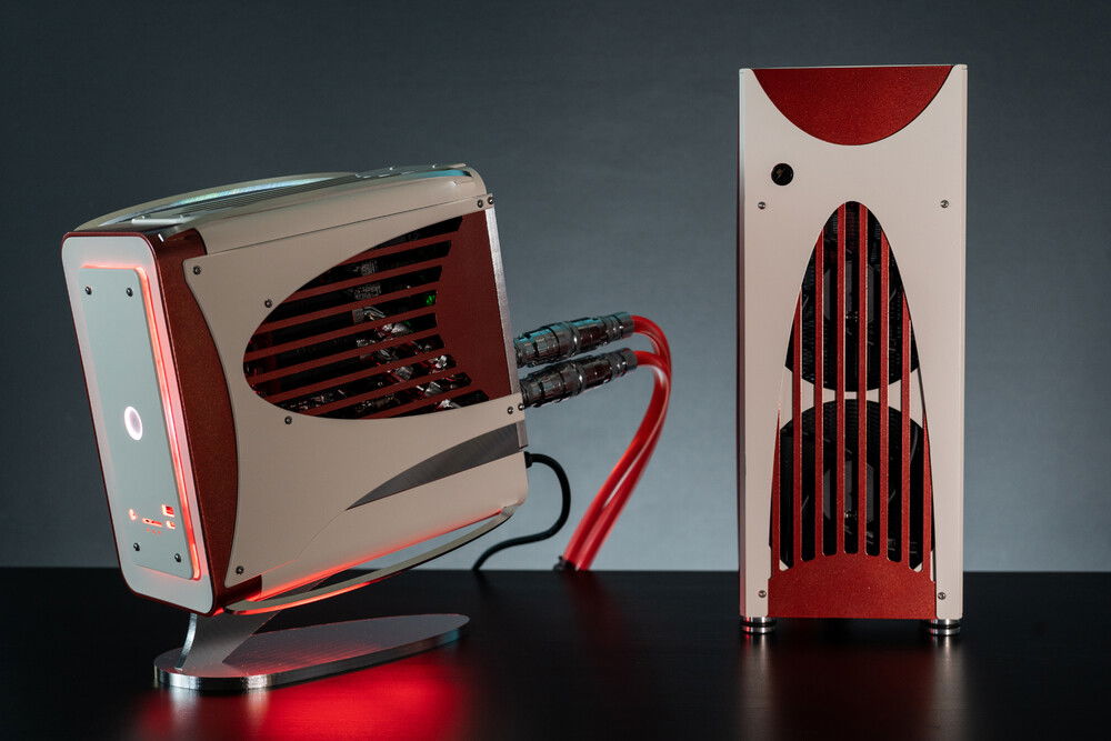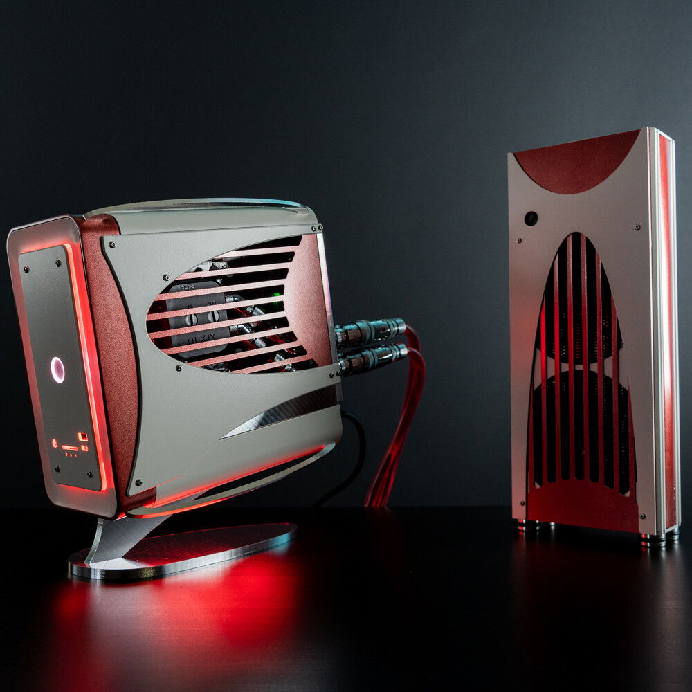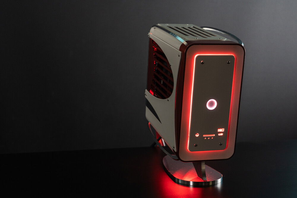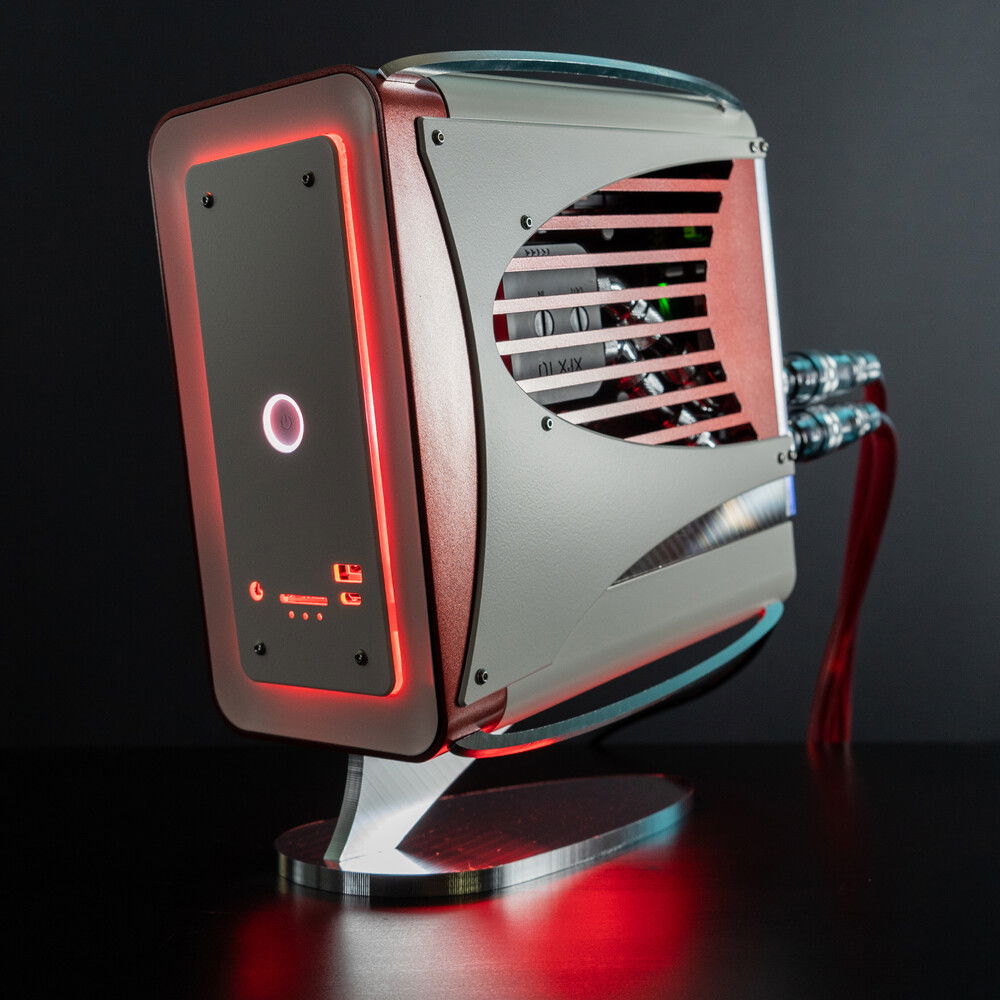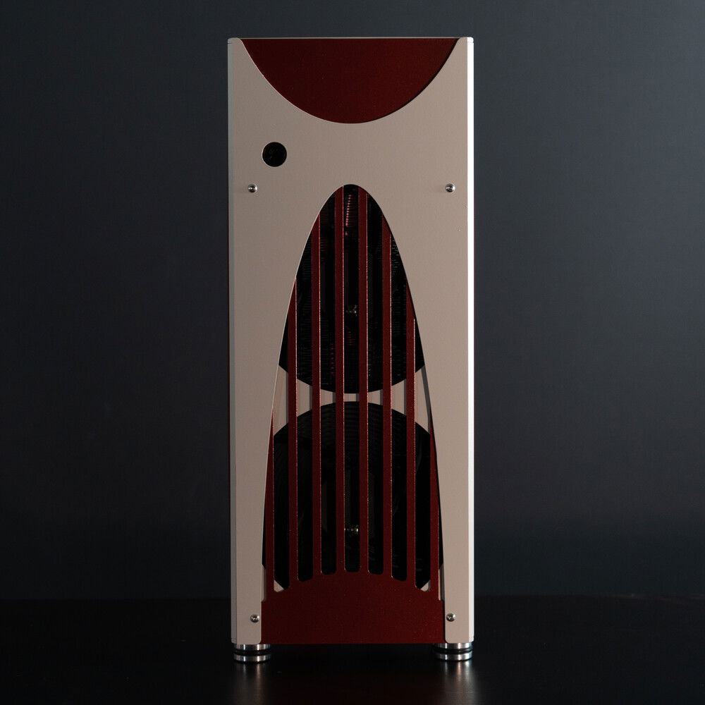 Icarus-1 is what's born from my vision this time, taking inspiration from 50s automotive and retro Sci-Fi design. It features full custom aluminum panelling, built-in support for external watercooling, RGB lights on the front and bottom for a nice and warm underglow. The aluminum pedestal makes the case float and sit at a 10-degree tilt.