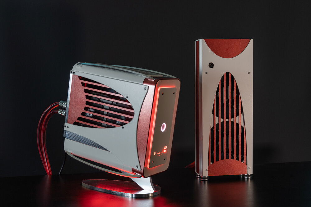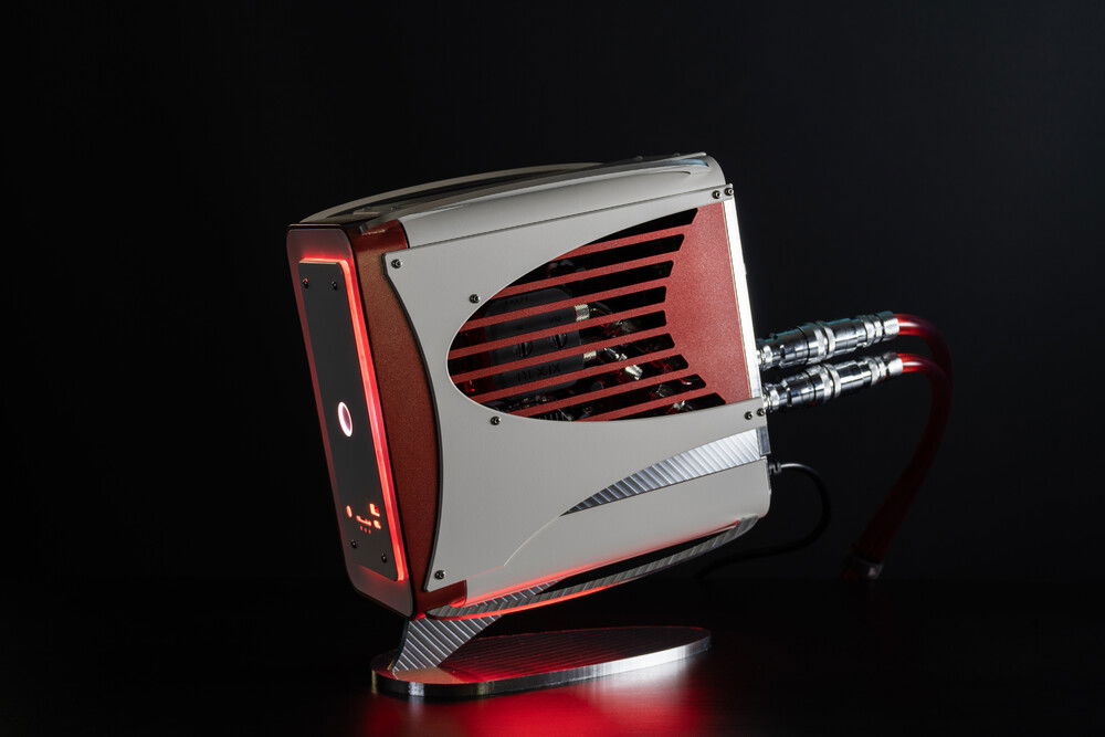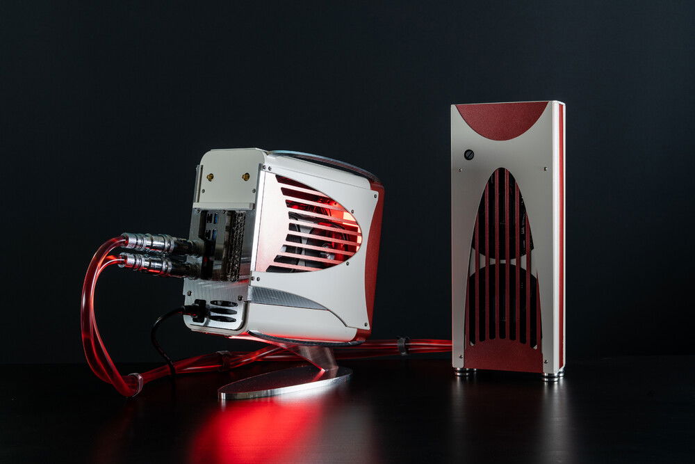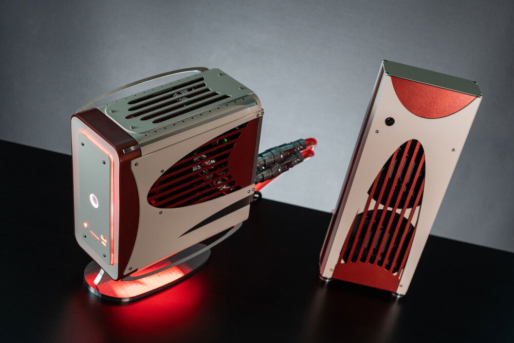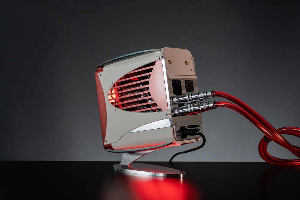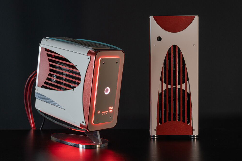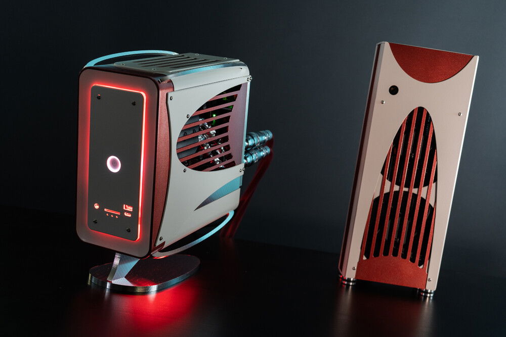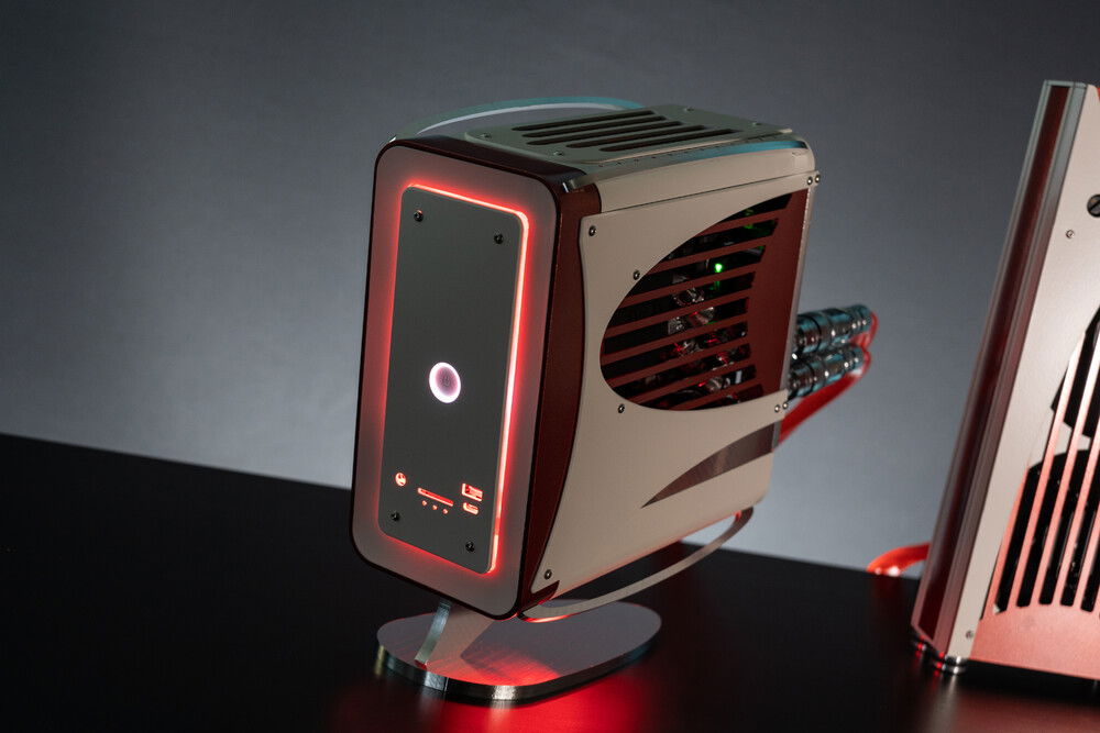 Icarus-1 is what's born from my vision this time, taking inspiration from 50s automotive and retro Sci-Fi design. It features full custom aluminum panelling, built-in support for external watercooling, RGB lights on the front and bottom for a nice and warm underglow. The aluminum pedestal makes the case float and sit at a 10-degree tilt.