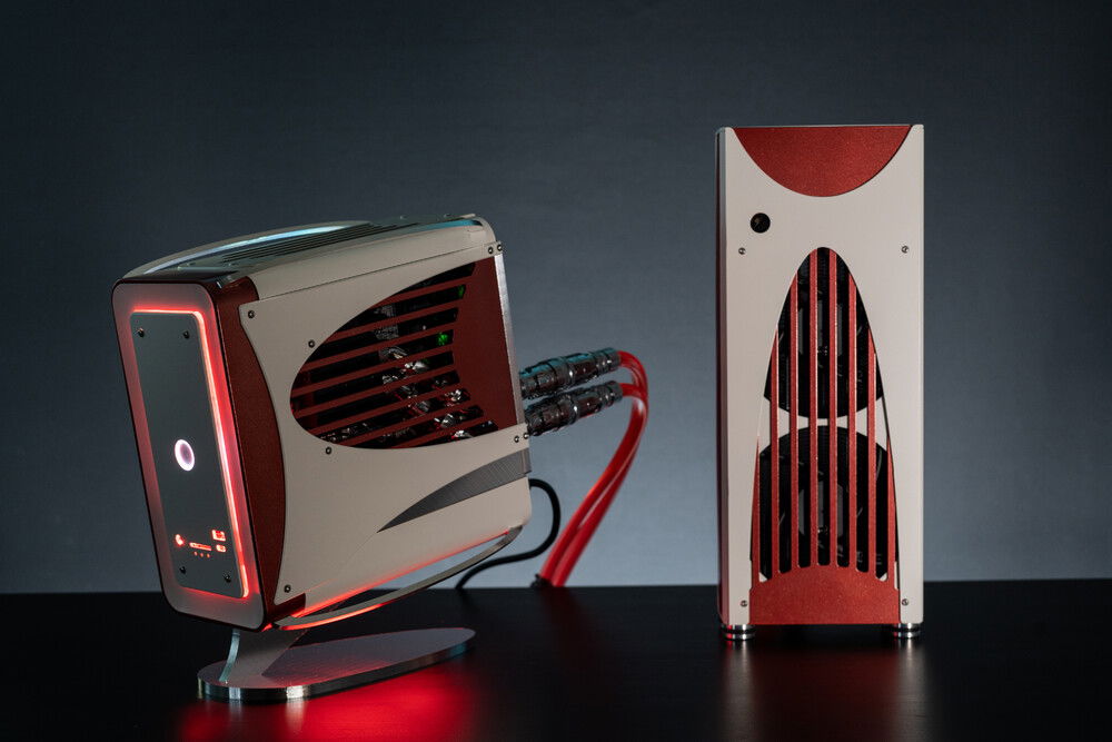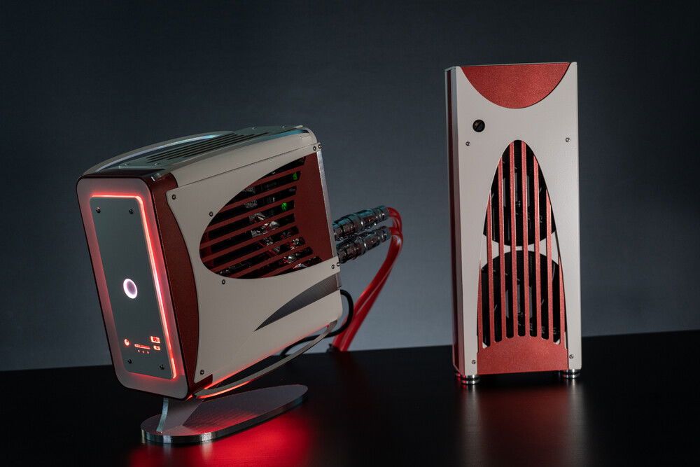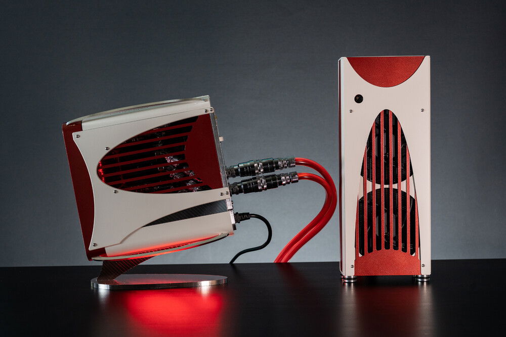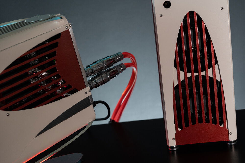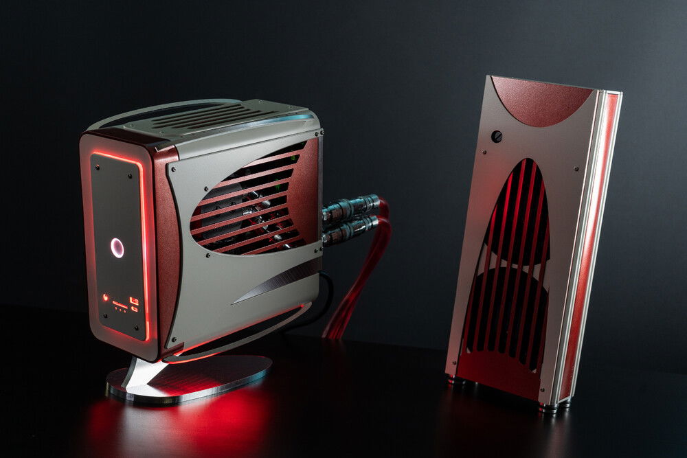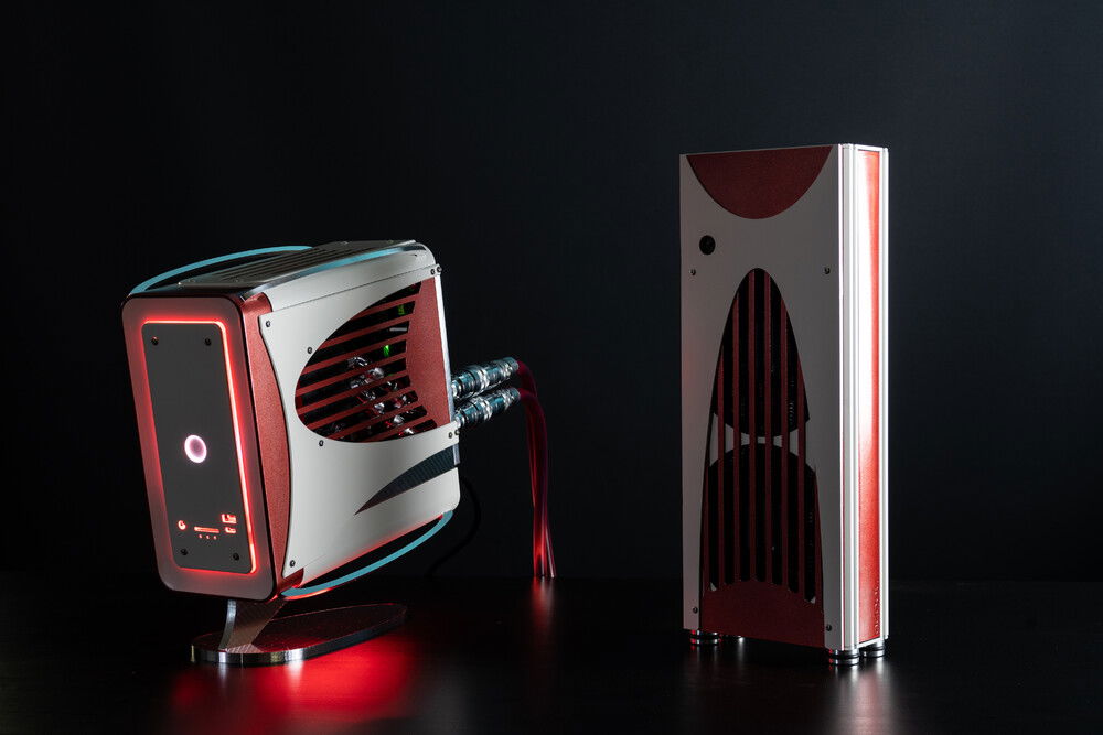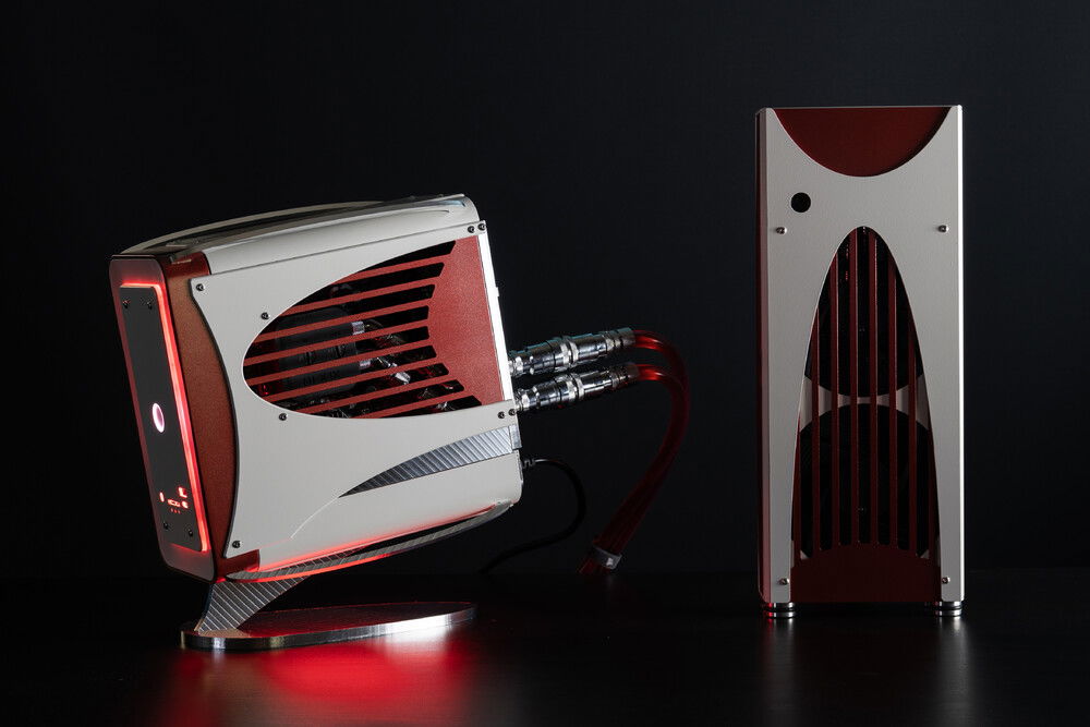 Icarus-1 is what's born from my vision this time, taking inspiration from 50s automotive and retro Sci-Fi design. It features full custom aluminum panelling, built-in support for external watercooling, RGB lights on the front and bottom for a nice and warm underglow. The aluminum pedestal makes the case float and sit at a 10-degree tilt.