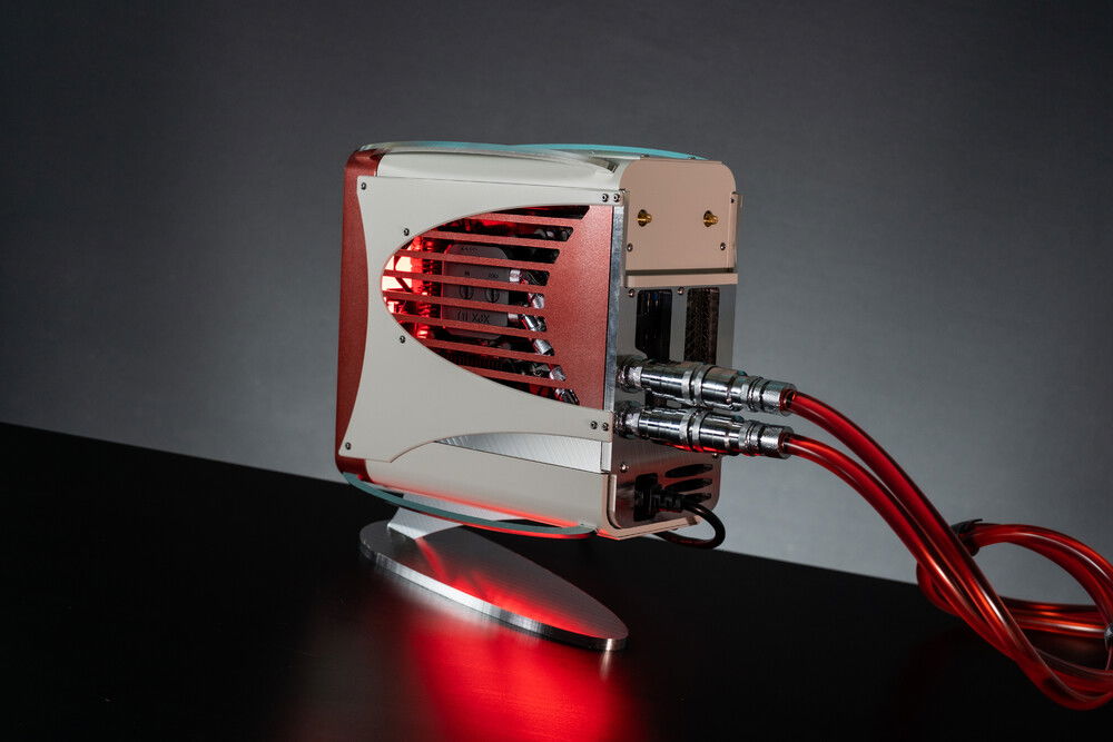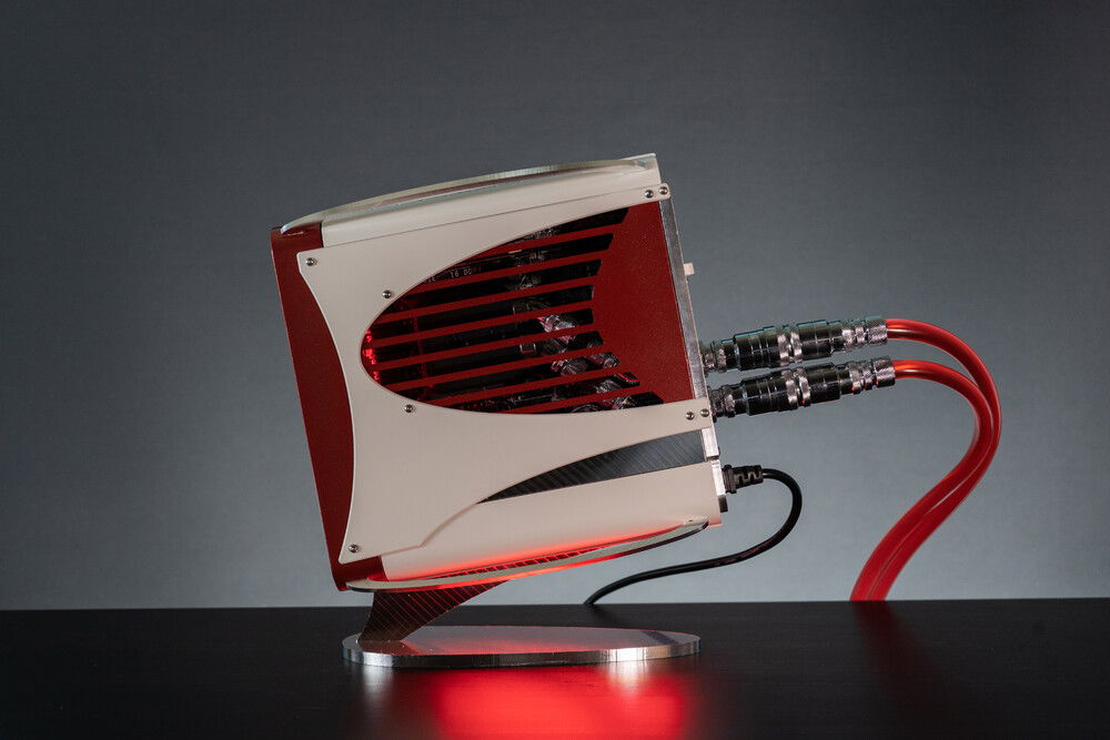 The external watercooling station is an Alphacool Eisbaer Extreme Core 280, modded to fit theme.