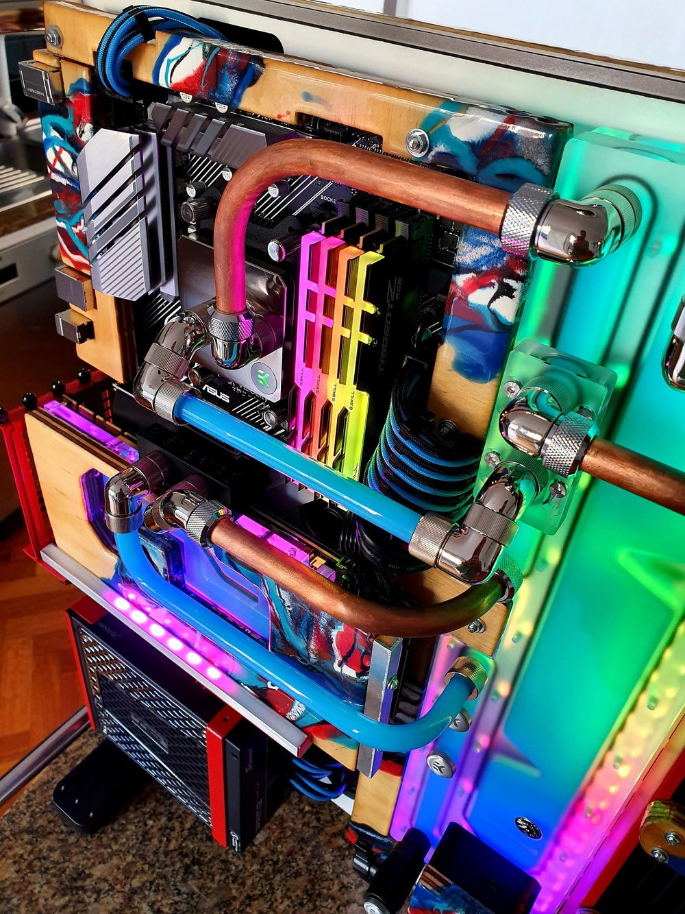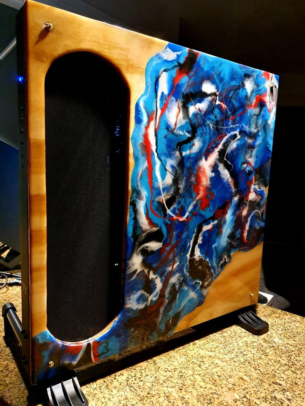 Open cases need excellent cable management to look clean. I already had blue/black cables from my previous build that I would use. I built a wooden bracket to hide the cables and rubber grommets/passthroughs and disguised them with resin to go with what I had in mind for the back cover.