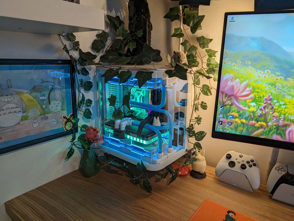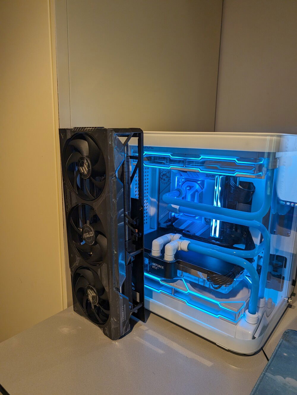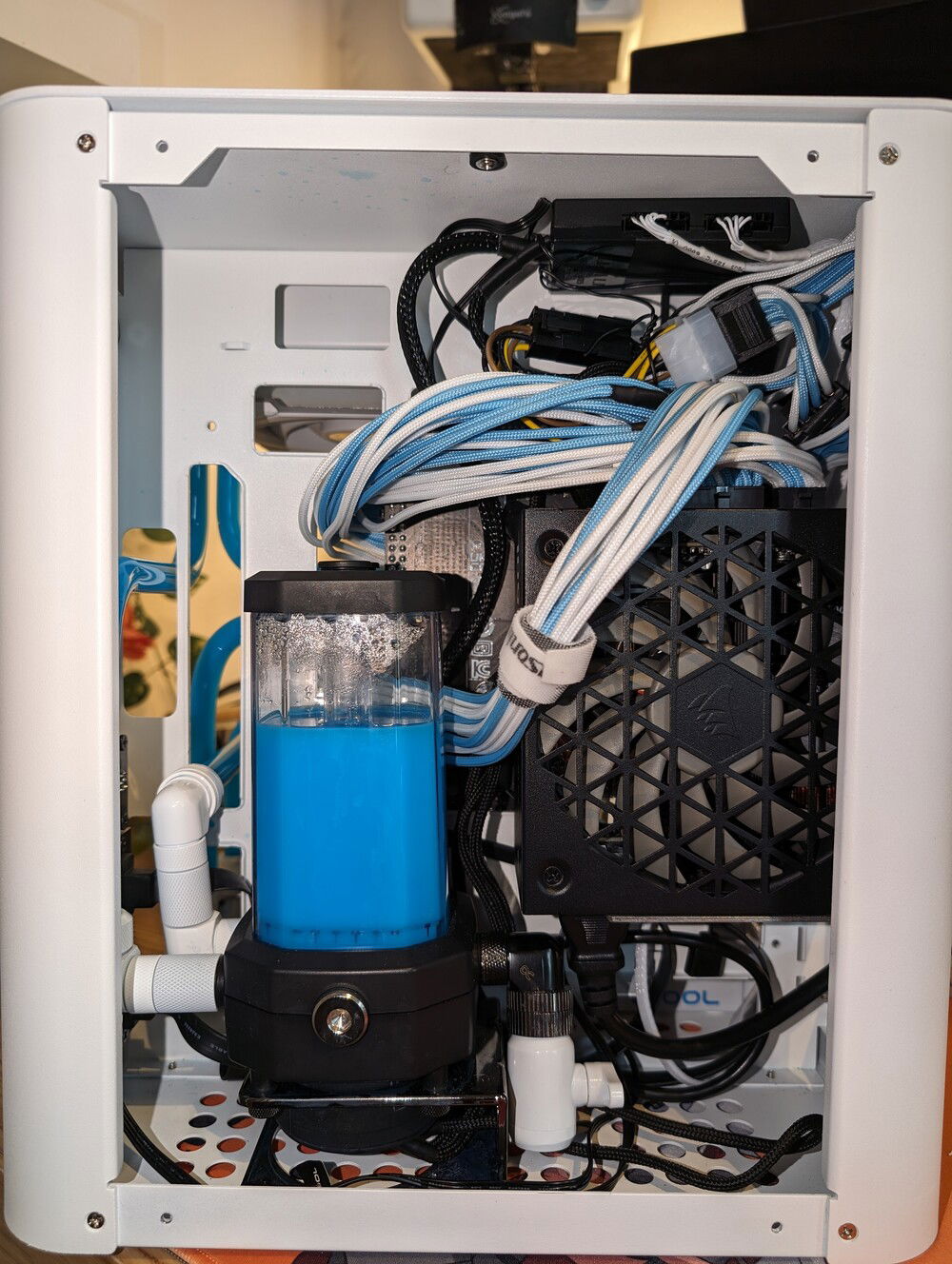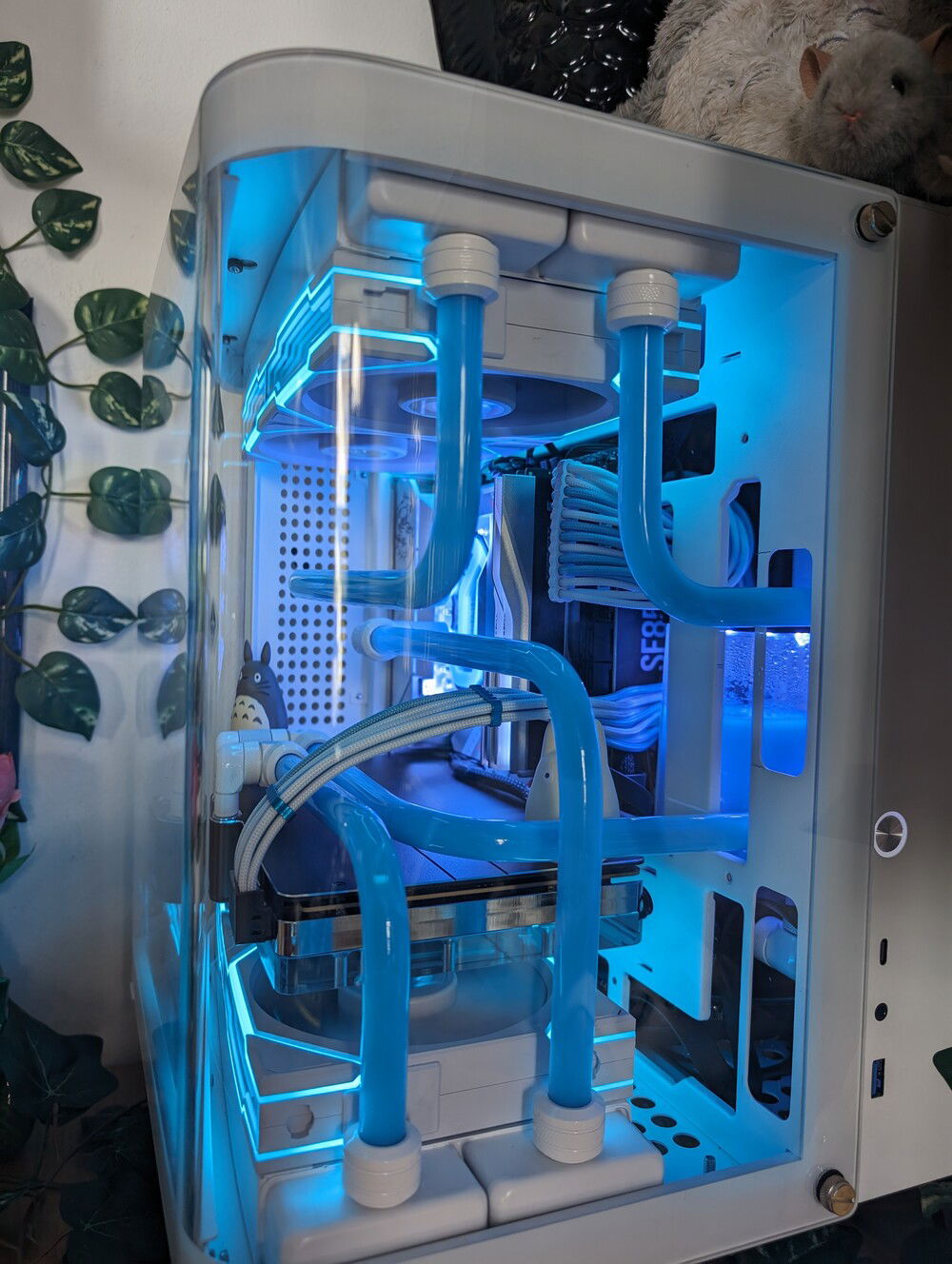 This system is cooled with two 240mm, 30mm thick full copper radiators from Alphacool. It also features an Alphacool GPU block and 13/10mm hard tubing. A Corsair pump/reservoir combo is mounted in the rear chamber.