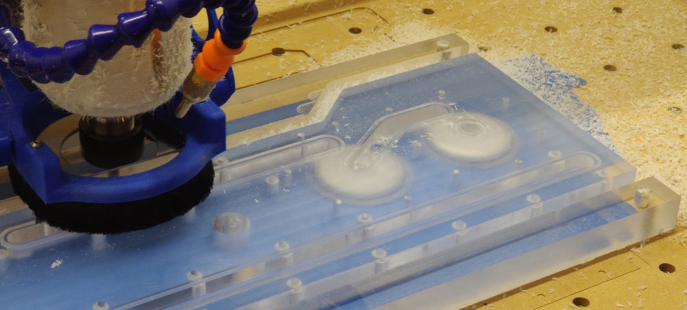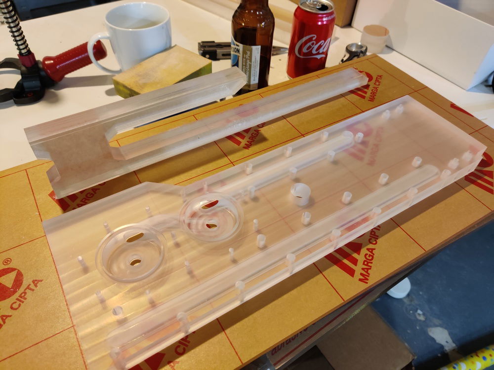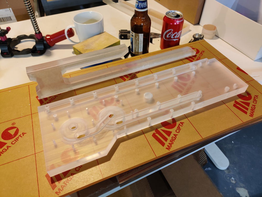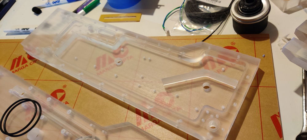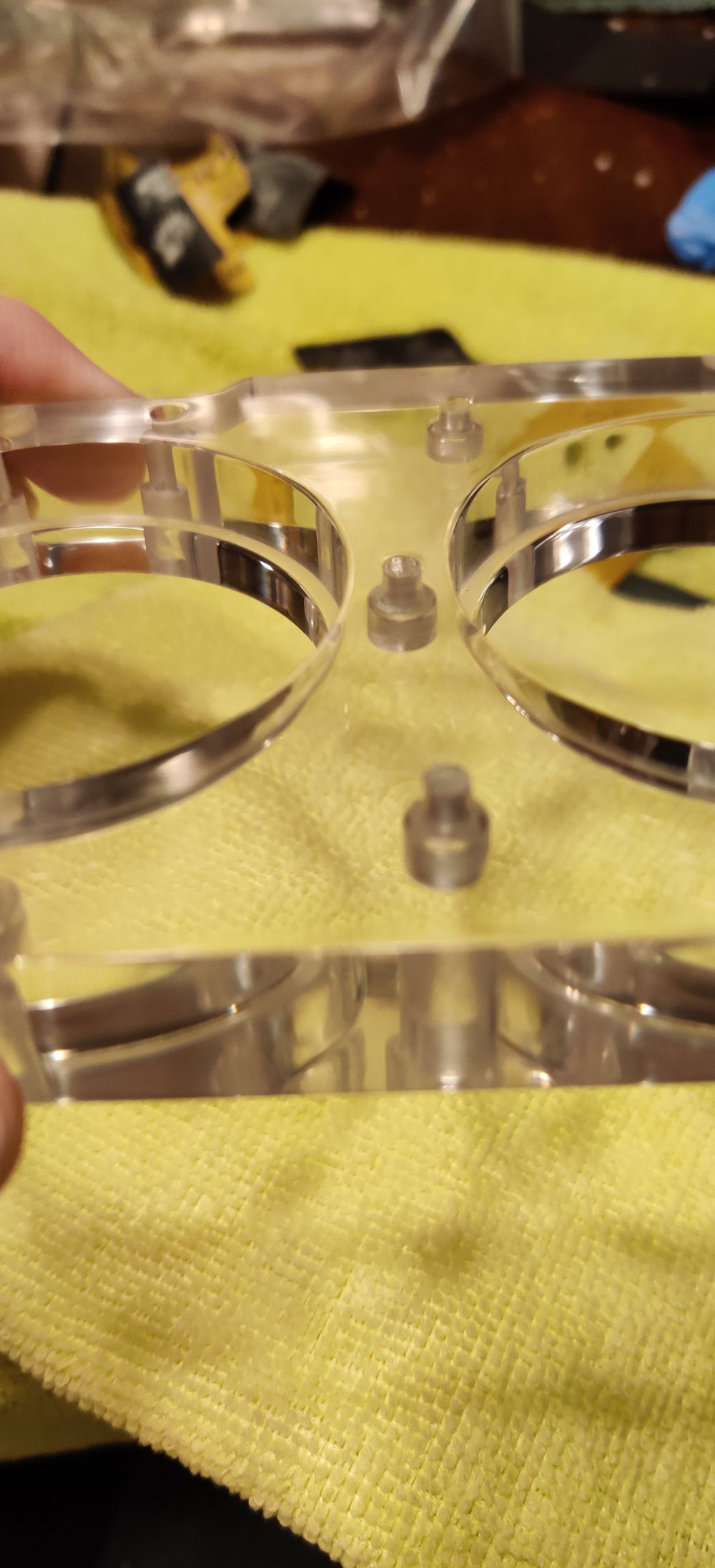 Well after the test run and seeing the software for the CNC machine handled everything fine I decided to throw on of the giant slabs of 1" acrylic on the machine and let it go at it. Everything went well for the most part, had to flip the part over to mill the other sad and that is where things went slightly array. I didn't remember to account for the fact that I took off almost a 1mm from the other side when I surfaced it, so I didn't need to re-run the oring channels as they are only .04mm out of spec. Overall I'm damn happy with how it came out! The fillet along the dual pump cavities is smooth and amazing, and the ramp from pump 1 outlet into pump 2 outlet came out amazing! Now the question is do I polish these or do I leave them with the machine marks. Kinda like the look of the machined marks right now.