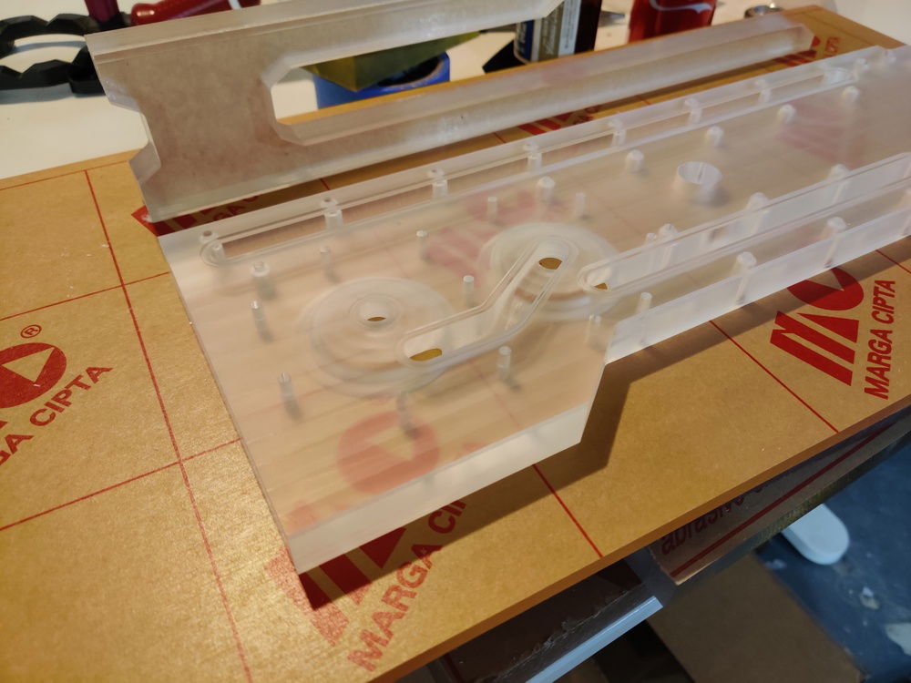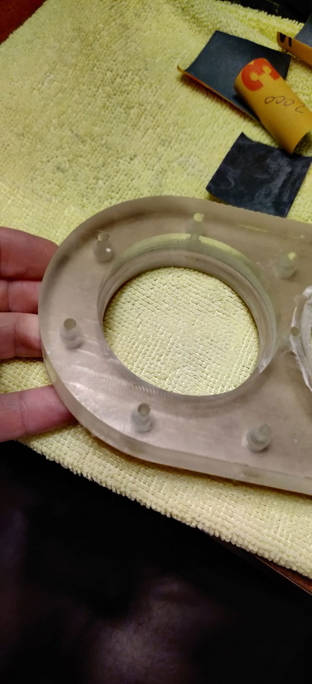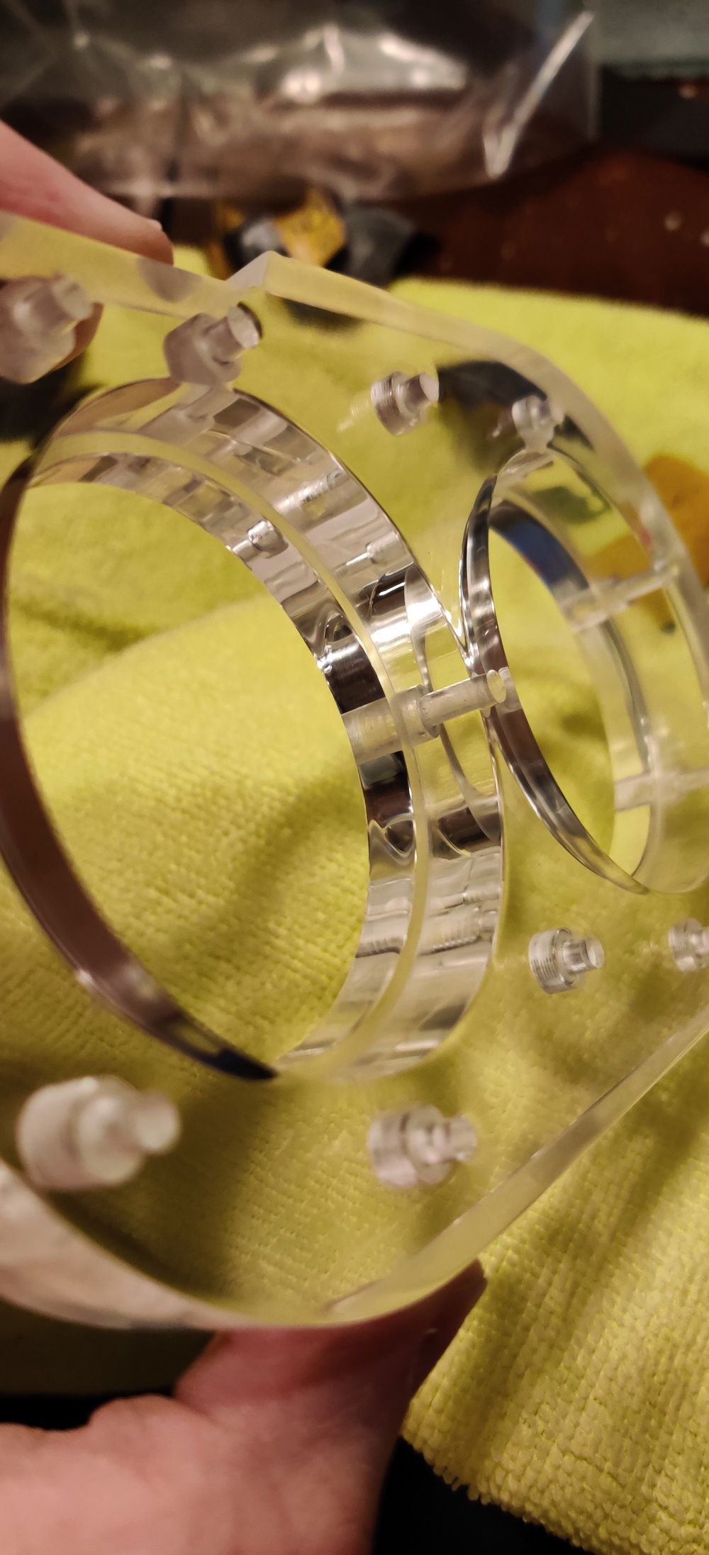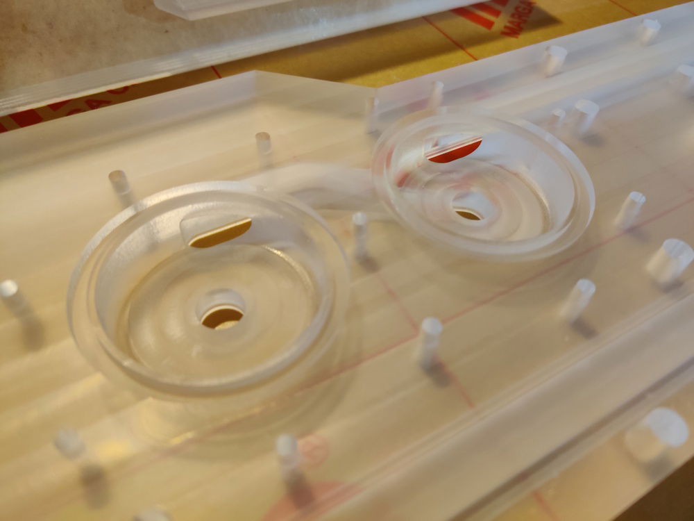Well after the test run and seeing the software for the CNC machine handled everything fine I decided to throw on of the giant slabs of 1" acrylic on the machine and let it go at it. Everything went well for the most part, had to flip the part over to mill the other sad and that is where things went slightly array. I didn't remember to account for the fact that I took off almost a 1mm from the other side when I surfaced it, so I didn't need to re-run the oring channels as they are only .04mm out of spec. Overall I'm damn happy with how it came out! The fillet along the dual pump cavities is smooth and amazing, and the ramp from pump 1 outlet into pump 2 outlet came out amazing! Now the question is do I polish these or do I leave them with the machine marks. Kinda like the look of the machined marks right now.