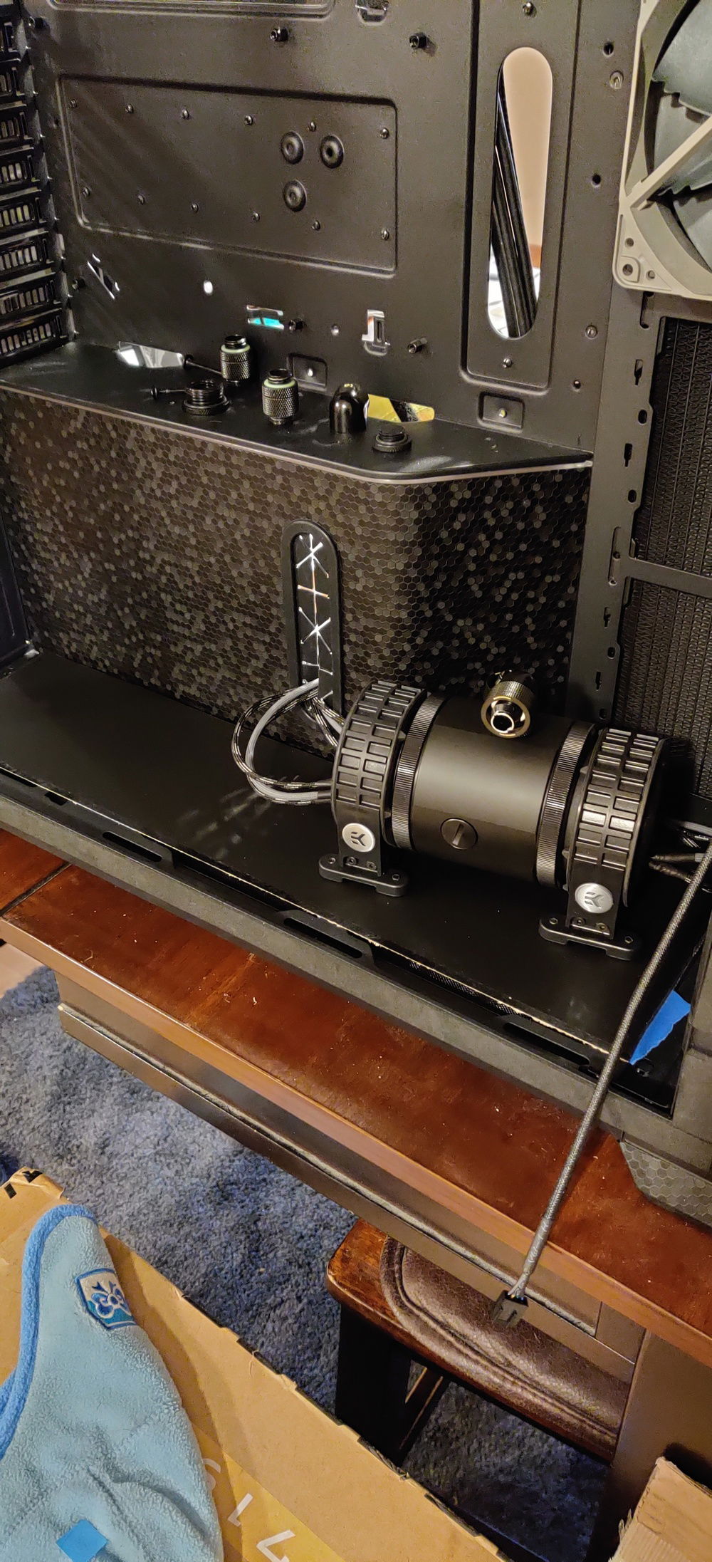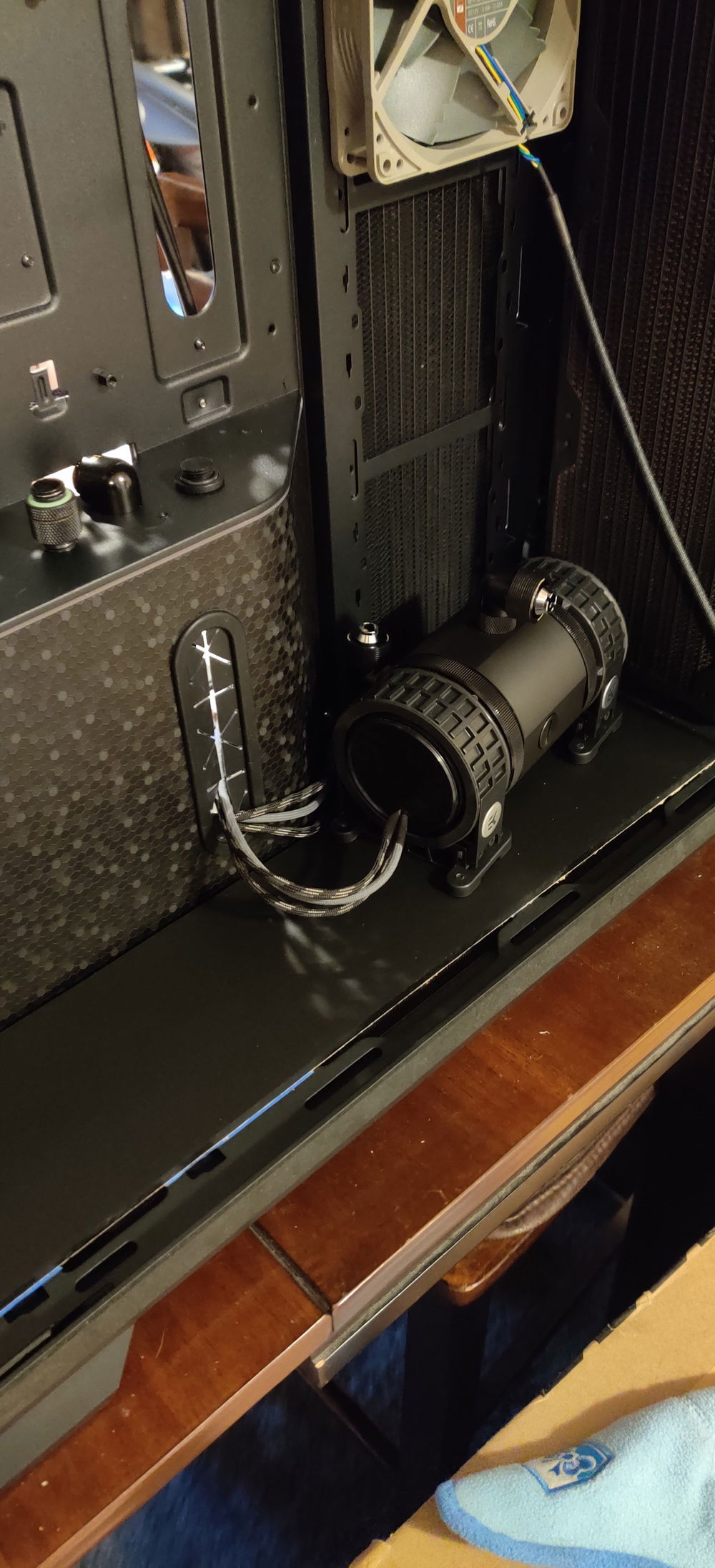 Able to get some work done on this due to working from home and social distancing. Get the new distro plate cut out and tested, no leaking this time around. Hopefully when I cleaned it out and bolted it back together it doesn't leak the second time ;) Got the bottom panel created and mounted along with the pump. Sleeved some of the cables this weekend as well. Glad I bought mine from Ensourced as the six I did was more than enough to learn I didn't wanna do a whole PSU.