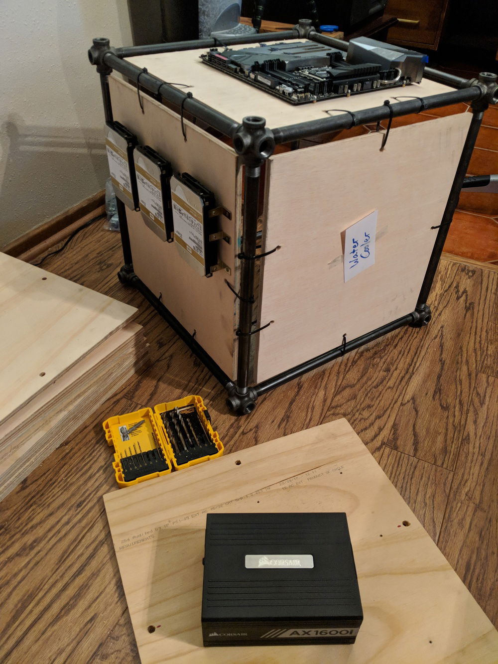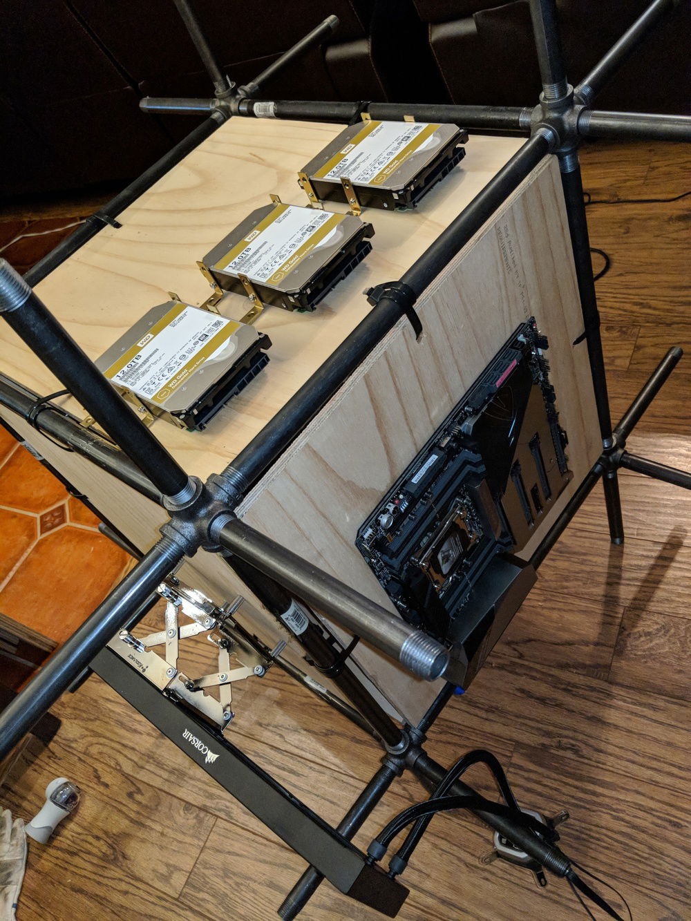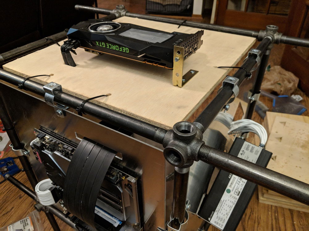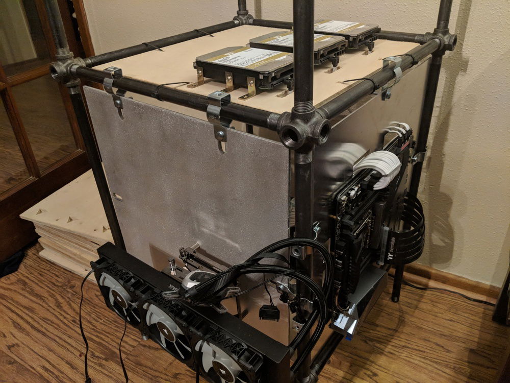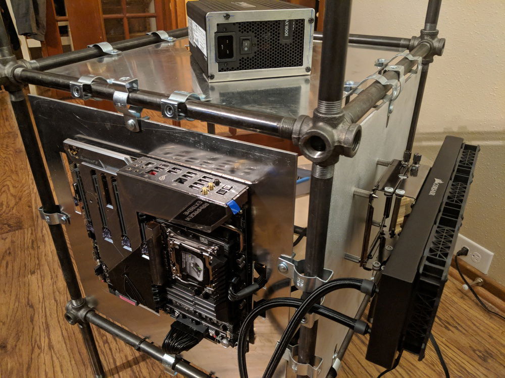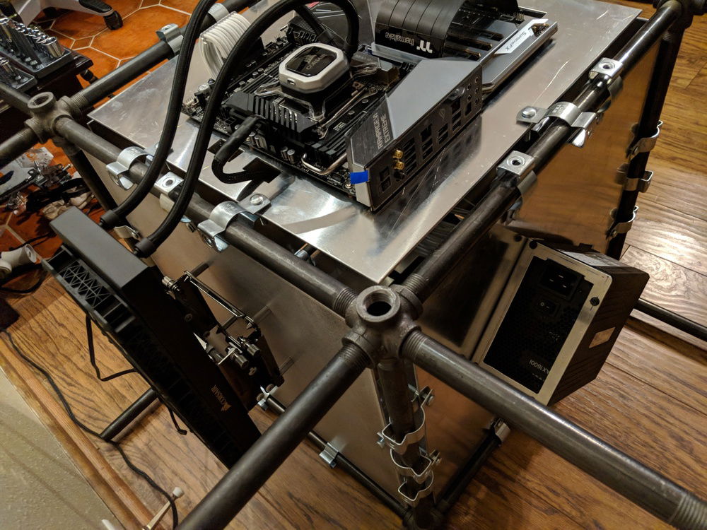 Built a computer for editing and rendering 360 5K video. First time computer builder. Decided to design my own case. Theme was around a cube with a different component on each face of the cube. I used steel pipe and aluminium plates connected with brackets used in the electrical industry.