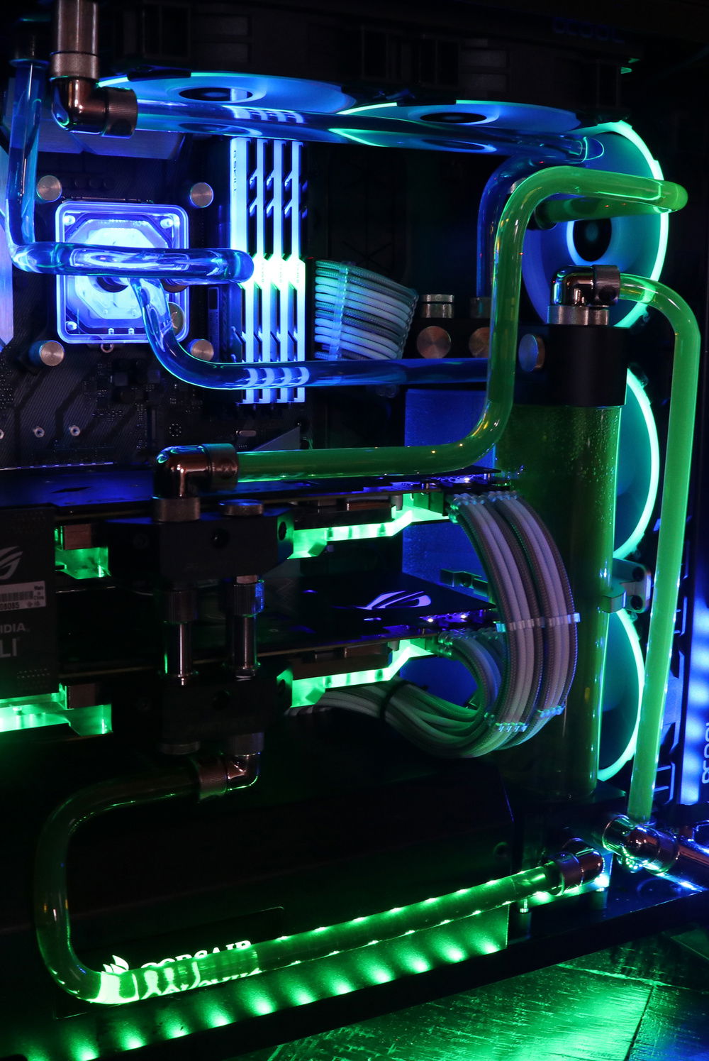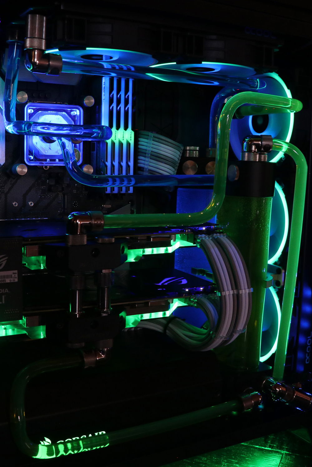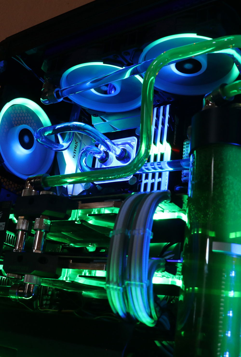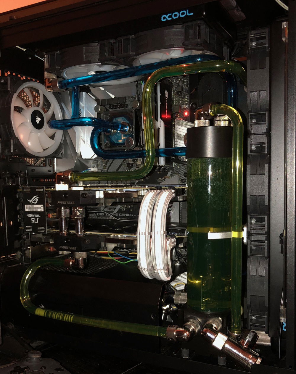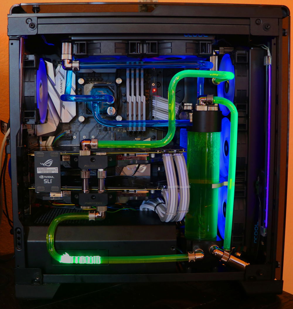 This build started simple enough and then morphed into what it is today. Cooling the dual 1080ti's offered a bit of a challenge until I put together the dual loop, separating the cpu and gpu custom loops. I also encountered plenty of opportunity with the Corsair 570x case and adequate airflow. The original layout, even with the two separate cooling loops, still resulted in some serious heat issues. I ended up setting all fans to exhaust and created a completely negative airflow design. I have researched positive versus negative airflow, and have plenty of experience with this setup, there is no need to comment on the fact my front fans are backwards. I understand, but sometimes you simply have to do what it takes to keep your rig temps at bay. I am happy to say the system runs cool, quiet, and is a pretty nice over-clocker.