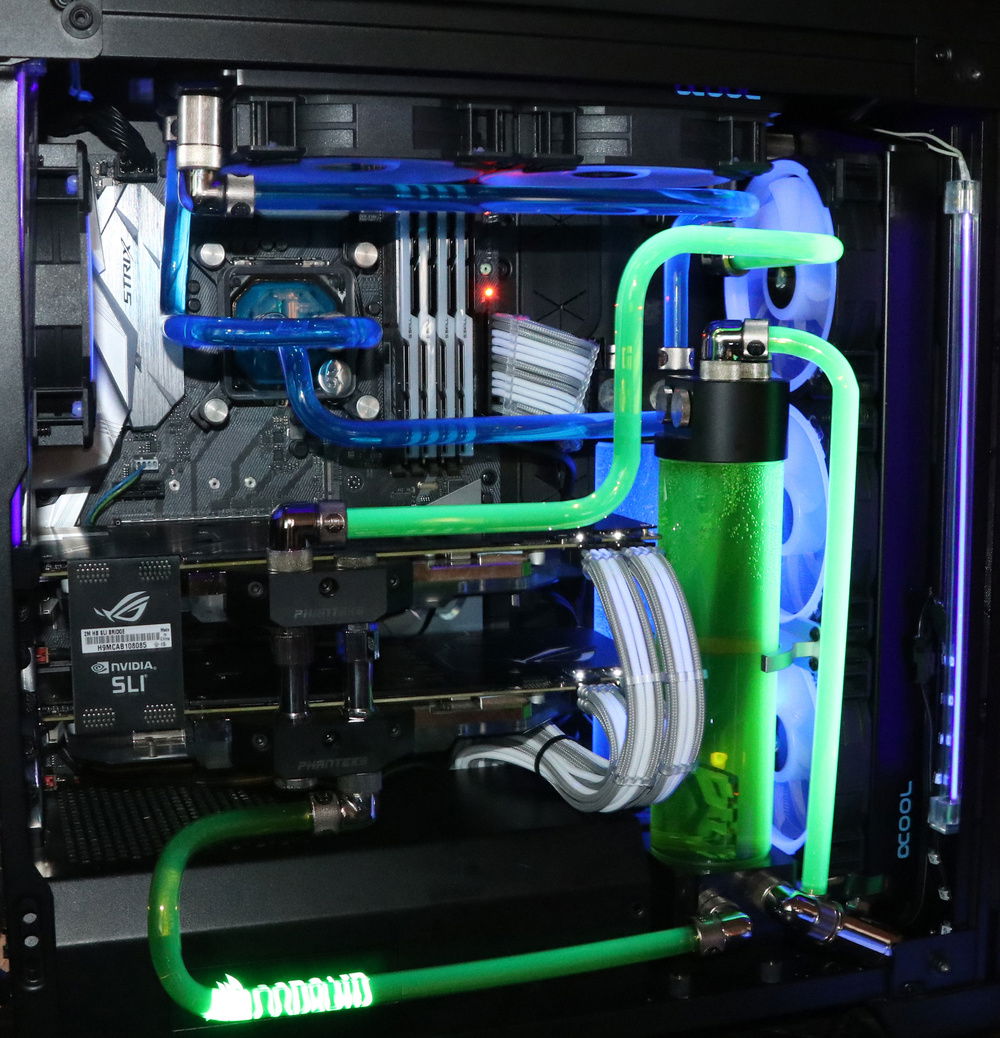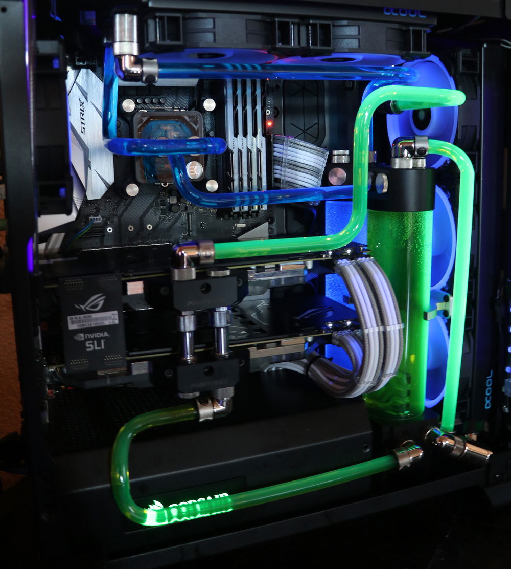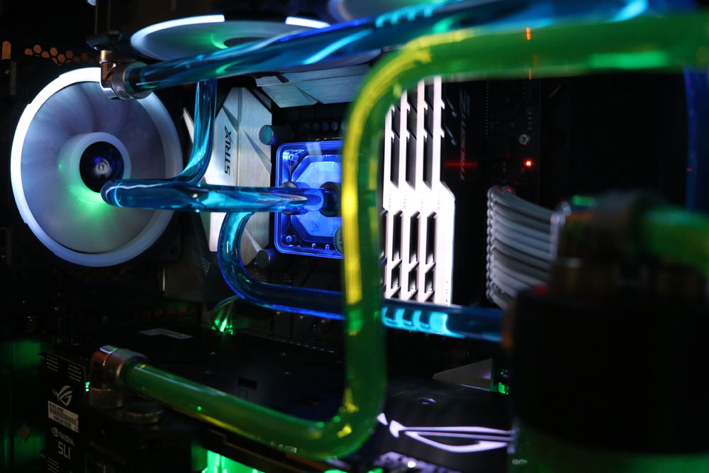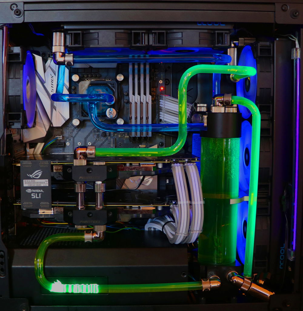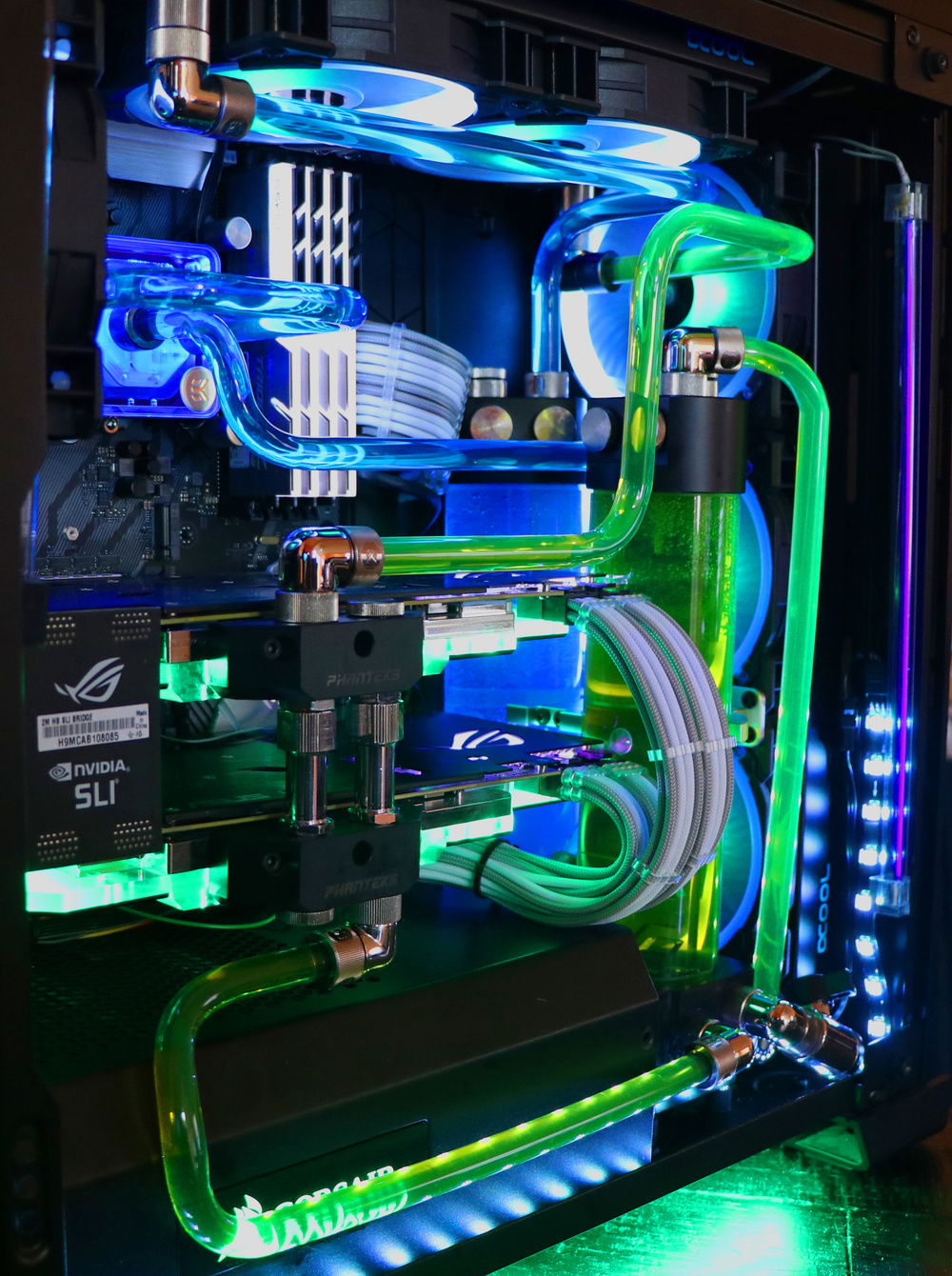 This build started simple enough and then morphed into what it is today. Cooling the dual 1080ti's offered a bit of a challenge until I put together the dual loop, separating the cpu and gpu custom loops. I also encountered plenty of opportunity with the Corsair 570x case and adequate airflow. The original layout, even with the two separate cooling loops, still resulted in some serious heat issues. I ended up setting all fans to exhaust and created a completely negative airflow design. I have researched positive versus negative airflow, and have plenty of experience with this setup, there is no need to comment on the fact my front fans are backwards. I understand, but sometimes you simply have to do what it takes to keep your rig temps at bay. I am happy to say the system runs cool, quiet, and is a pretty nice over-clocker.