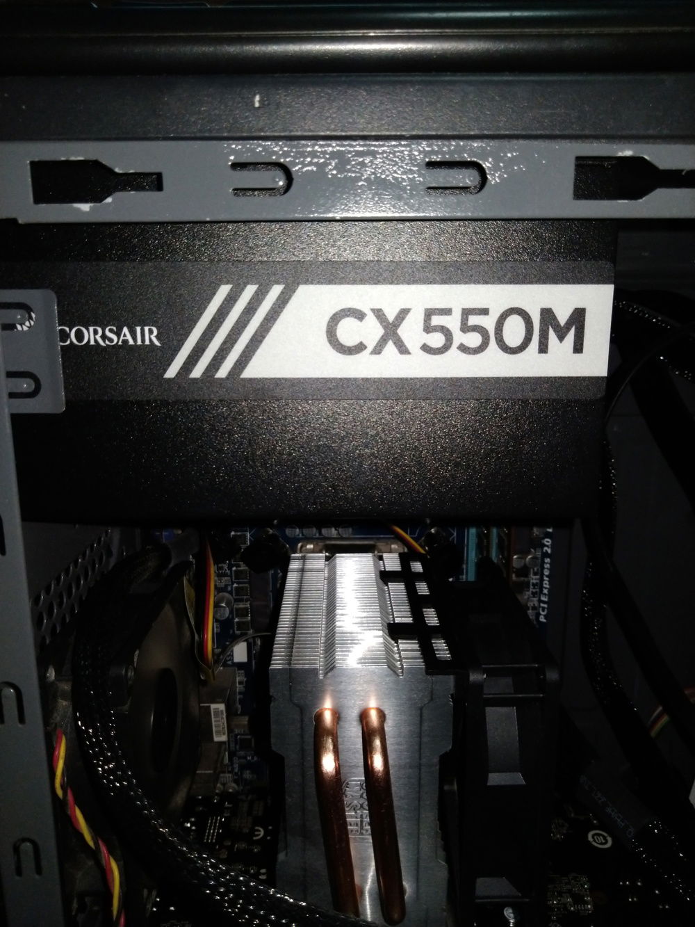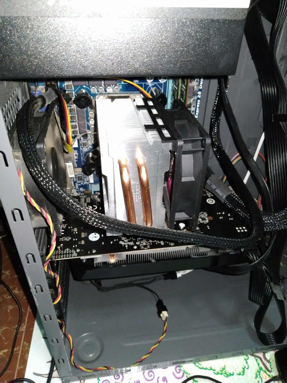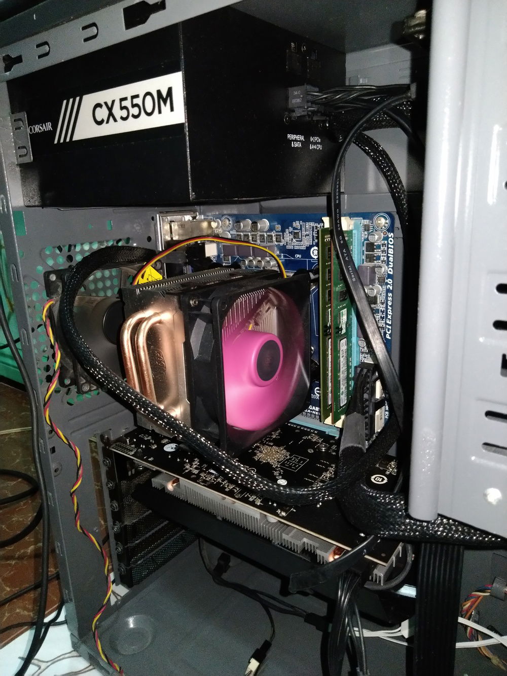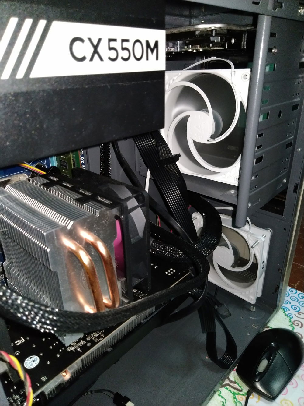 There was a plan to change the CPU cooler's fan into a PWM type. However, it was realized that the fan's high RPM mean that it blows more air to the heatsink, therefore dissipating the heat faster. The plan was cancelled and instead, the DeepCool exhaust fan (the green one on the left) was replaced by a more powerful one because sometimes the former requires manual cranking on PC start.