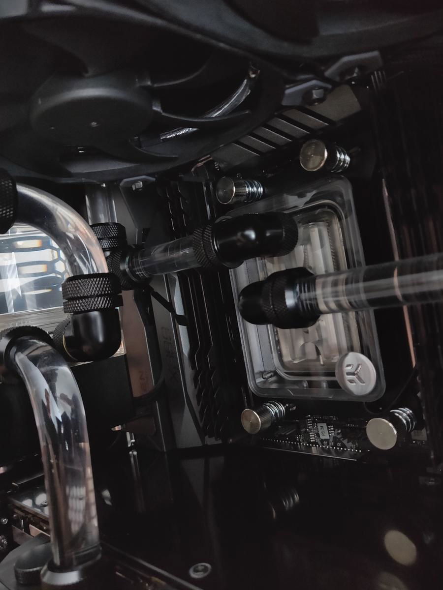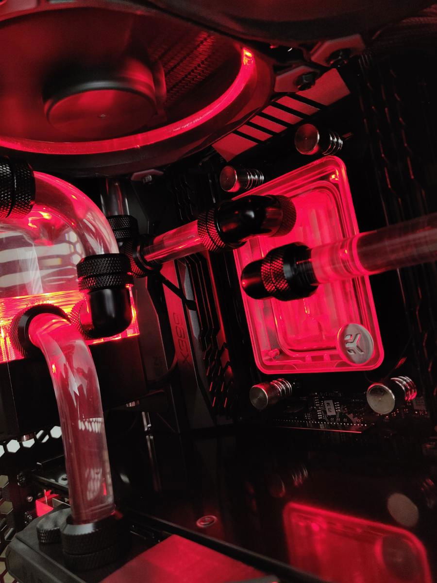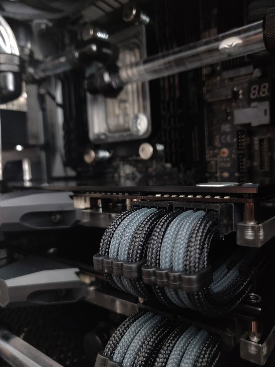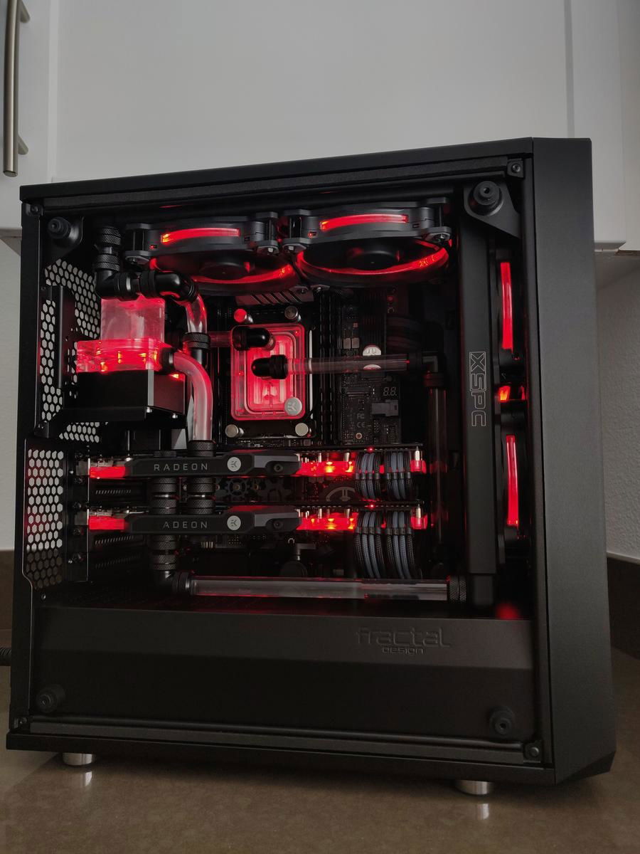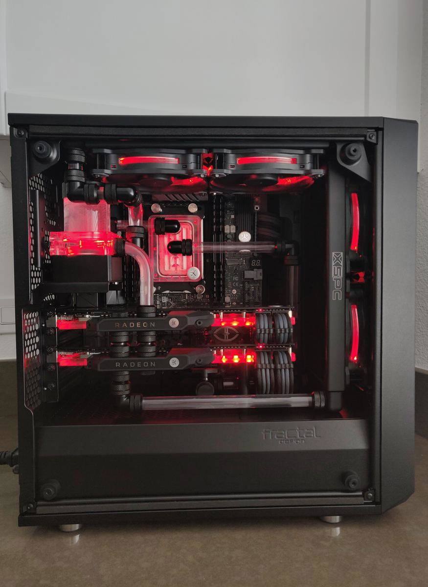 First custom WC build! My goal was to create something that looked clean on and off, as I'm not a fan of most RGB parts which look white when you turn the led lights off. So having the ability to flip everything on & off whenever while still matching the theme was a main priority! I also wanted to show AMD some love while moving away Intel/Nvidia. Ah, how I've missed AMD. OCing & getting acclimated again with AMD has been smooth sailing thus far.