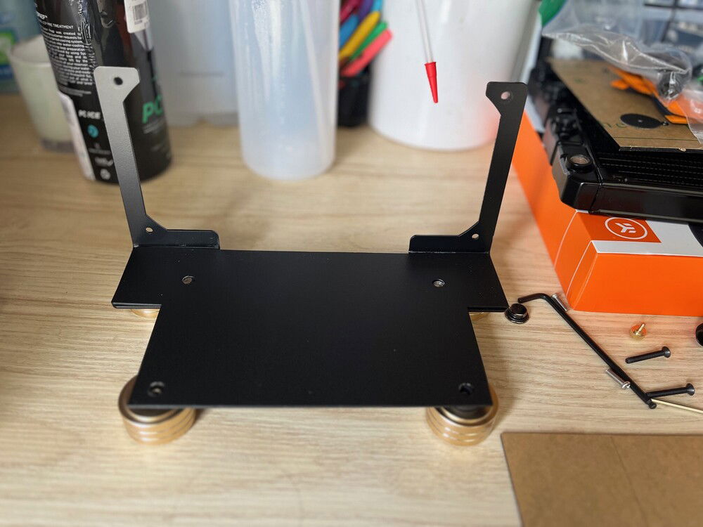 But the real challenge for this build was the limited case dimensions and design to mount two radiators. I gave her my plan for case modding, however, she was against the idea of drilling holes or resorting to physical deformation of her case🥺. We thought about the MO-RA solution, but that would have added almost $500 extra cost and defeat the small footprint she needed. Instead, I thought about putting together a wall of radiators, similar to the MO-RA idea, attached to the case. I cut to size and painted a a custom radiator mount, made from 1/8 thick aluminum and two XSPC rad stands, that attached to the bottom of the HYDRA case. The case would become heavier and less stable, so to prevent that, I purchased 4 larger gold-toned speaker feet to replace the existing HYDRA feet. The solution was stable and worked very well.