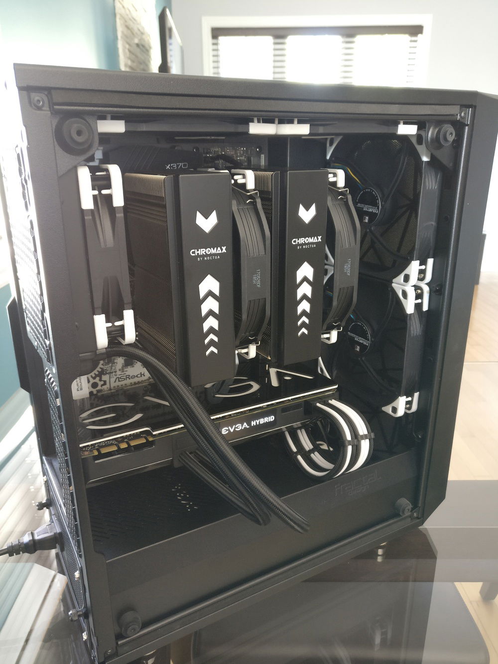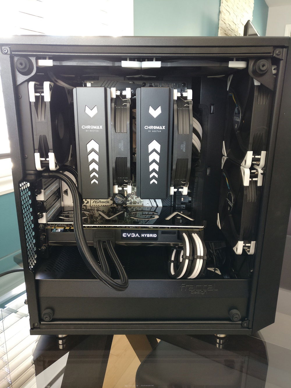 This is my gaming/rendering rig. It's my daily driver, and I spared no expense to get a great looking and performing machine. Basically it does everything right in near total silence without looking tacky with a classic black and white look.