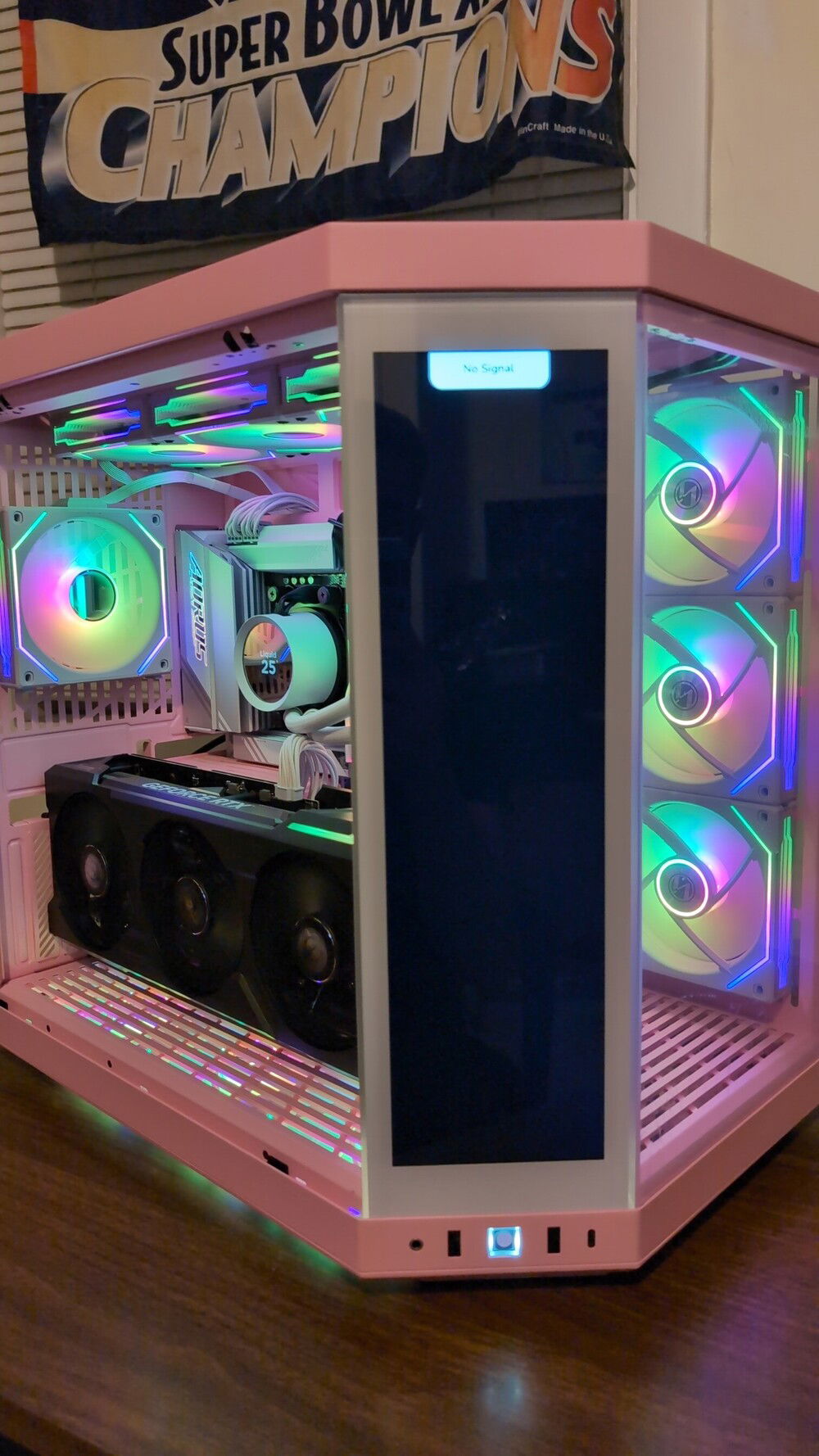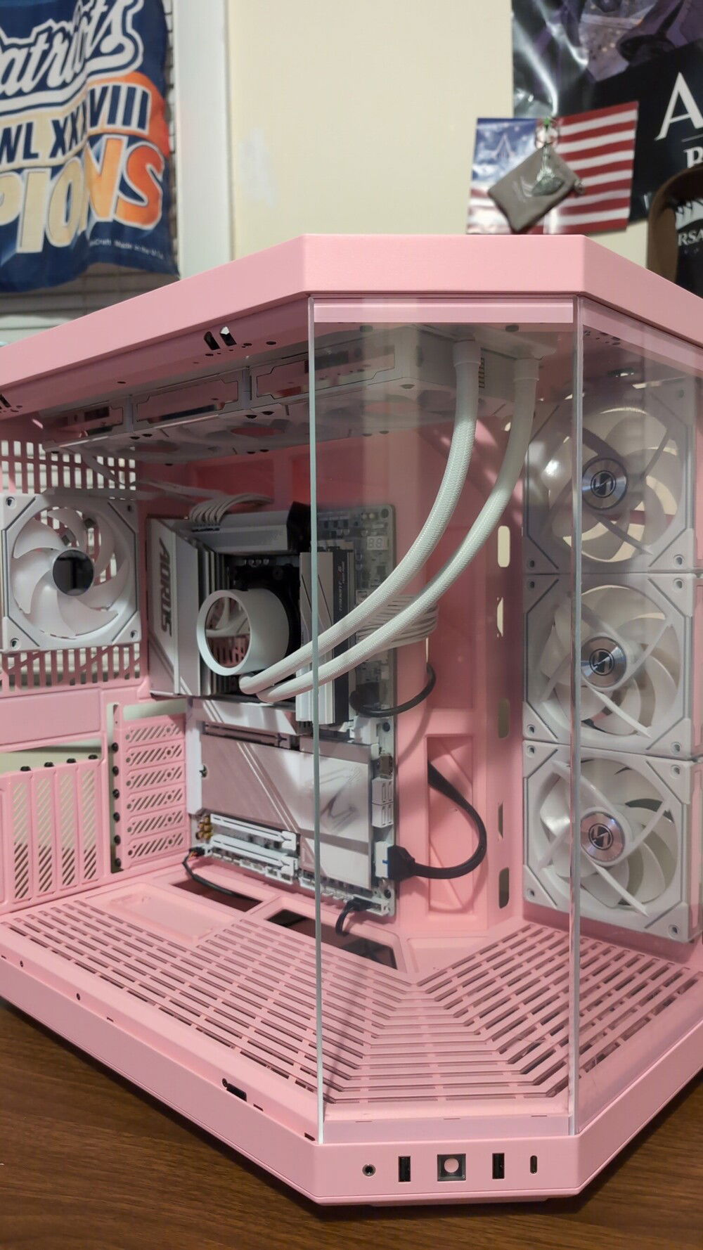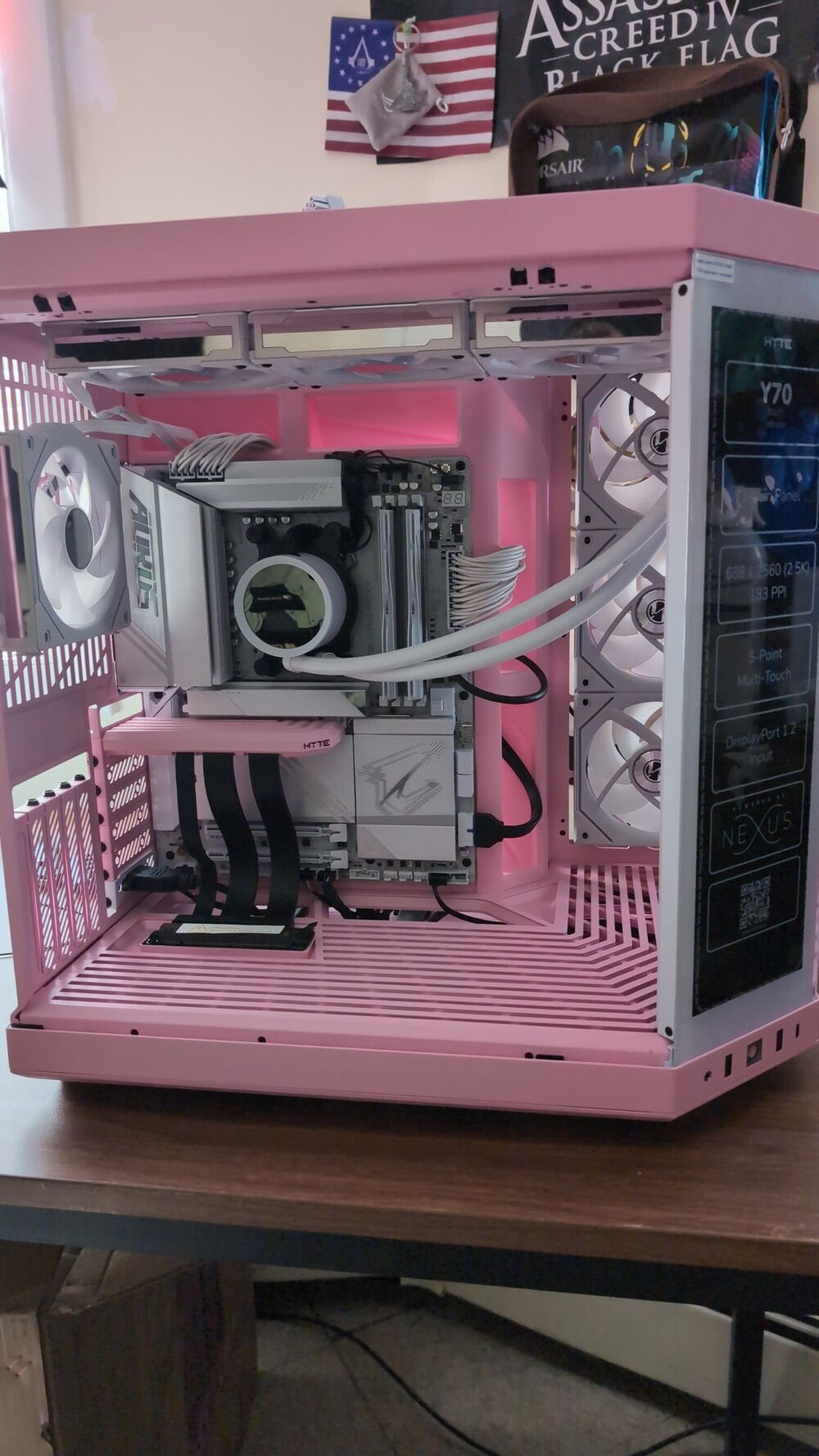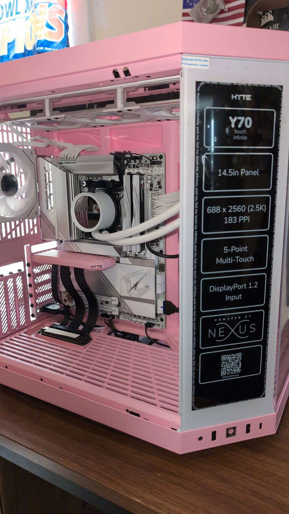 Pc is done in the new hyte y70 in pink with the white touchscreen panel. Also with the new x870e aorus motherboard featuring 7200mhz ram