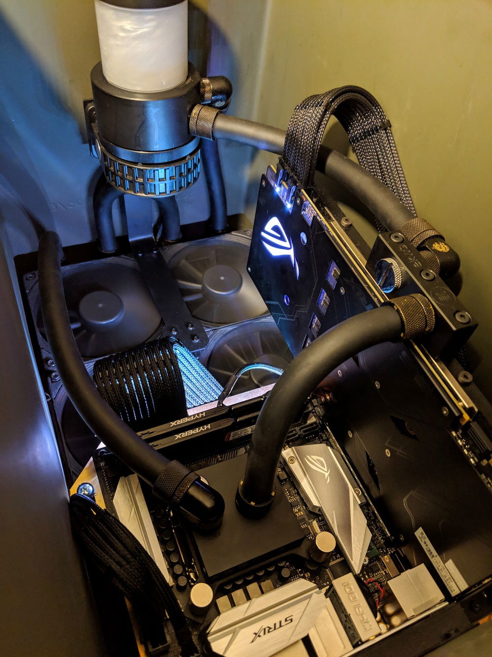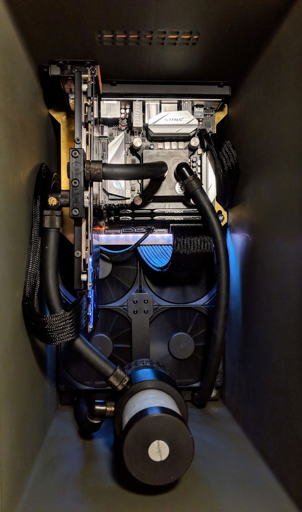 I've been working on this stupid thing for about three years now and have had the concept in mind for much longer than that. While I've seen ammo can PCs before, it always stood out to me that I had never seen one done to it's full potential. A full custom loop, no hardware gimped in the name of thermals, a proper all out gaming rig in an ammo can. I wanted to maintain the image of "just an ammo can" as much as possible and went to every length possible to insure this. You'll notice the complete lack of fasteners anywhere other than on the back and bottom of the case. This was very intentional and made a few things somewhat difficult. I also wanted it to be completely portable without concern of easily damping it. I believe this was achieved.