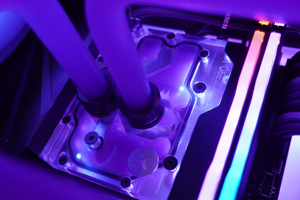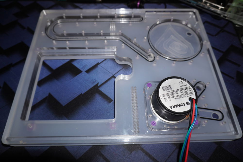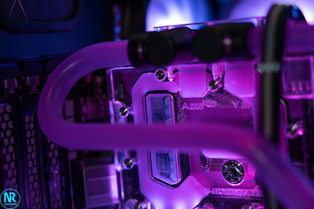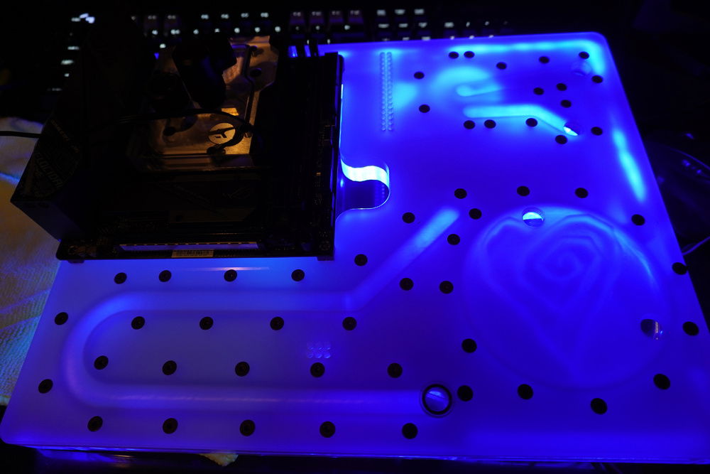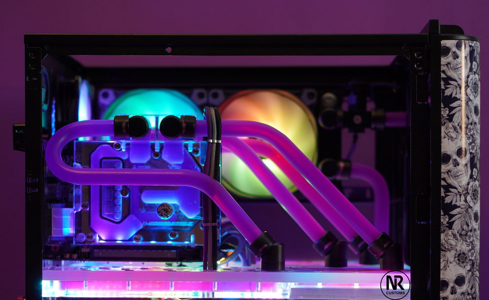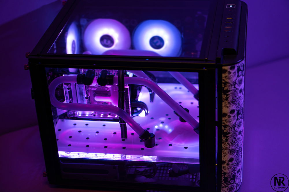 The main plate was removed and replaced with a huge custom distro with a D5 pump. The front part that supports the fan was also removed and replaced with a custom front distro panel. Full custom set of cables were made for this build.