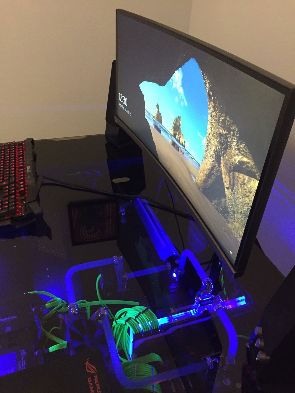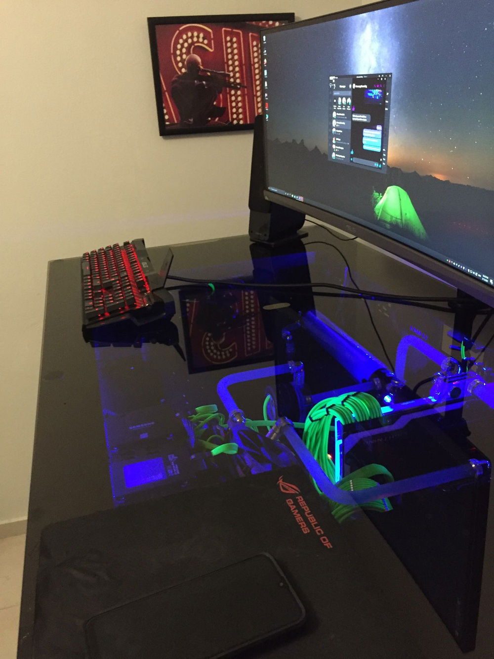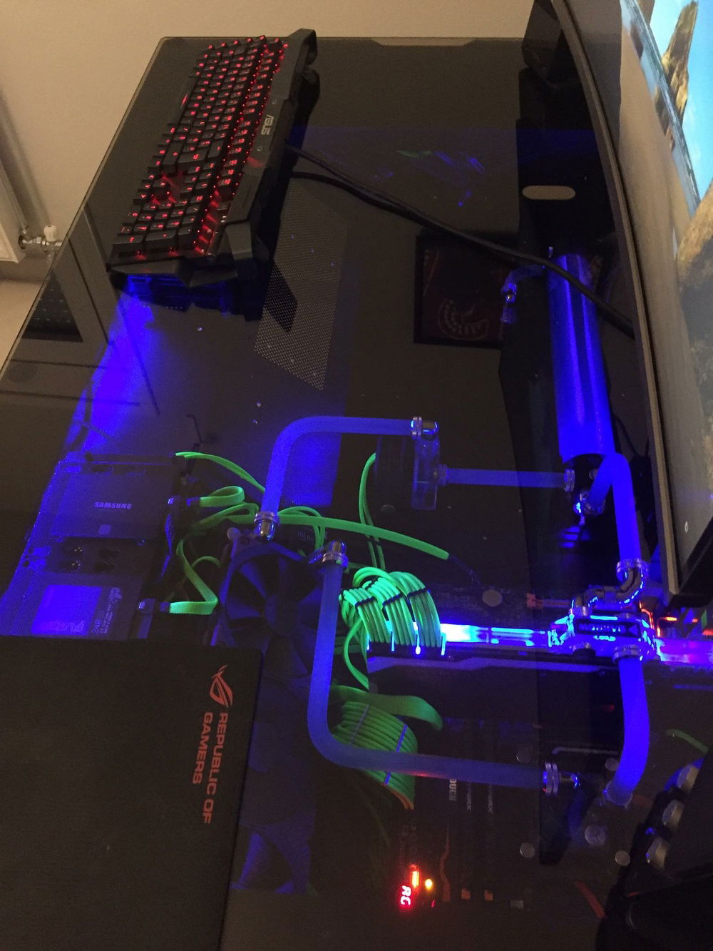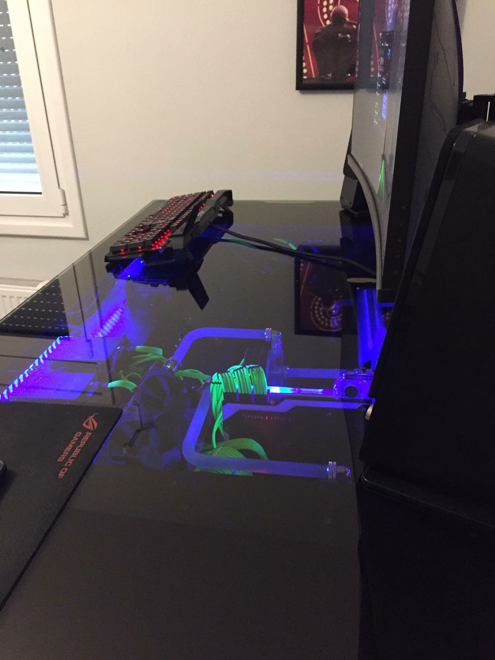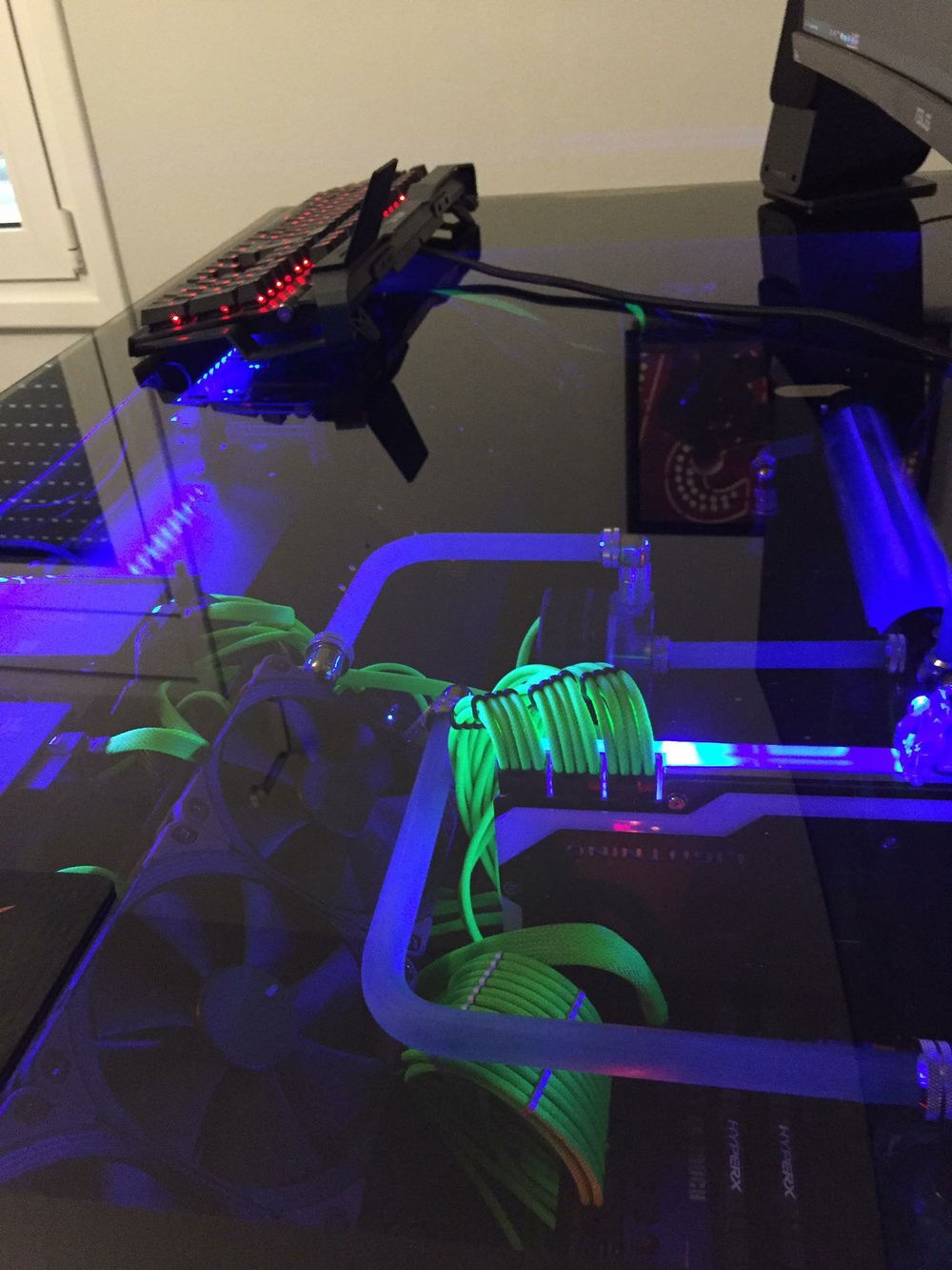 accessories: barrow lrc 2.0 controller with 2 100mm led strips, 5mm blue led with one plexi plug for the bottom of reservoir, ek multiport top for reservoir, one passthrough with ball valve placed under the desk for draining the system properly.