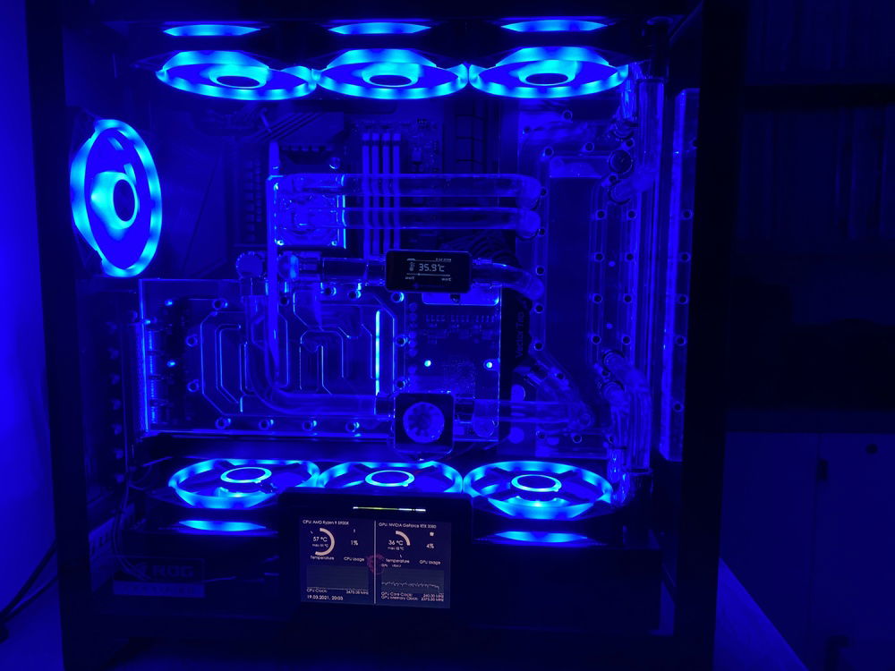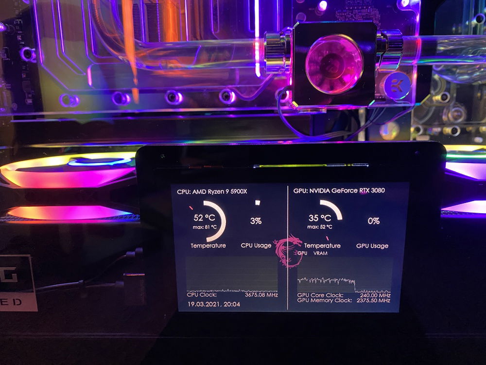 Custom 5" screen with Rainmeter software monitoring HWiNFO to give CPU and GPU temp stats connected via HDMI to the graphics card and shows as a third monitor.