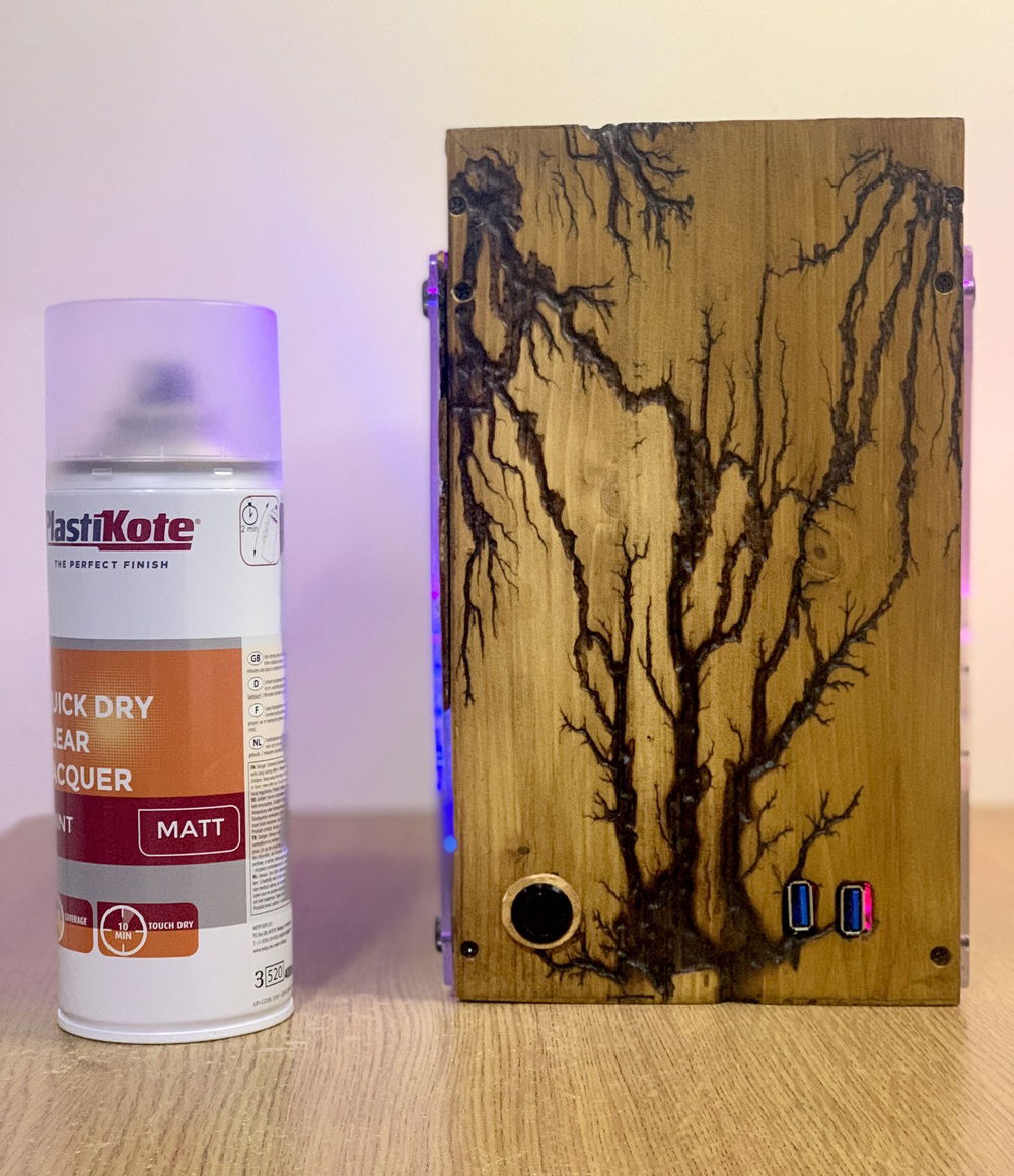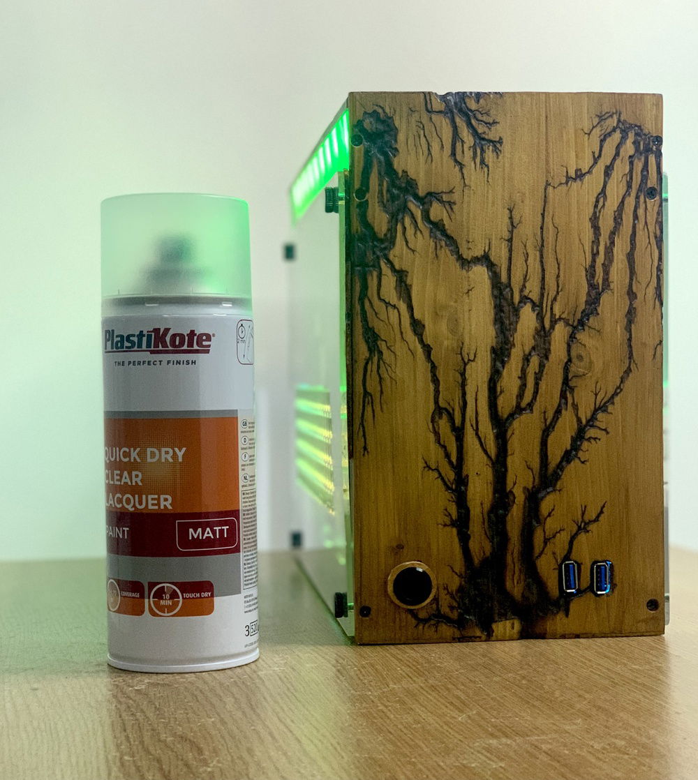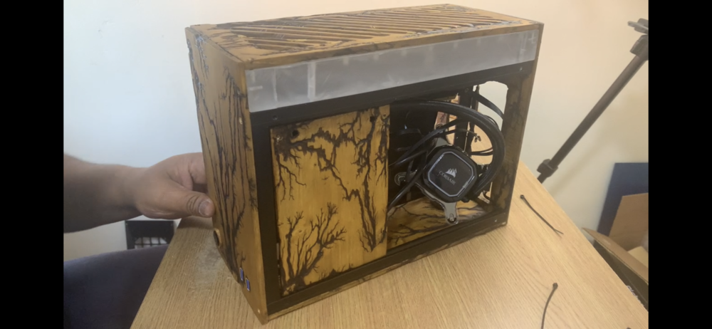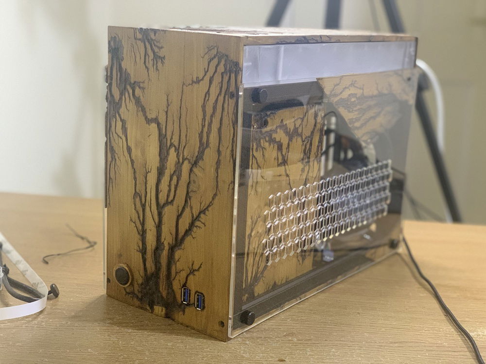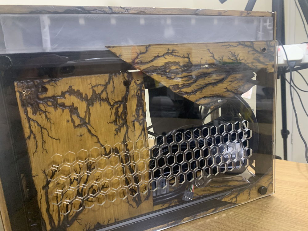 lichtenberg fractal wood burning method use to impose a lighting strike. Cut the wood plates to fit onto a geeek a50 metal frame and screwed to the frame. Struggled to find around 5mm thickness of wood so I had to slice 18mm wood into 2 parts and sand it down. Can not use plywood or mdf because it would not burn like wood. I am glad that placed very well with the frame. Please vote if you like