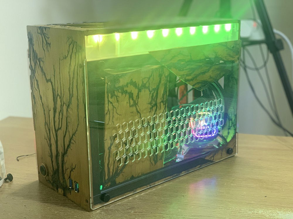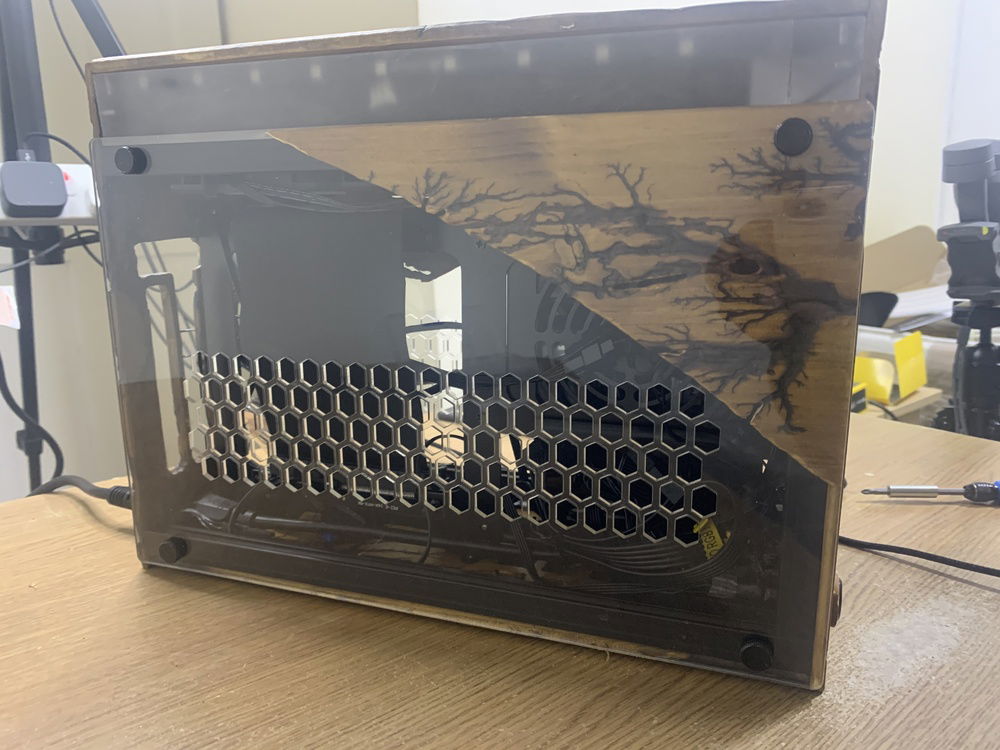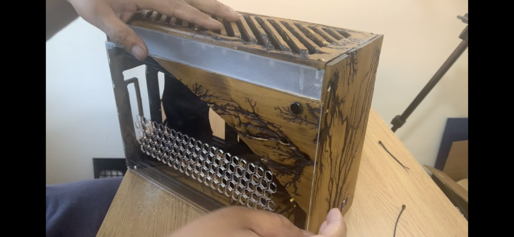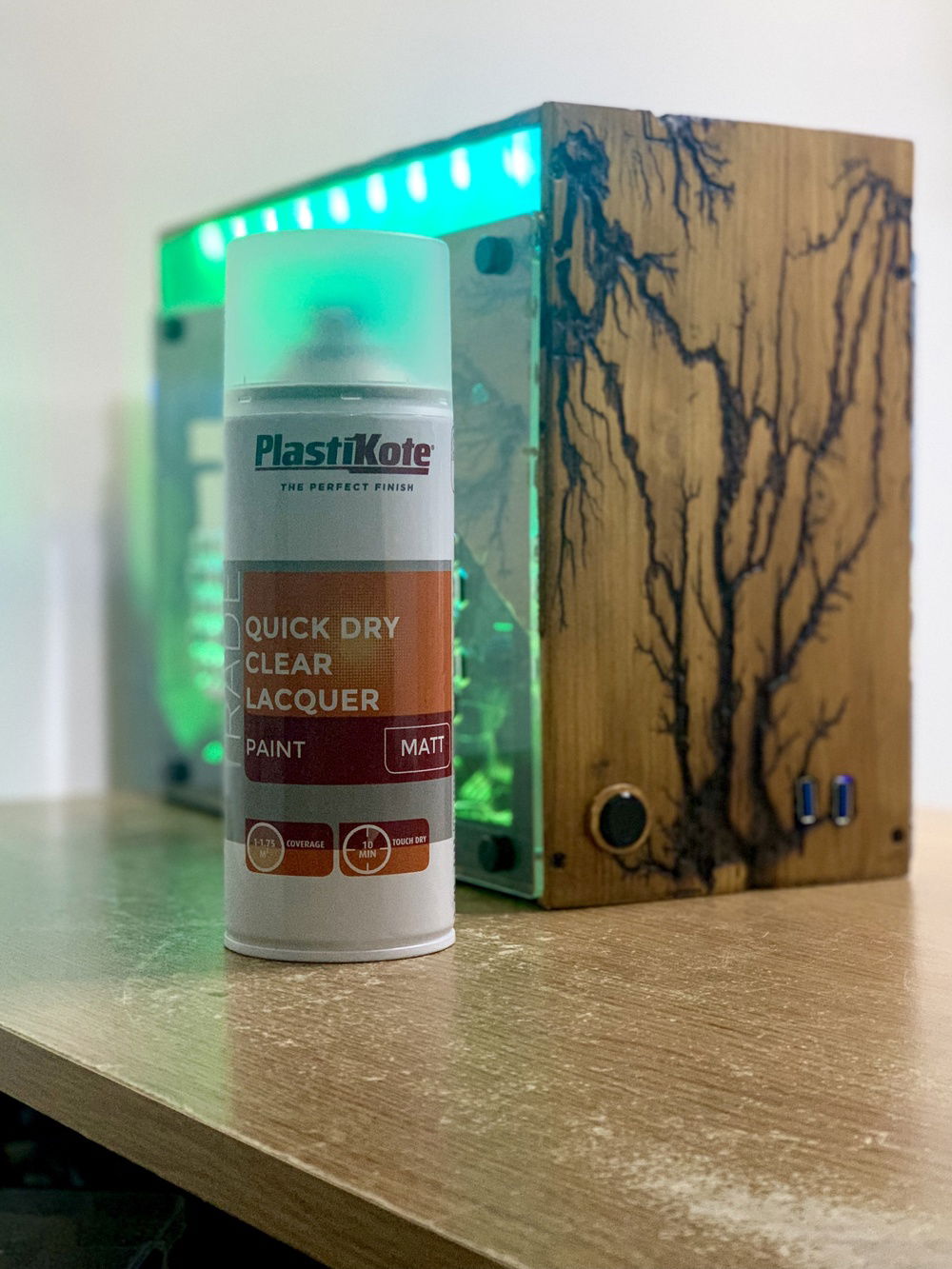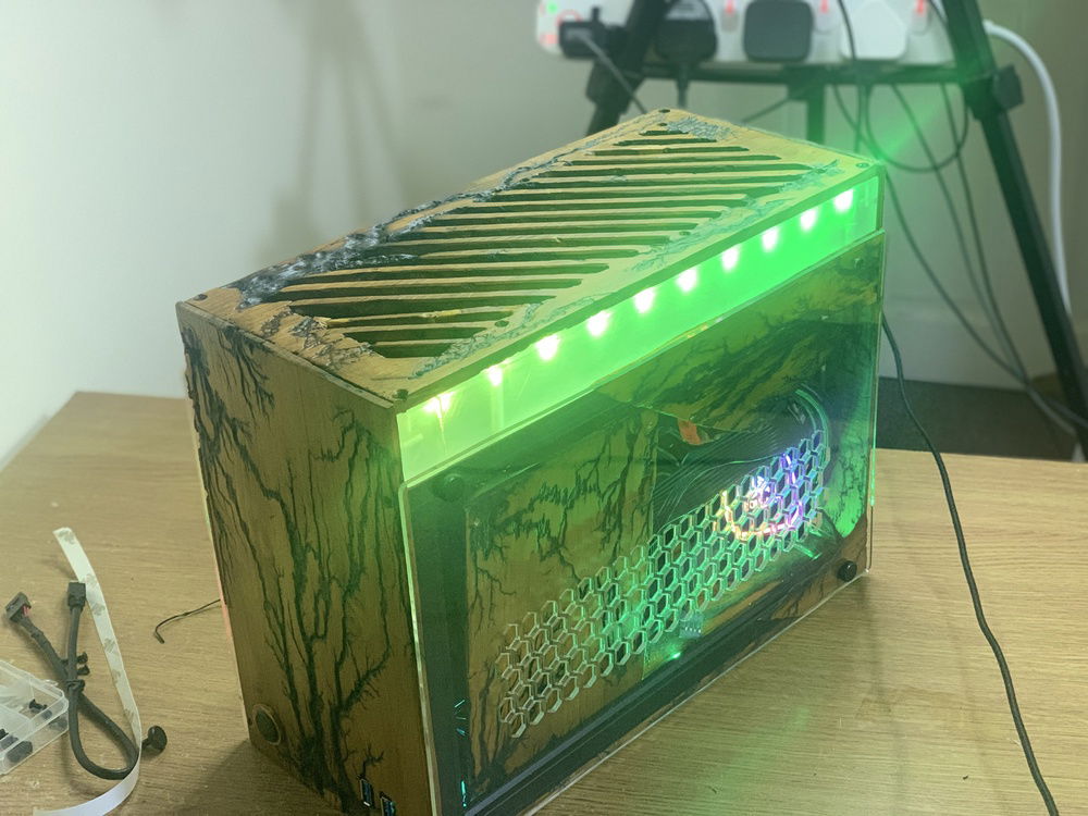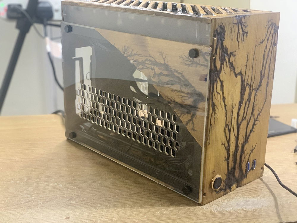 lichtenberg fractal wood burning method use to impose a lighting strike. Cut the wood plates to fit onto a geeek a50 metal frame and screwed to the frame. Struggled to find around 5mm thickness of wood so I had to slice 18mm wood into 2 parts and sand it down. Can not use plywood or mdf because it would not burn like wood. I am glad that placed very well with the frame. Please vote if you like