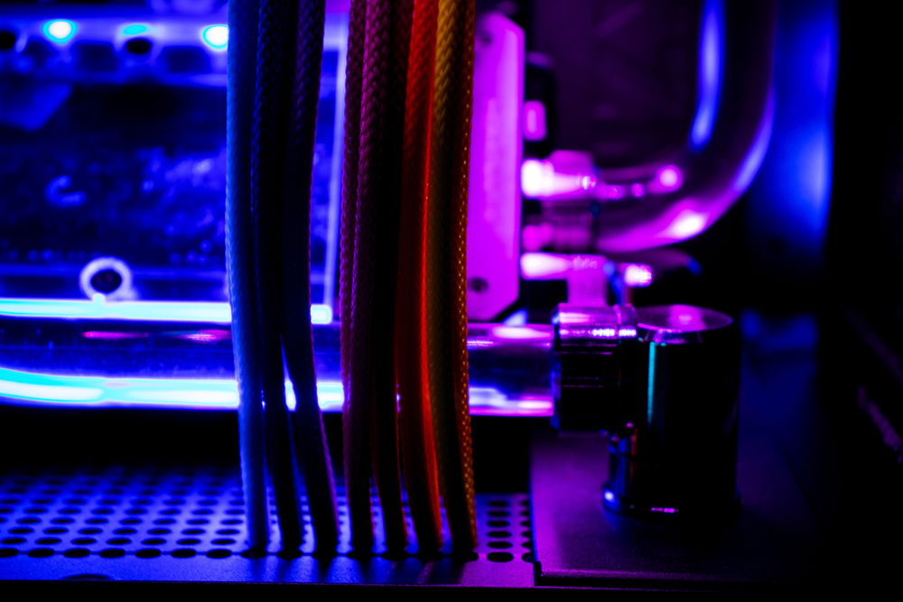 To start off, this is not a beast machine. It's not supposed to be as I do not have the budget for such high end components, and my dream was to watercool what I had. Now for the meat of it. This is a colourful, retro 70s - 90s style build set at night. I'm using a dark environment and bright LED's to create that neon cyberpunk vibrancy which looks gorgeous when gaming at 2am. The chassis is small so everything is compact and snug to minimise dead space, looks bad when larger cases have a stubby pump-res combo for example. Seems like a poor use of space. (-MKBHD)