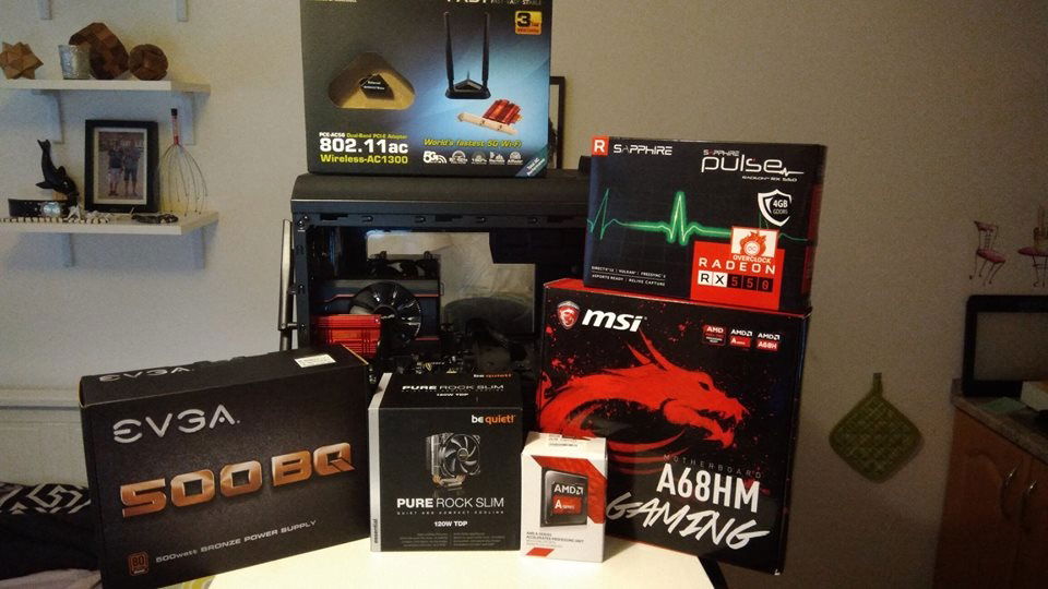 SilentiumPC Alea M50 PC Case - mini tower, mATX AMD A8-7600, Quad-core CPU @ 3.8Ghz SAPPHIRE PULSE Radeon RX 550 4G OC GPU HyperX Fury 8GB KIT DDR3 RAM @1866MHz, CL10 (2x8Gb) Seagate BarraCuda 2TB HDD EVGA 500 BQ 80+Bronze PSU MSI A68HM GAMING MB Be quiet! PURE ROCK SLIM CPU Air Cooler ASUS PCE-AC56 Dual band PCIe Wifi Adapter Windows 10 Home (FPP)