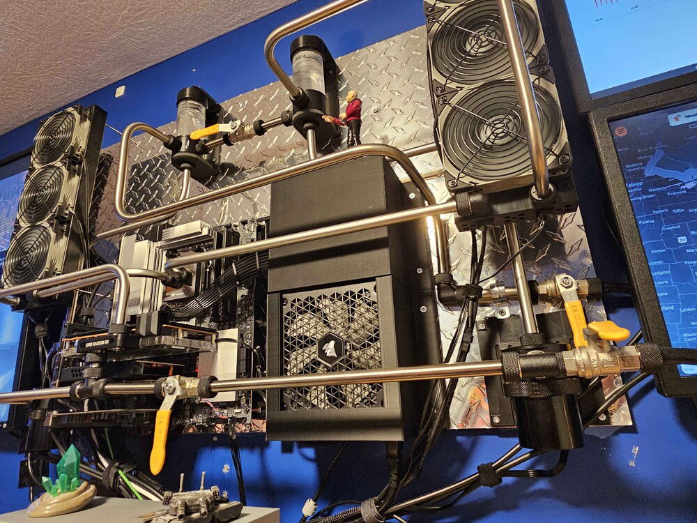 While I was happy with my first attempt at a wall PC build, I really wanted to try custom water cooling and improve on some things. I know I wanted to do hard lines, no RGB, and try to keep even symetry. I wanted to keep 5.1 sound and stick with AMD for running Linux (Xubuntu 24). I also wanted to make a manual control panel to monitor temps, voltages, and allow for manual adjustments because I like manual. My car has a manual transmission, manual locks, hand crank windows, you get the idea. The build goes into a relatively small room, so in the warmer months I wanted a way to try to dump some of the heat outside. I began this journey in June.
