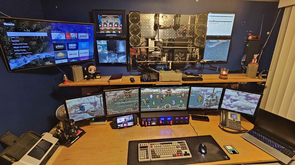 Why all the screens? They were headed for the landfill anyway, so I got them for free and this was the best use I could think of. The 4 on the top on either side of the PC are powered by a compute board. The PC itself powers the 5 below the shelf and optionally the TV.