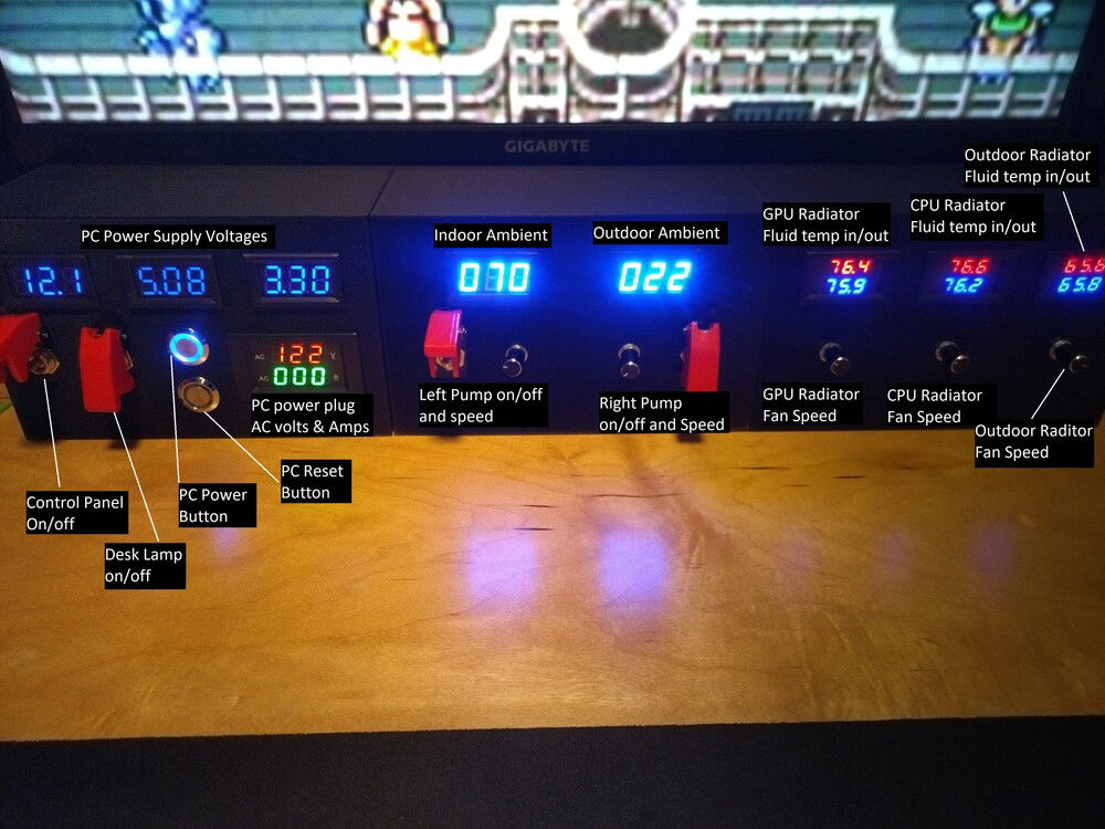 All of the pumps and fans are powered by the control panel, so I can run the cooling system without the computer even being on. See the image for the description on what the control panel does. I designed and 3dprinted the housing.