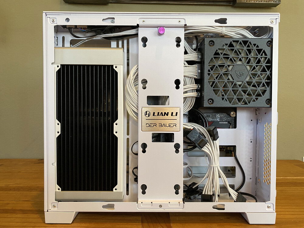 -- Stow 24-pin ATX cable right next to PSU for now. It will be routed through the upper grommet to the motherboard later.