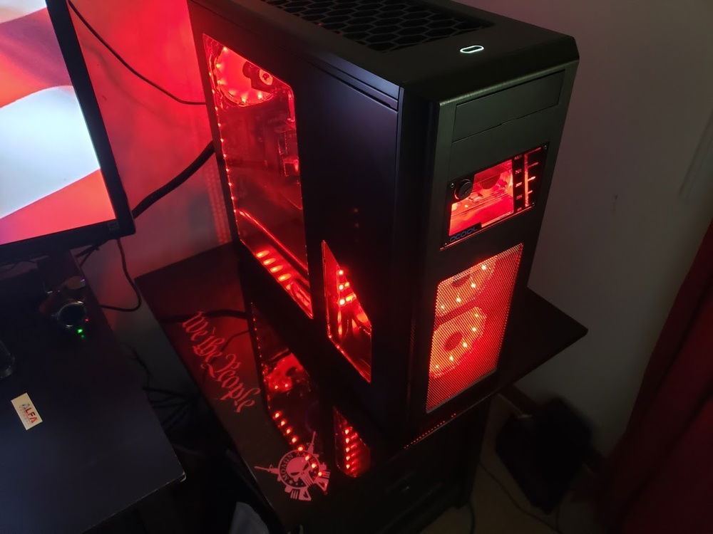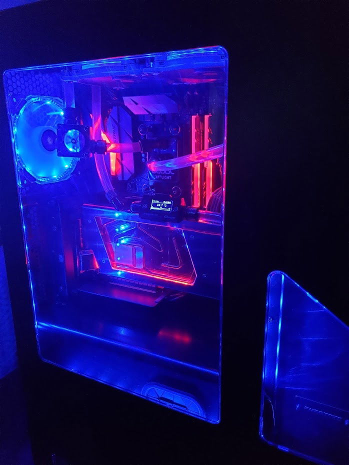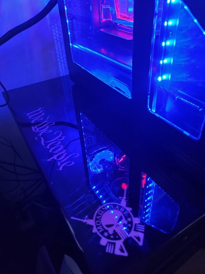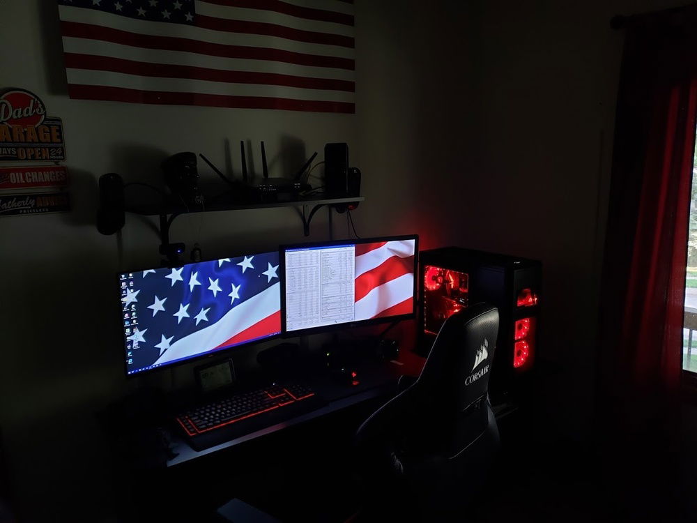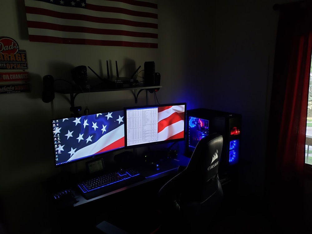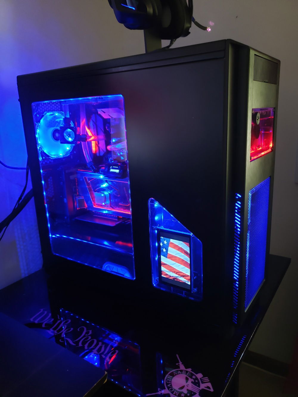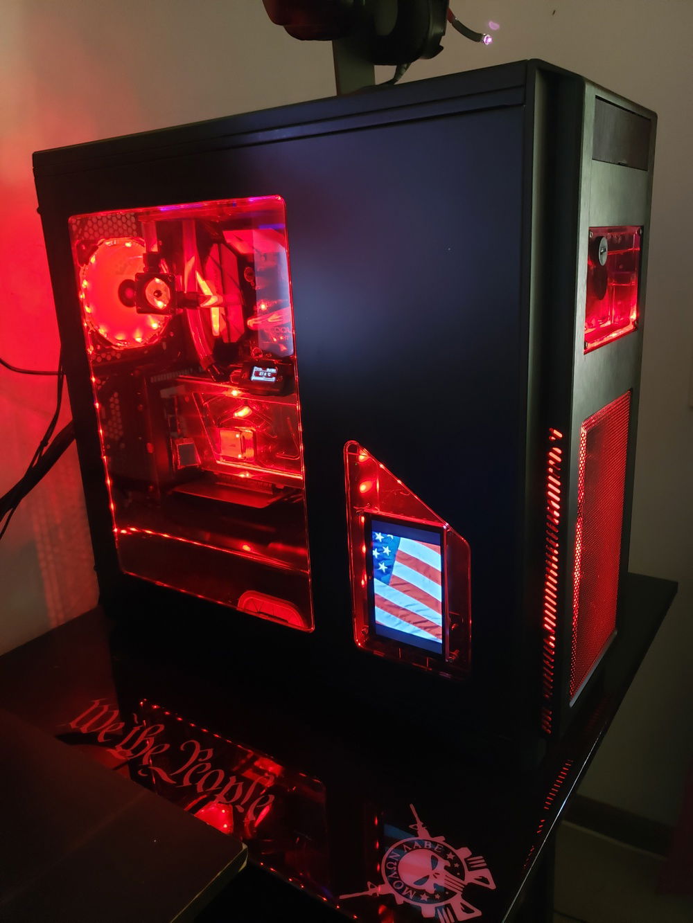 A little bit of 'Merica to pay homage to living free and to a 22 year Air Force career. Ryzen 7 1700 with Alphacool Nexxoss XP3 Light, EVGA GTX 1080 FTW with Watercool HEATKILLER IV ACRYL Ni , using the Alphacool NexXxoS Cool Answer 240 D5/UT kit. I did just upgrade the memory to B-Side G.Skill Trident Z from Hynix Trident Z. Case is Phanteks Enthoo Pro, front radiator is the Aplhacool UT60 x 240 copper, and upper radiator is an XSPC EX360 Radiator, with Corsair LL120 RGB Fans and upper radiator using Thermaltake Riing 12 LED 120mm Radiator Cooling Fans for upper radiator. Update - added a 640x480 LCD screen mounted to plexiglas behind the smaller of the two case windows to look like it's floating. I have an American flag gif running on it for now.