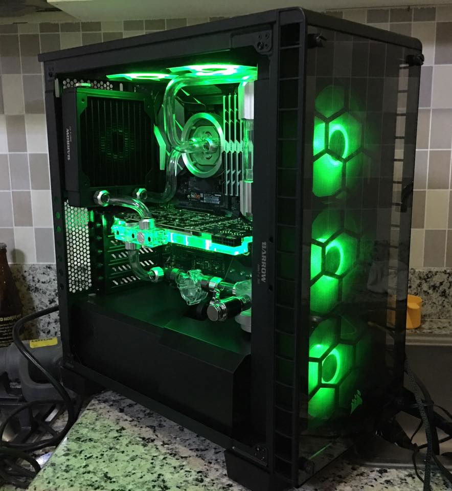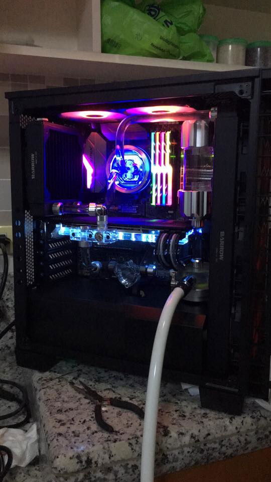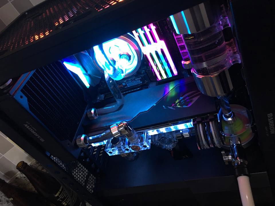 Intel i7-7700k Asus Z270E Strix Motherboard 32GB G-Skill Trident Z RGB Gigabyte GTX 980 Ti Windforce Graphics Thermaltake 850 Watts Riing RGB psu Corsair 460x RGB case Samsung NVME m.2 250GB SSD WD Caviar Blue 2TB HDD FTW PSU sleeved cables