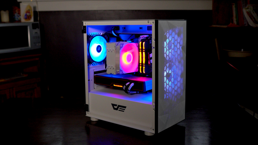 What the DLM 21 Mesh does have going for it is a nifty hinge mechanism for the glass side panel, so no fiddling with thumb screws, speaking of the back side panel thumbscrews are not captive, which is a shame. There is room for 4 hard drives: You can install two 2.5” drives on the side and 2 3.5” drives in the removable cage behind the PSU shroud—that’s right removable. Additionally, the feet are also removable making this a highly customizable little case should you want to mod it. Finally, the DLM 21 Mesh supports 330mm length GPUs and 165mm tall CPU coolers. It’s mostly white with some black, which is great as I’m going for a Black and White + RGB look with this build.