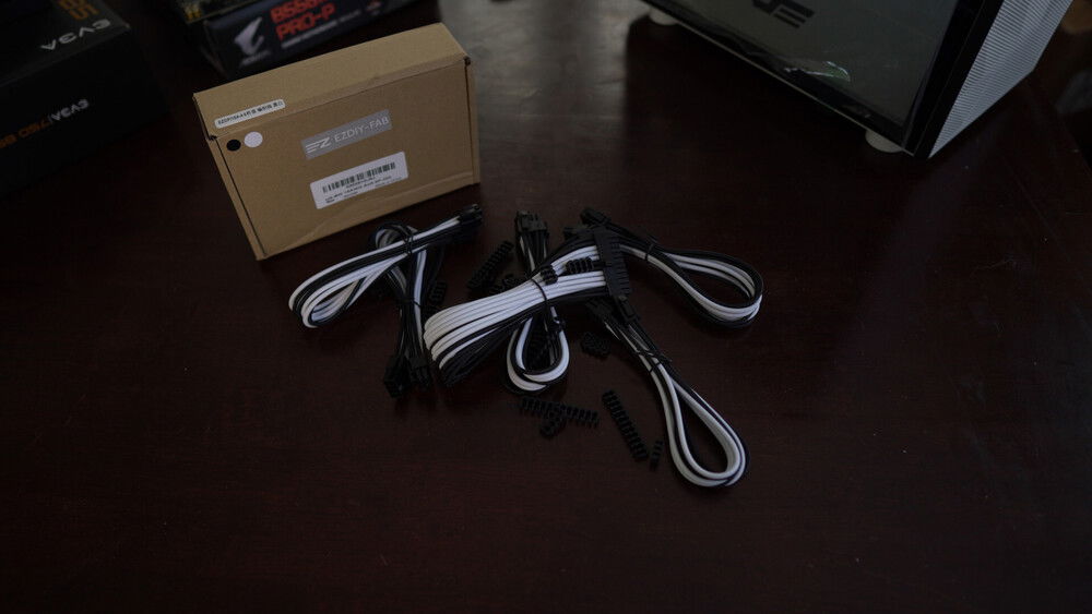 To keep things looking fresh and in line with the black and white theme, I used EZDIY-FAB PSU cable extensions. They’re very affordable and also have received good customer reviews. Included in its unassuming box are a 24-pin extension, 3 PCIe 8 to 6+2 pin extensions, and two 8 to 4+4 pin extensions. They’re all 300mm long, use 18AWG wires, have cable combs, and use braided nylon sleeving.