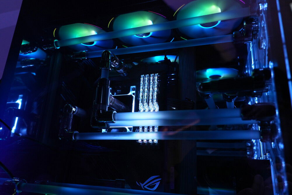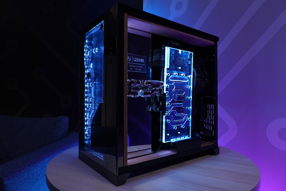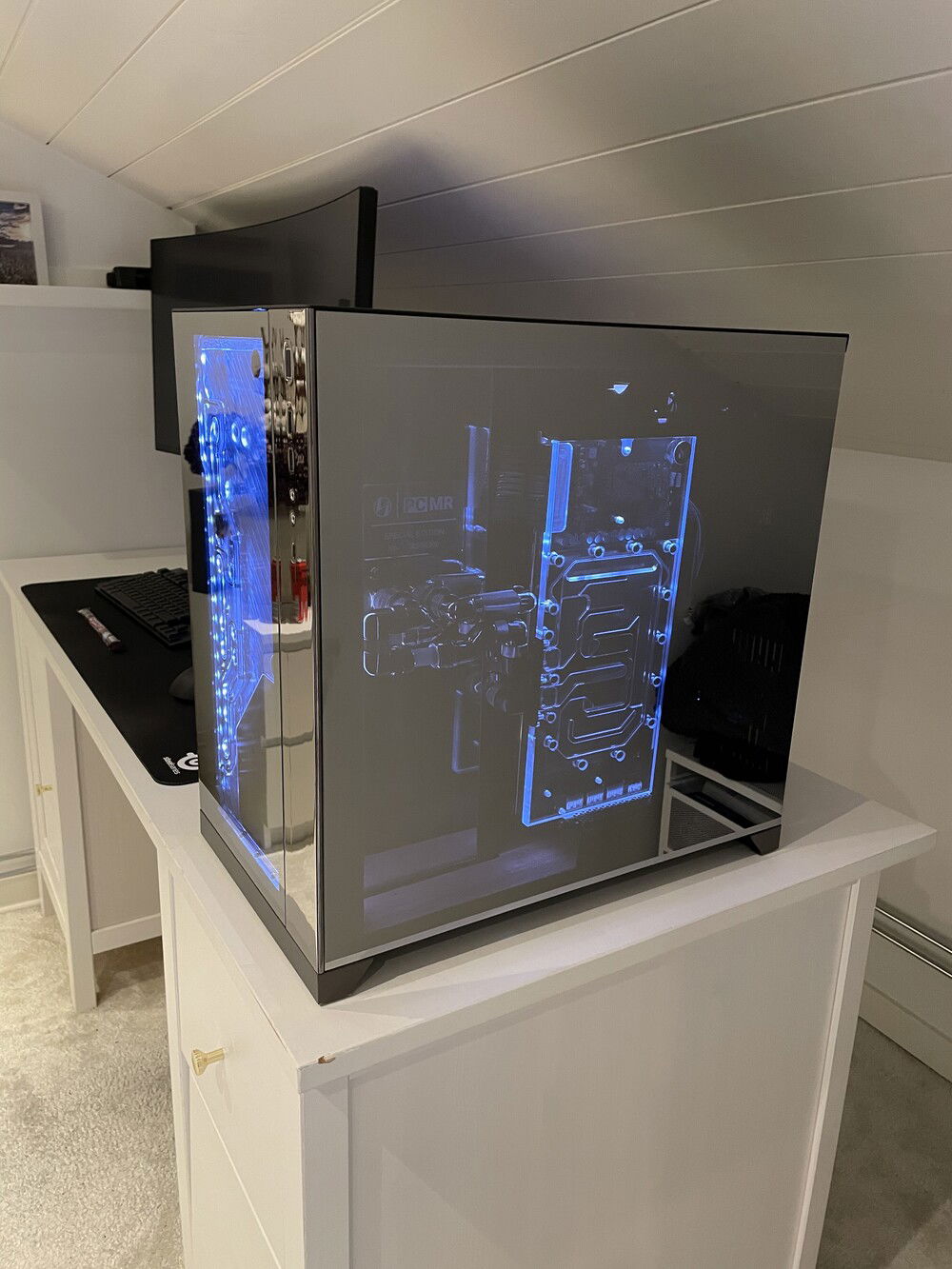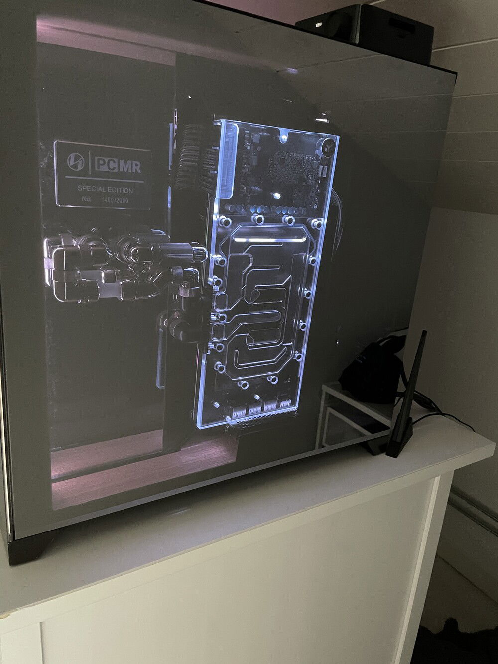 Custom build in the Lian-Li O11 dynamic PCMR Limited edition. Reworked the case to fit the gpu in the back with mirror glaspanels on both sides. Full custom loop and infinity mirror effects everywhere.