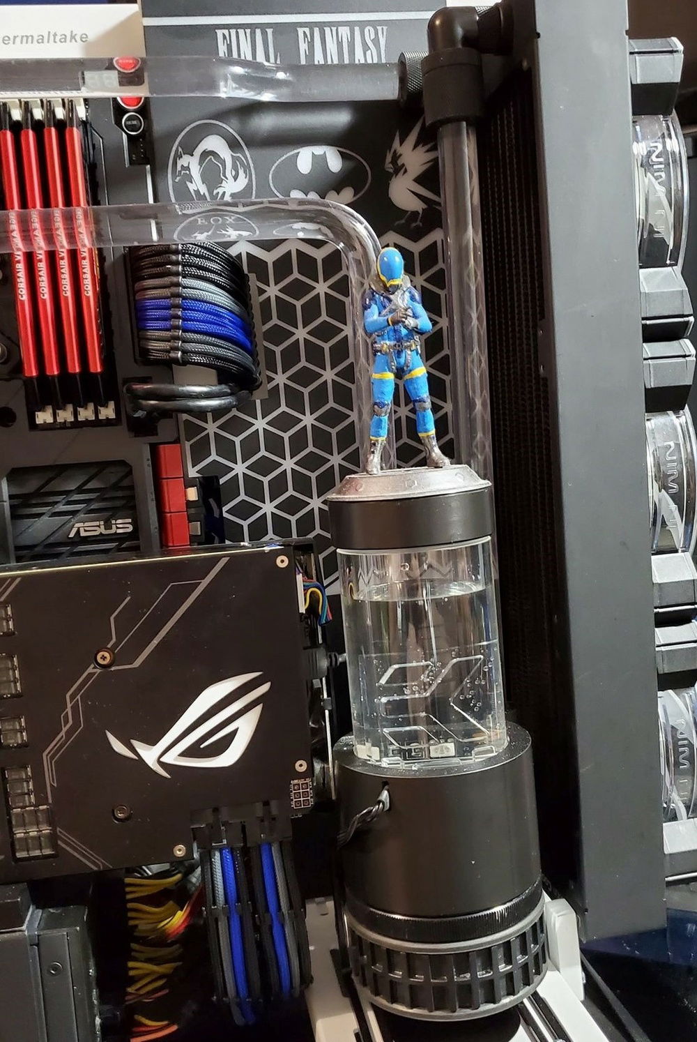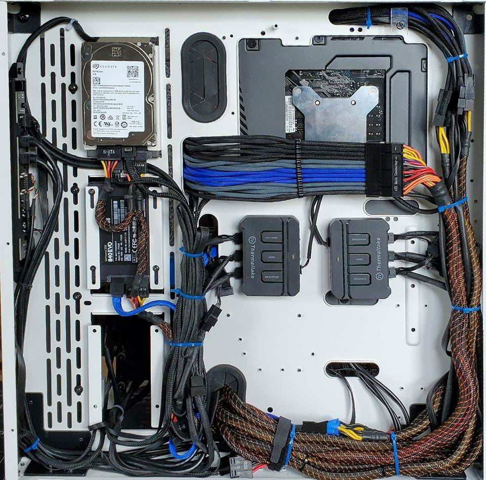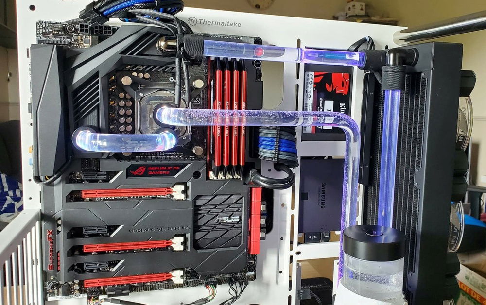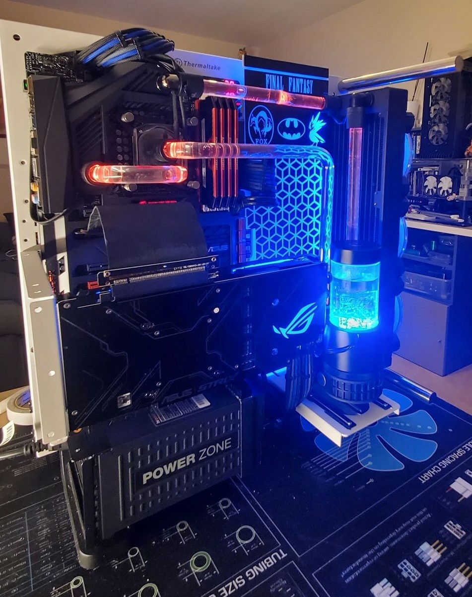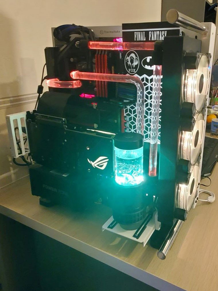 La configuration en détail : - Boîtier: Thermaltake Core P3 Snow Edition - Carte mère: Asus Maximus VI Formula C.2 - Processeur: Intel 4790K up to 4,8GHz (4C/8T) - Ram: 32Go DDR3-2400Mhz Corsair Vengeance RED - Carte Graphique: Asus RTX-2080 ROG-STRIX - Stockage: SSD 500Go + SSD 1To + HDD 5To - Alimentation: BeQuiet! Power Zone 1000W - Pompe: EKWB XRES 140 Revo D5 Rgb PWM - Block Cpu: Watercool Heatkiller IV PRO (ACRYL HWLuxx Edition) - Radiateur: EKWB CoolStream PE 360mm - Fittings: Thermaltake Pacific RGB Plus TT Premium Edition - Tubes: Thermaltake V-Tubler PETG 1000mm - Ventilateurs: Inwin Polaris RGB x3