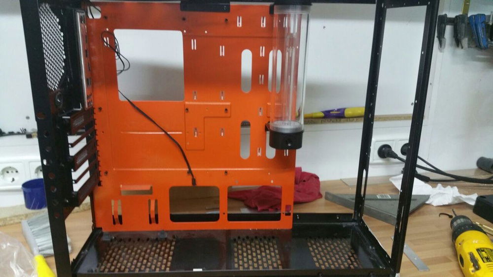 Modded NZXT Phantom Black/Orange case, with custom glass side panel and support for a 360mm radiator in the front (removed the 5.25 and 3.5 bays).