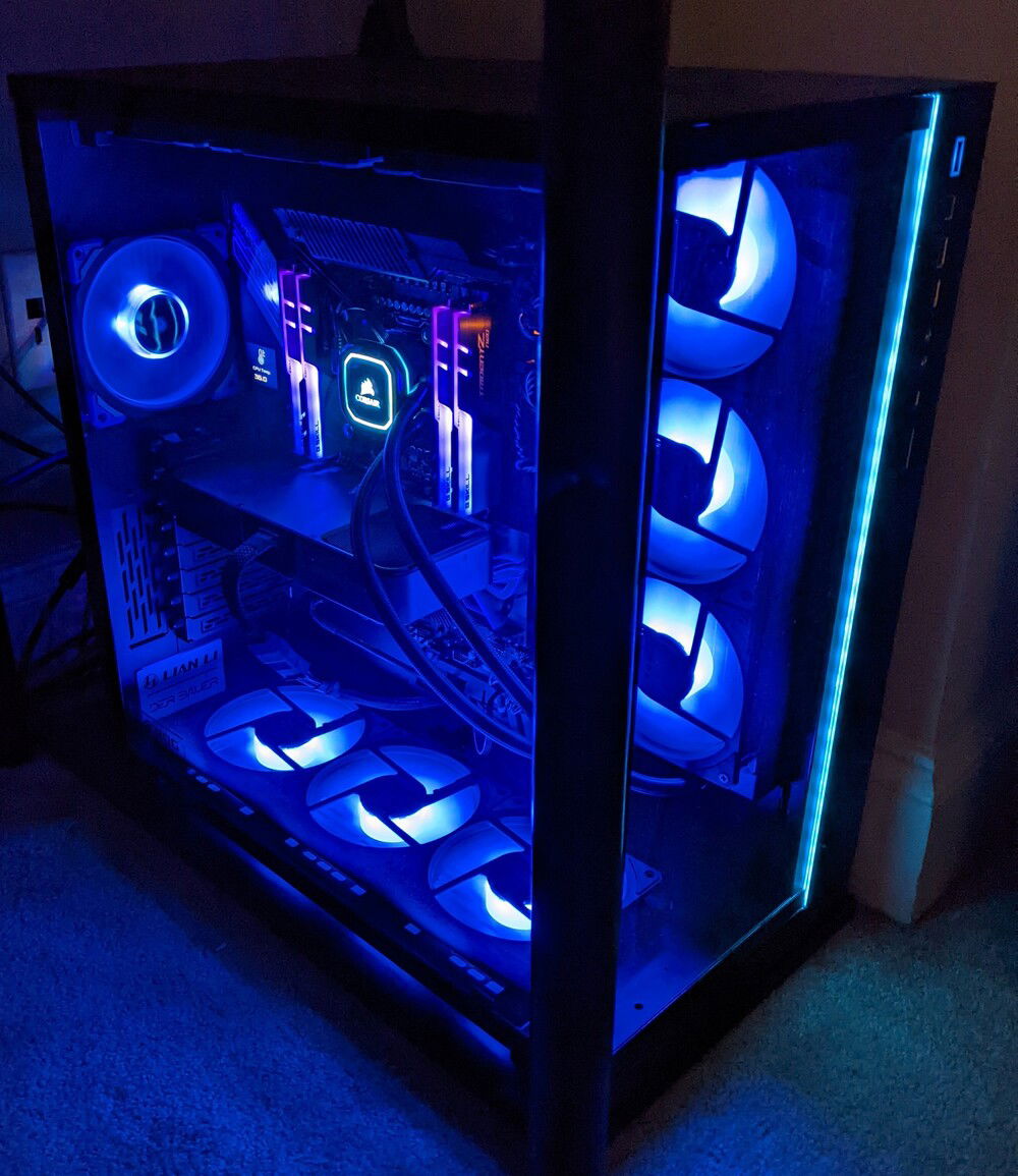 The CPU is overclocked to 4.7GHz. At idle the CPU temp is below 40°C, under heavy load the CPU reaches 70°C. All exhaust fans have the dust filter removed to increase ventilation. This build currently uses 10 fans for cooling: