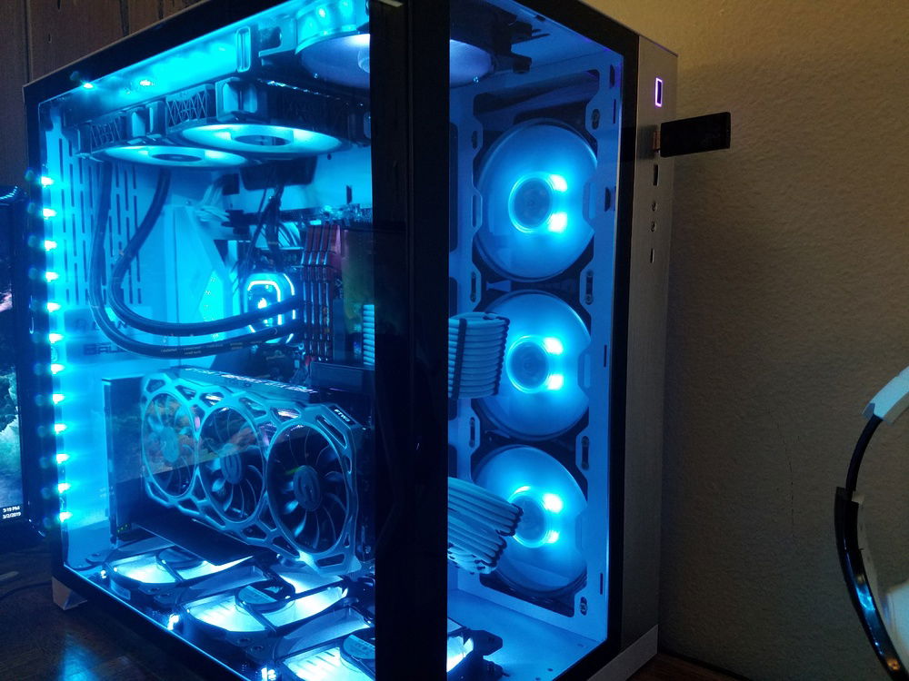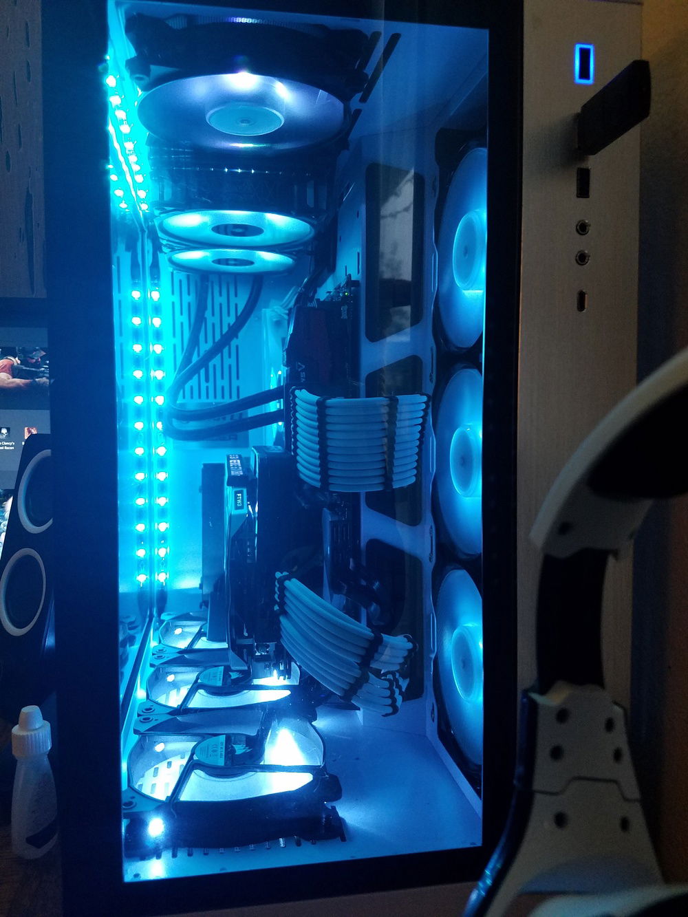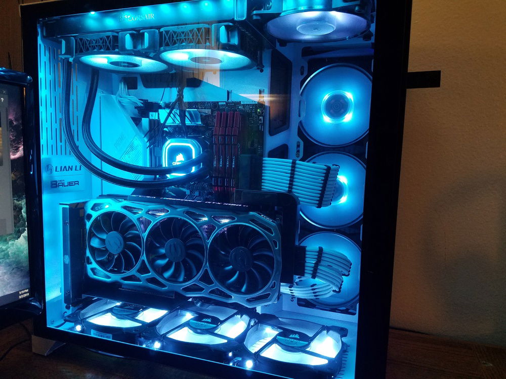 For this build I used the Lian Li pc-011 dynamic. I'm running an asus prime z390-a. My cpu is an I7-8700k overclocked to 5ghz. I'm also running 32gb of Gskill Ripjaws 2666mhz. I have a western digital black 512gb nvme m.2. A Samsung evo 860 500g ssd. 1tb seagate spinning disc. My graphics card is a Evga Gtx 1080ti Ftw 3. My cooler is a Corsair H100 platinum extreme. I have 3 corsair static white fans on the bottom, and 4 coolermaster Air balanced rgb fans.