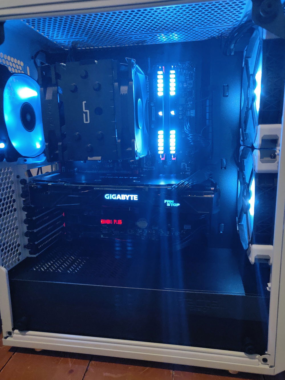 My first AMD Processor. And AMD 2600 clocked to 4.0Ghz at 1.325v. RAM at 3200Mhz with timings adjusted for stability. Cryorig H7 Plus and plenty of White LEDs to light it up without extra strips. The red motherboard LED may throw things off, as it this motherboard was a recent replacement to a B450-A Pro that stopped working. Cable extensions to come!