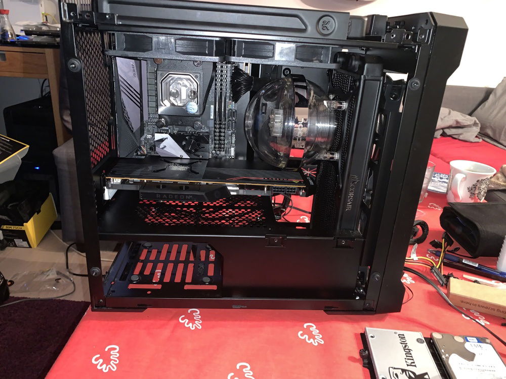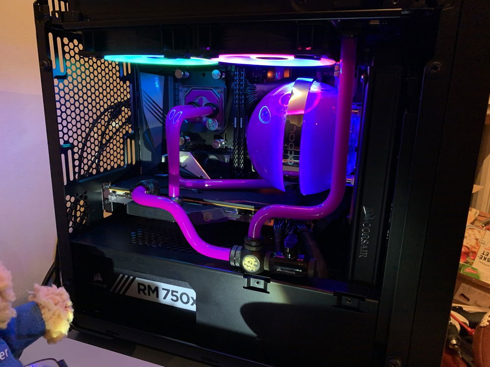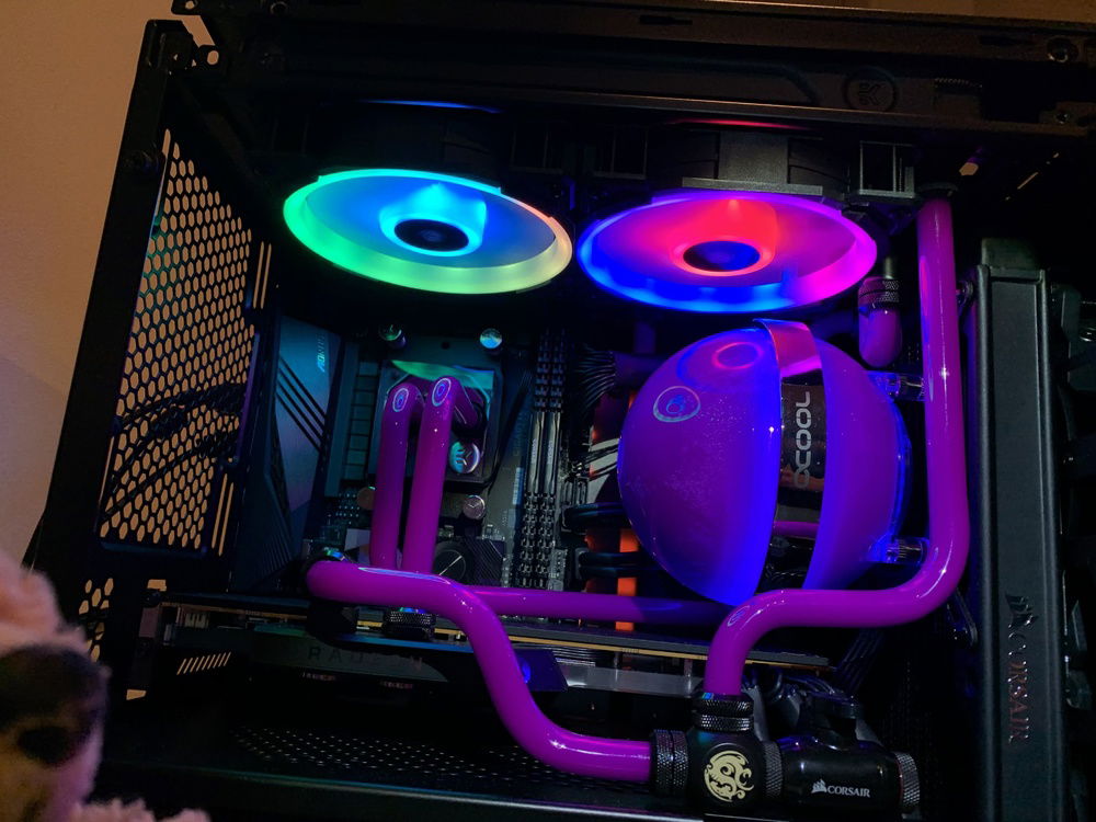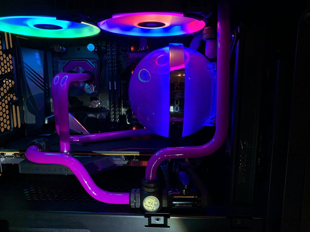 Named Motilene after the fluid everything runs on in We Happy Few. The aestetic and style reminded me of the game after the completion, thus the name. This build revolves around the eisball, and because i chose to use it i had to mod the case. This setup is not possible without making the room for it with the help of a dremel og angel grinder. It was planned to be a easy build, but ended up taking two weeks after getting the parts. The upper radiator is hidden within the upper case panel and barely fits. This was my first time case modding and first time watercooling.